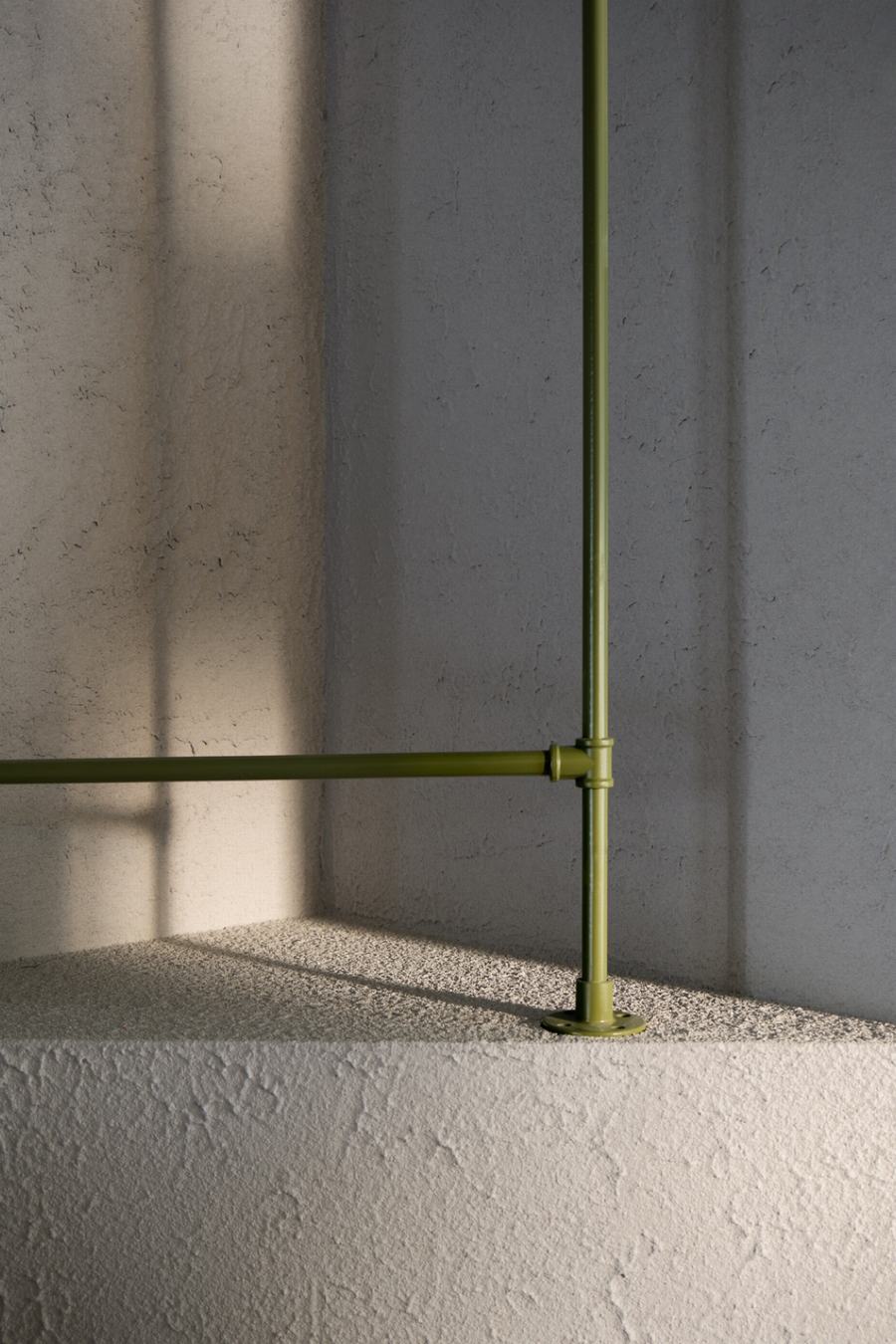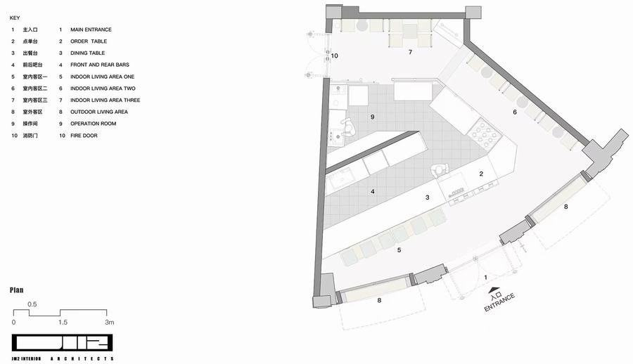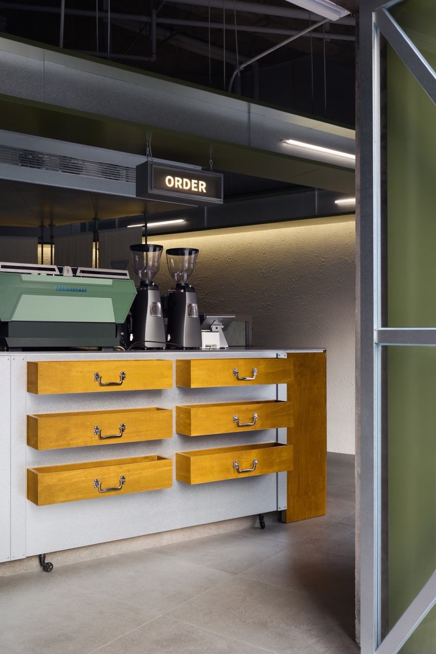 进入室内,你会被水泥墙和珍珠岩砂浆所吸引,它们创造出粗糙的工业质感,与吧台上的木制元素相得益彰。绿色吊顶巧妙地包裹着整个空间,以舒缓的弯曲形状营造出温馨的氛围。透明的原吊顶增加了空间的垂直深度,消除了空间面积有限带来的堵塞感。内部吊顶与吧台对齐,并与外部吊顶平行,形成一条平行的长线,不仅增强了空间的垂直深度,还巧妙地引导了人们从前门到后门的行走路径。