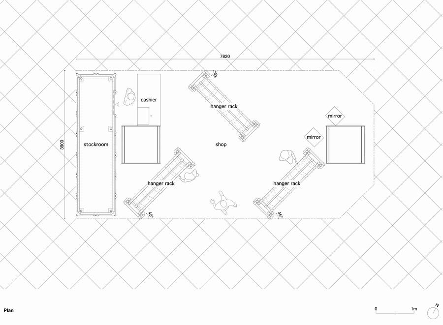 为了鼓励人们留在街上,架子被放置在45度角,以免让人们意识到与路段的边界。同时,车厢内安装了一个仓库,以提高操作效率,减少顾客等待时间。隔断采用安全钢板(建筑护栏),边角用圆形部件连接,而不是使用边角材料,统一整体无边角外观。