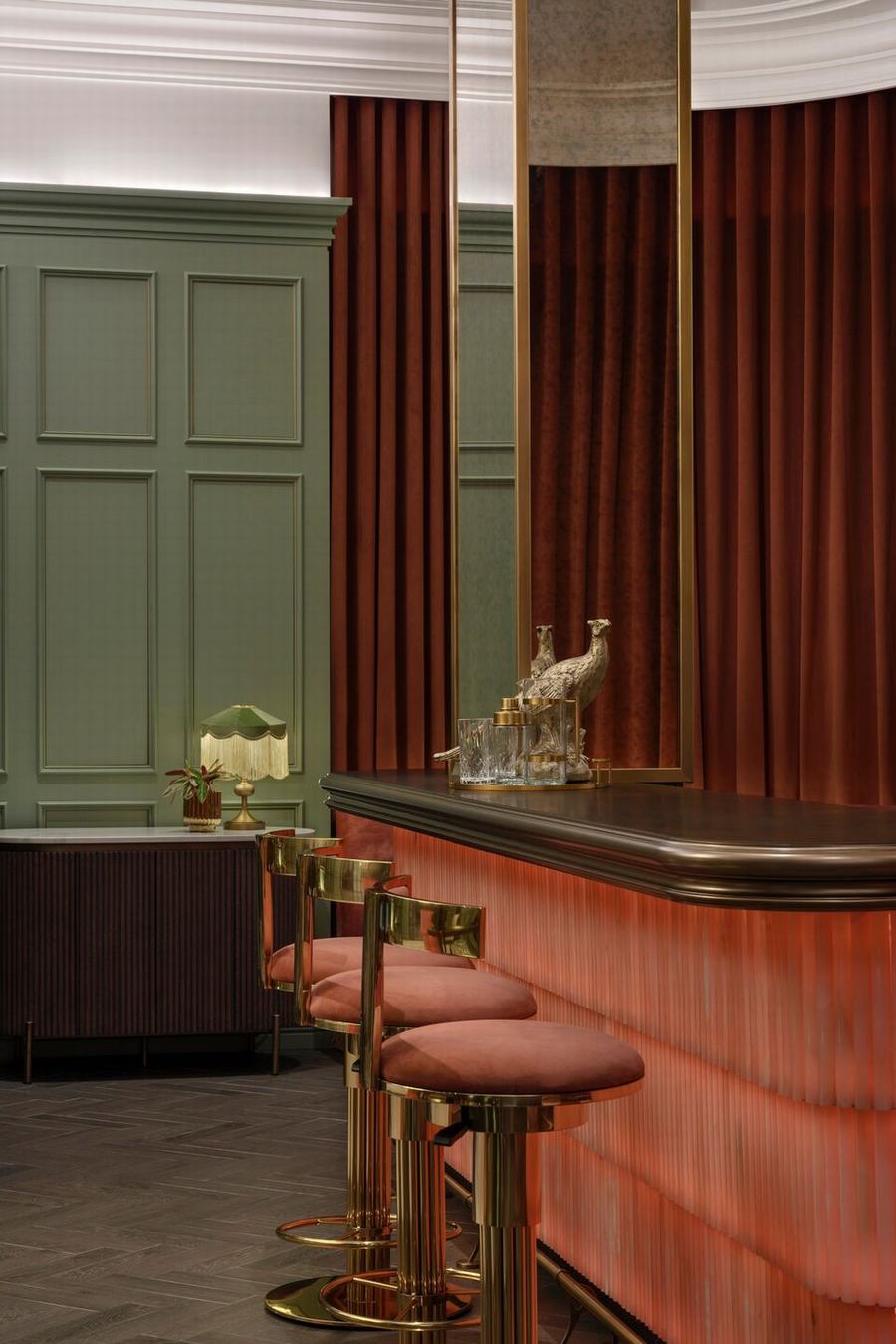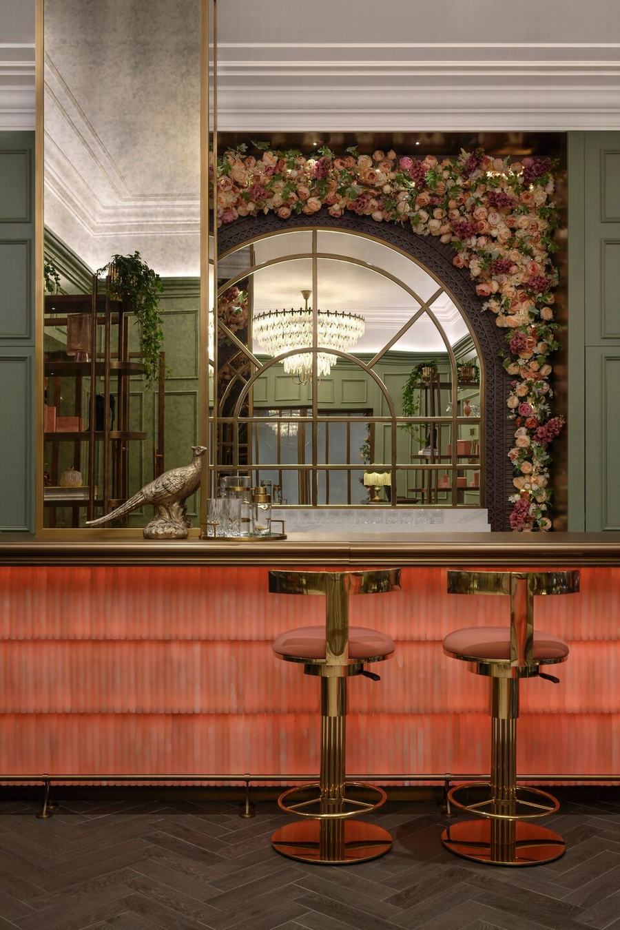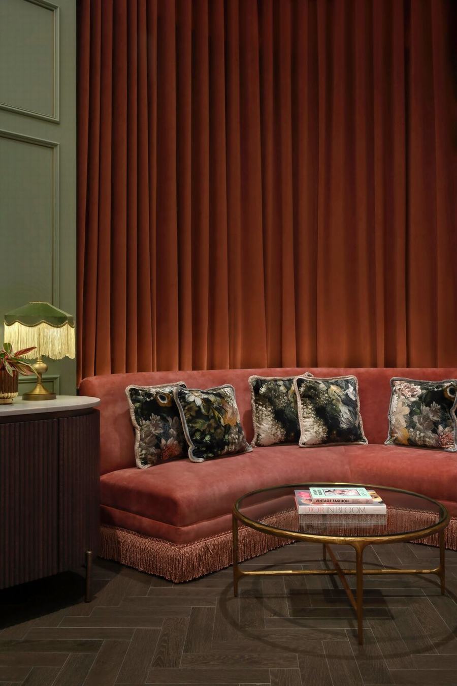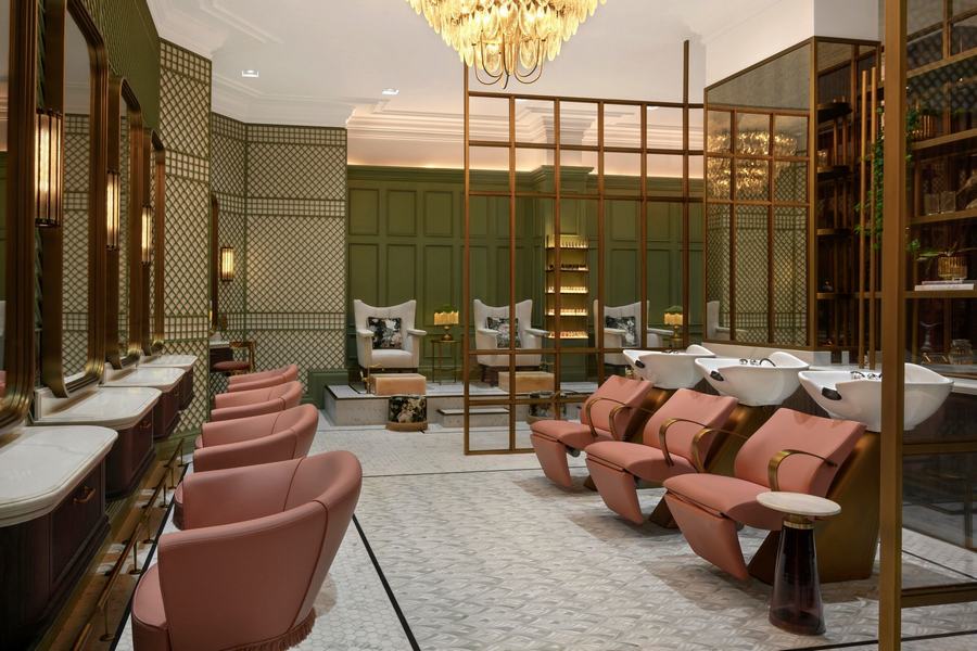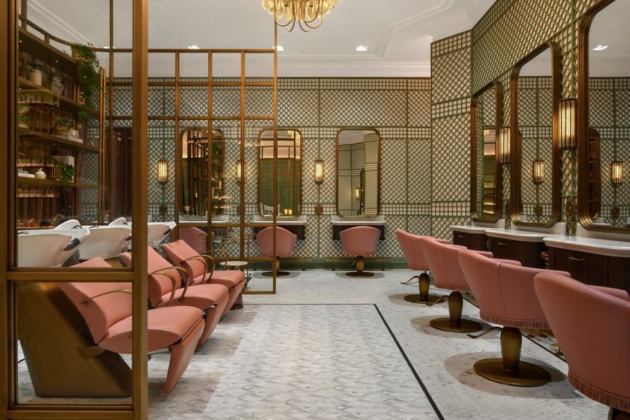 首先,该沙龙以其古怪而引人注目的设计元素而闻名。肋状粉色缟玛瑙包裹着特色指甲条,墙板上采用微妙的青铜金属镶嵌,复古风格的枝形吊灯成为主沙龙的亮点,配以独特的格子墙板背景。贵宾室则通过深黑色镶板和醒目的金色天花板创造了戏剧性的氛围。这些设计元素共同营造出一个独特且引人注目的空间,为客户带来了与众不同的美发美容体验。