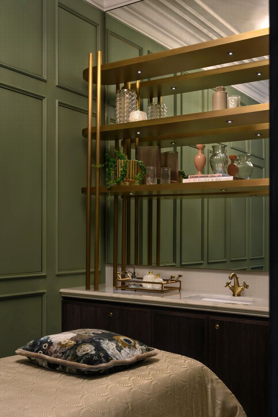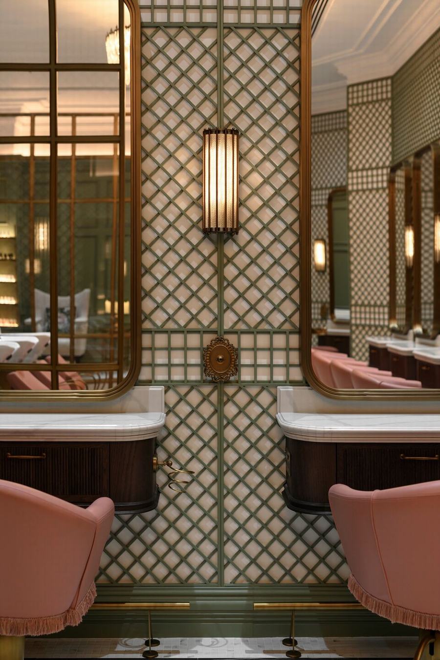 在材料选择方面,设计师们注重细节,确保所有元素都得到合理考虑。他们选择了柔软的绿色镶板和新鲜的马赛克大理石地板,与肋状粉色缟玛瑙、青铜金属饰面和腮红织物中微妙的粉红色石材形成温暖的对比。这种材料选择不仅保持了简洁而不杂乱的调色板,还为沙龙营造出舒适和愉悦的氛围。
