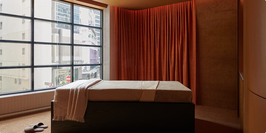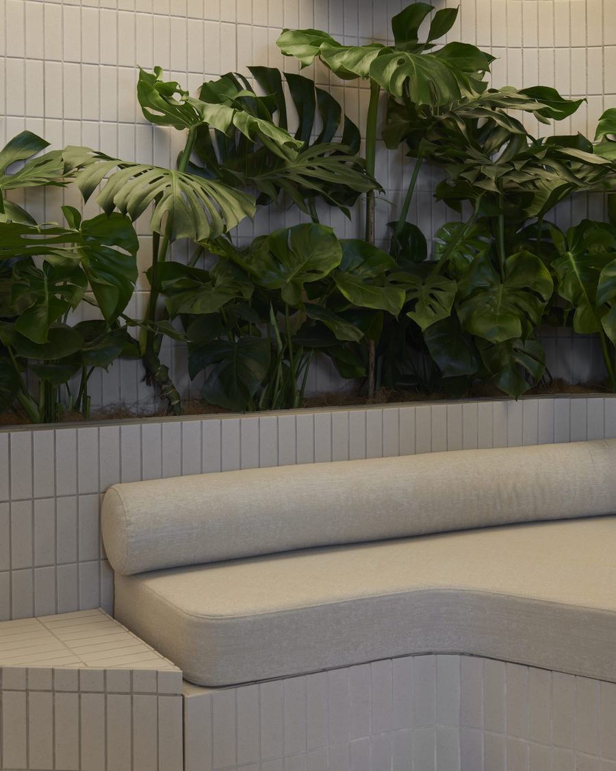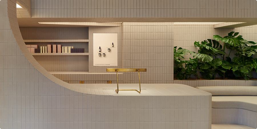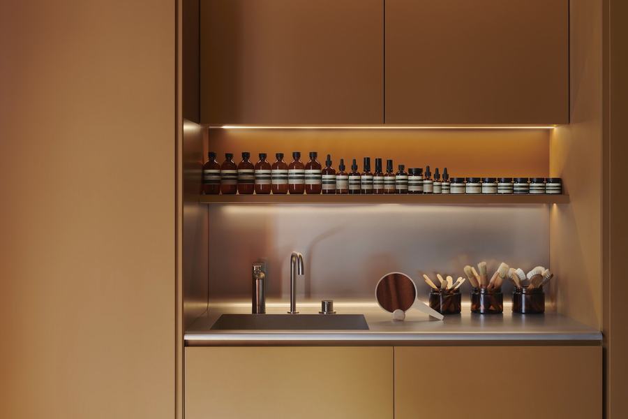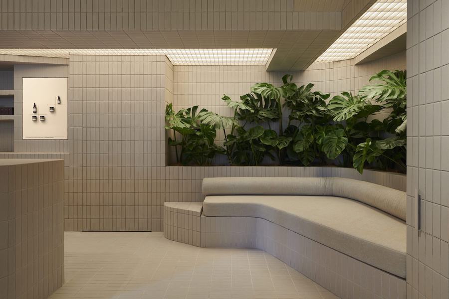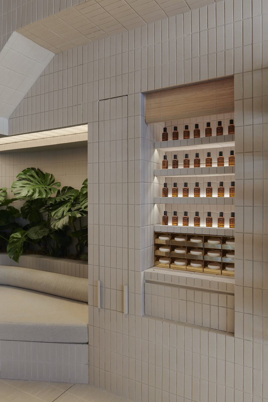 在室内,公用洗手池和种植盆巧妙地融入设计中,营造出舒适而宜人的氛围。私人洗涤区则提供了个性化的体验,让顾客能够享受到更加私密的护理服务。面部预约套房采用柔和的照明和赤陶色调饰面,营造出放松的氛围。