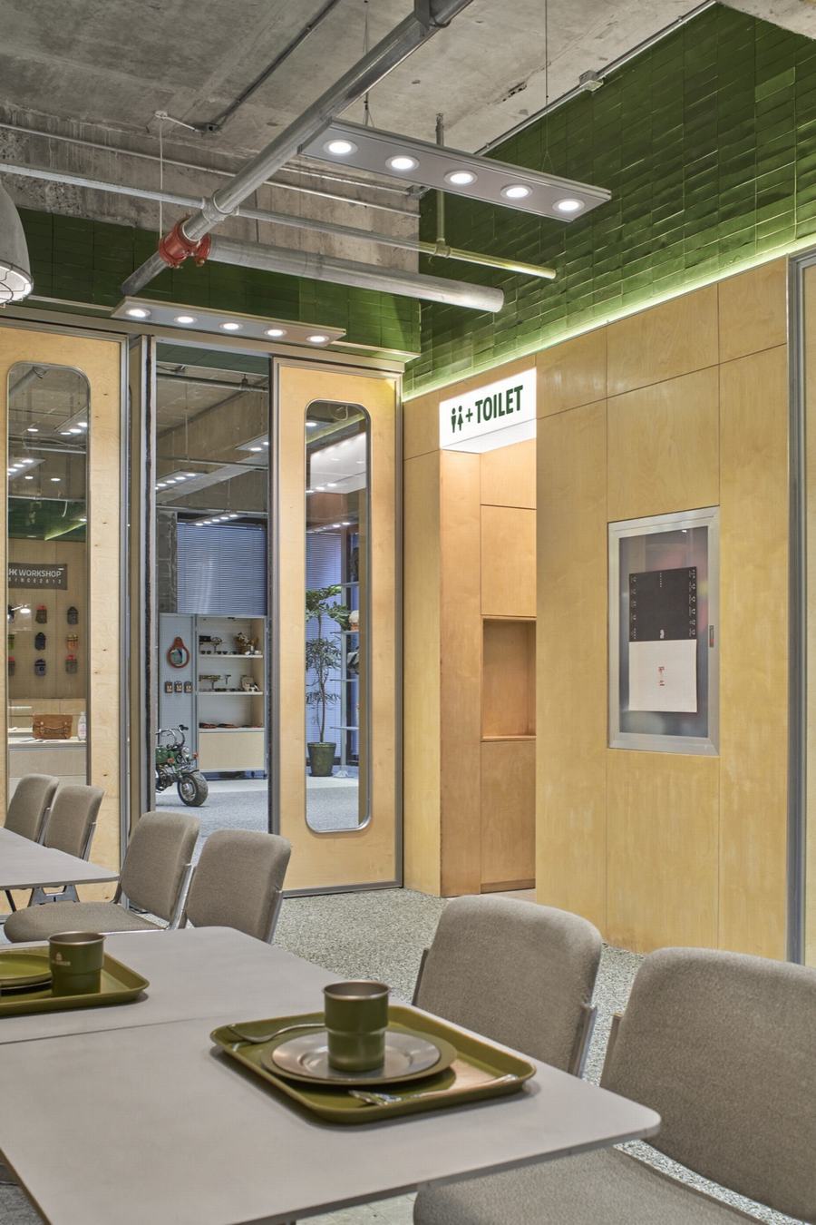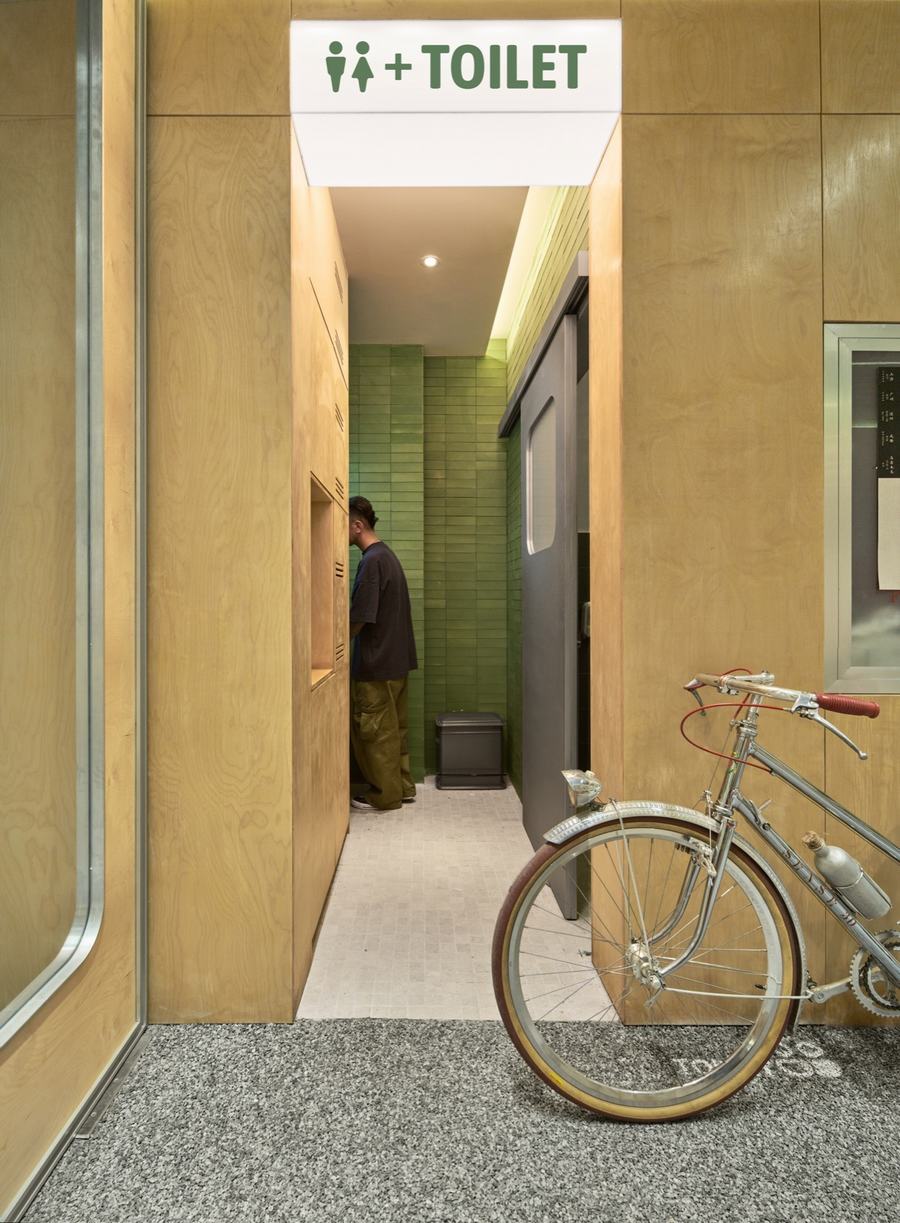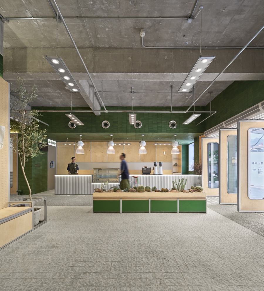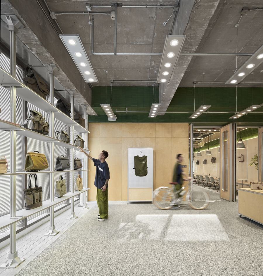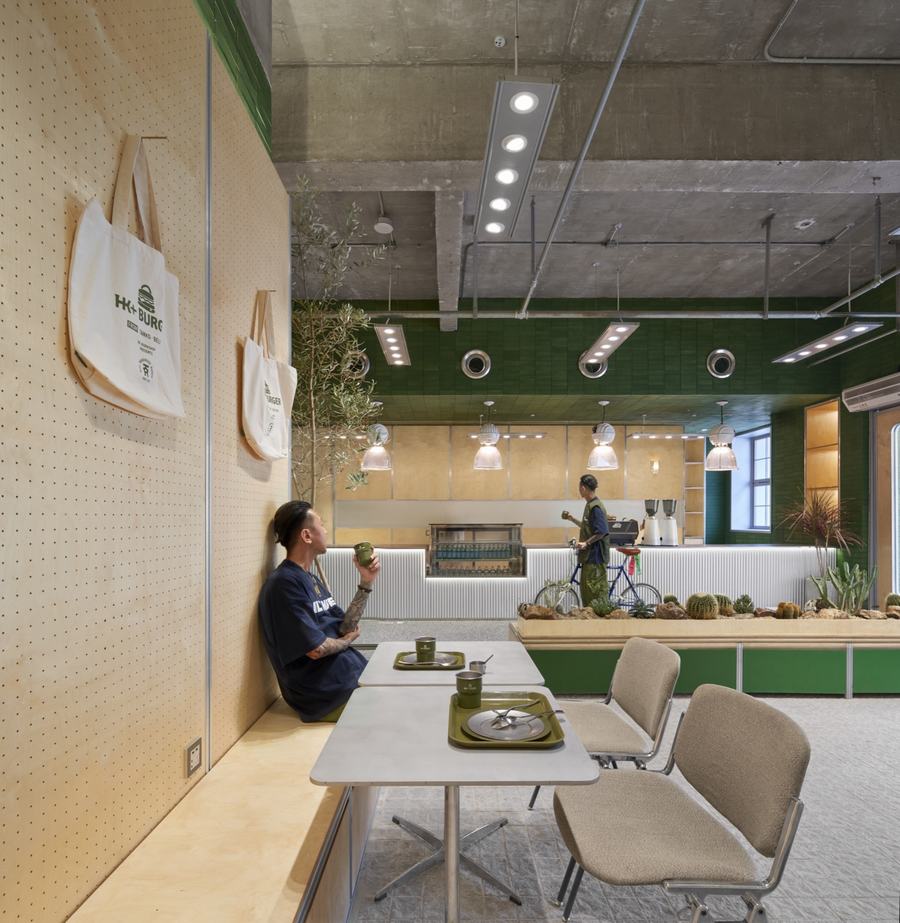 在室内设计方面,HK+ BURGER秉持着户外友好、露营友好和骑行友好的原则,给顾客创造了一种慢下来的节奏。采用桦木和铝型材作为主要材料,定制的绿色陶瓦营造出街道的松散感,与社区氛围融为一体。穿孔的桦木板墙面展示着各种背包产品,而地板上的黑色粘石骑行线条与室外柏油路面相呼应,增加了骑行者进入店内的舒适度。而绿色植物和定制的座椅组合,则提供了不同的休息状态,让顾客可以在舒适的环境中放松身心。