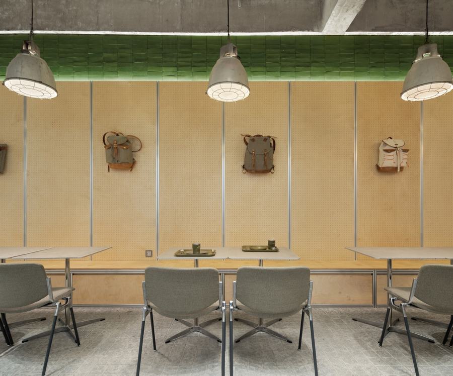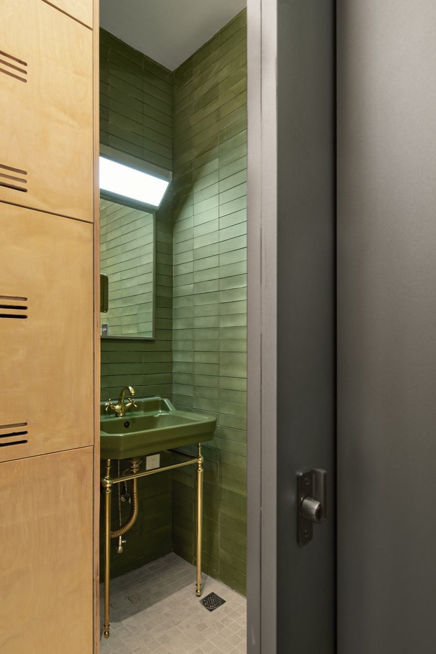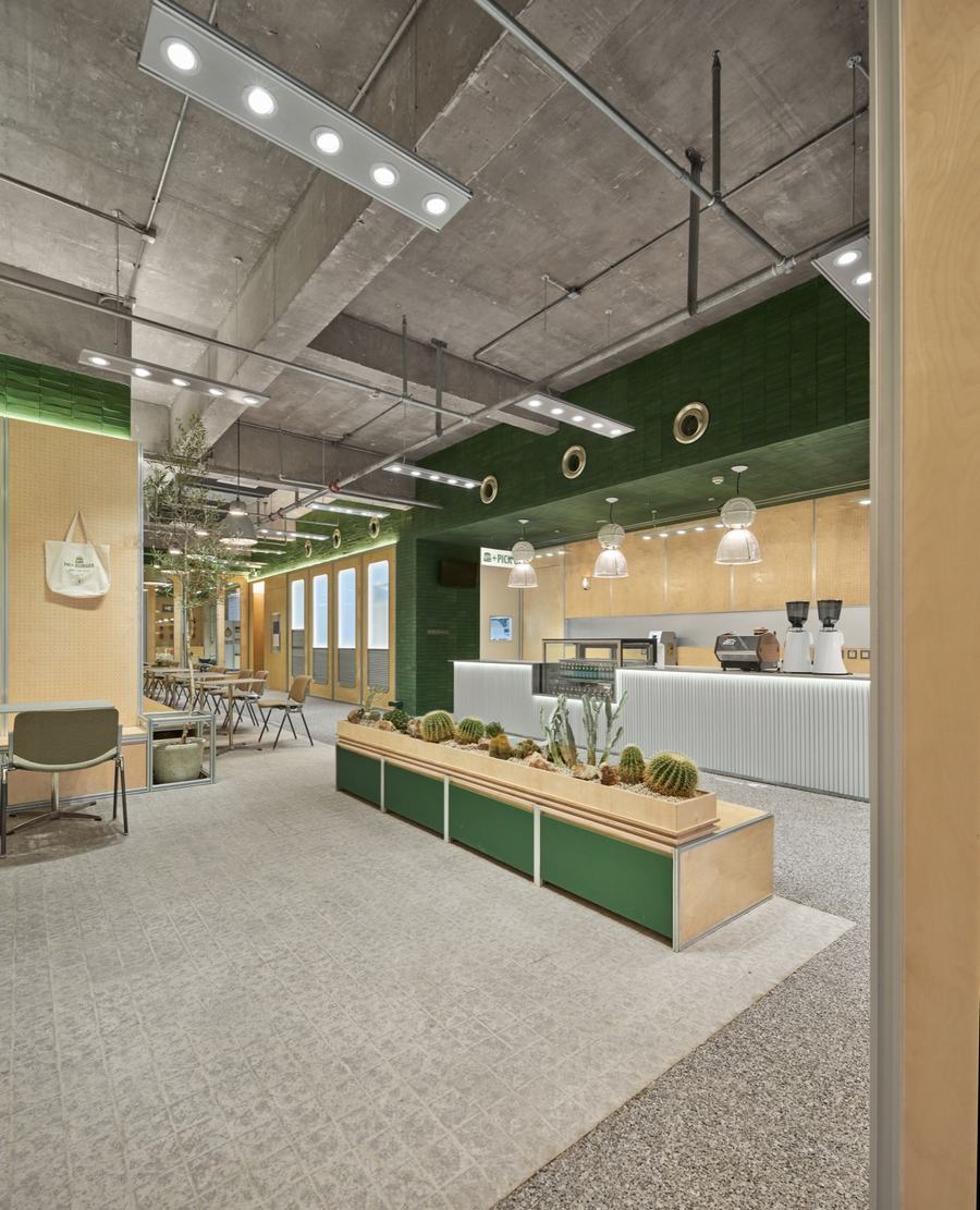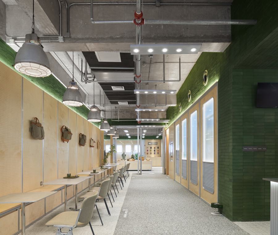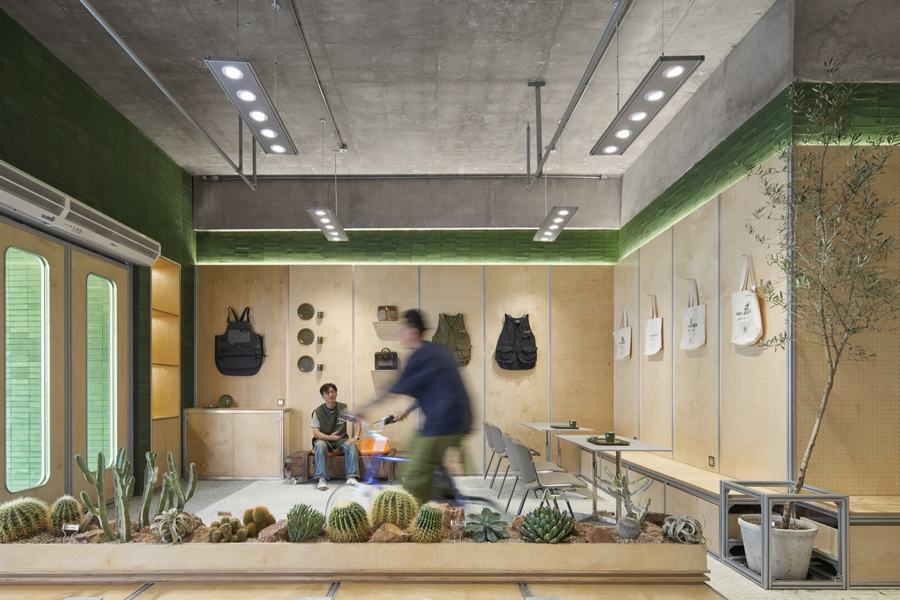 在室内设计方面,HK+ BURGER秉持着户外友好、露营友好和骑行友好的原则,给顾客创造了一种慢下来的节奏。采用桦木和铝型材作为主要材料,定制的绿色陶瓦营造出街道的松散感,与社区氛围融为一体。穿孔的桦木板墙面展示着各种背包产品,而地板上的黑色粘石骑行线条与室外柏油路面相呼应,增加了骑行者进入店内的舒适度。而绿色植物和定制的座椅组合,则提供了不同的休息状态,让顾客可以在舒适的环境中放松身心。