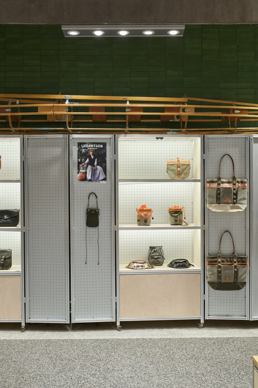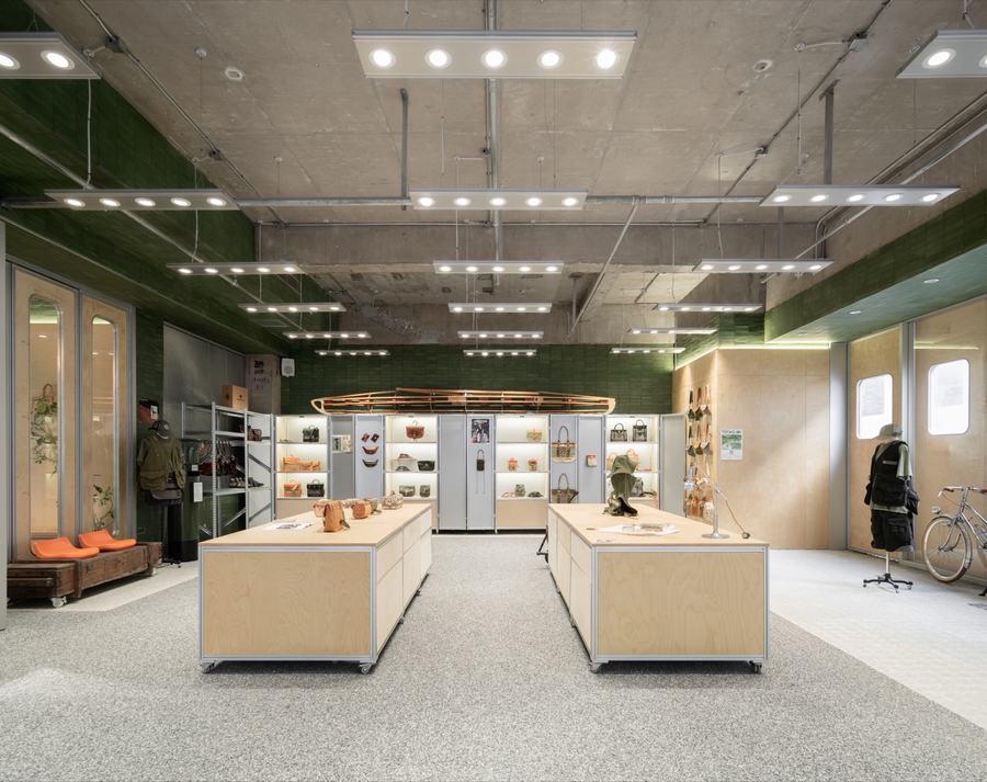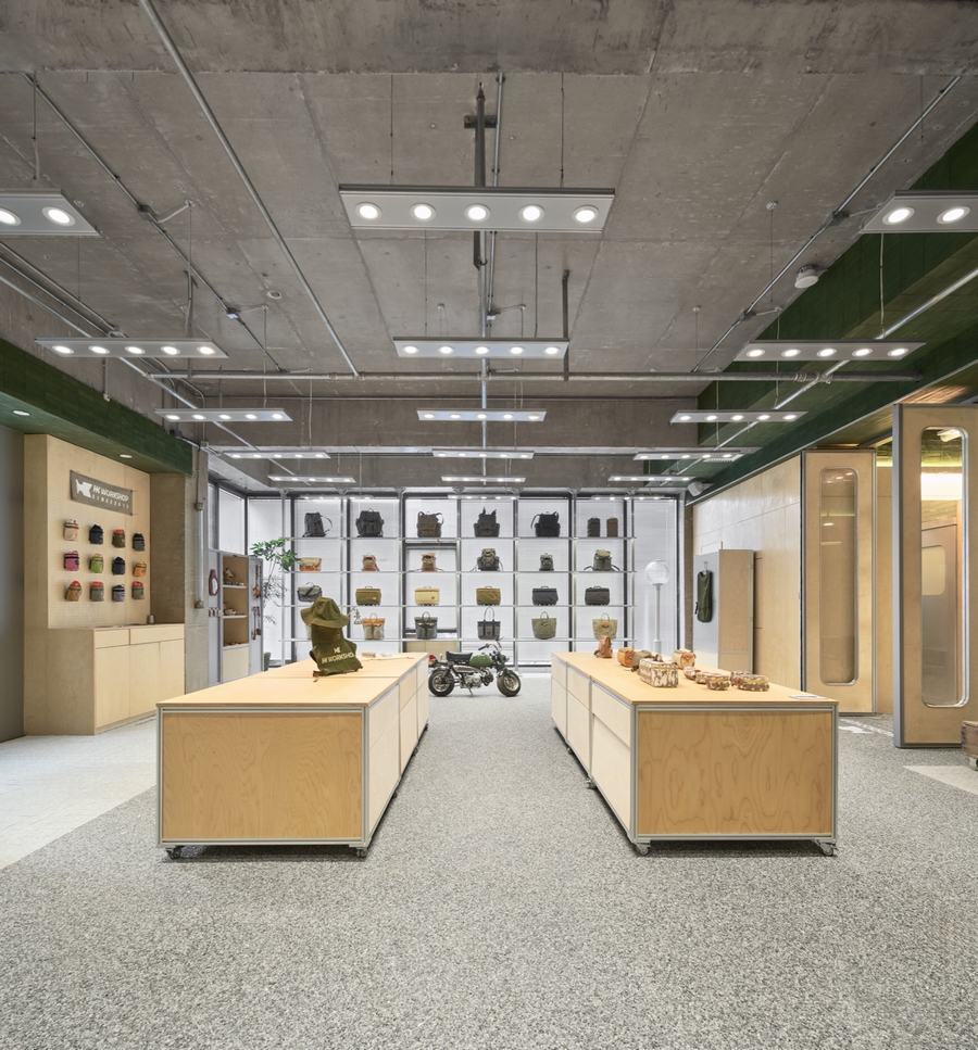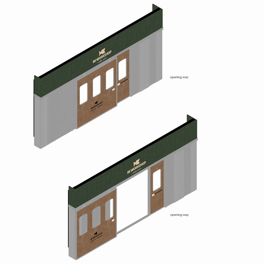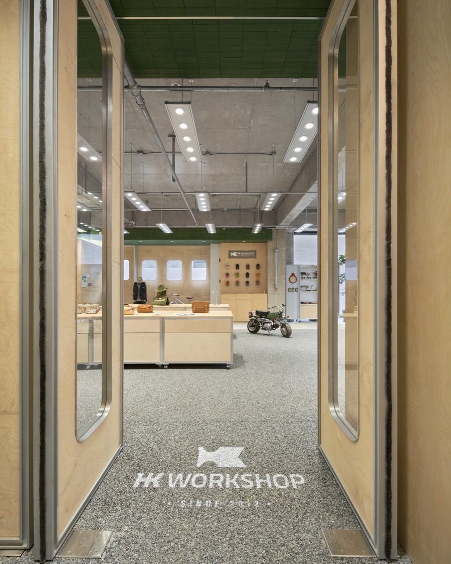 HK WORKSHOP作为知名手工皮具品牌,其独立入口被设计成一个具有强烈形式感的谷仓门。闭店时,入口是一个完整的外立面,而当商店开业时,大尺寸的谷仓门会被拉开,让顾客可以清楚地看到展示橱窗里的产品。这样的设计不仅增加了商店的视觉吸引力,也为顾客带来了愉悦的购物体验。