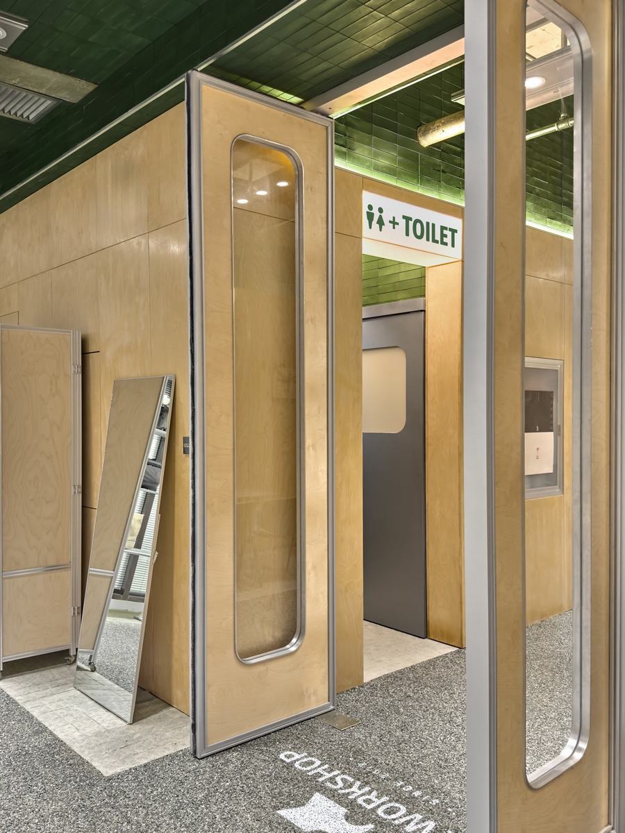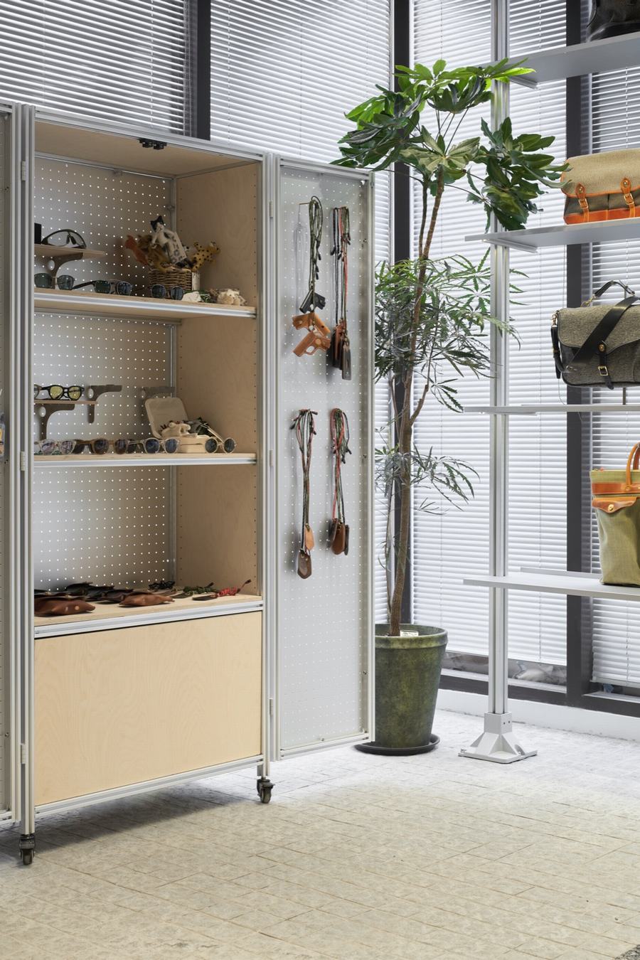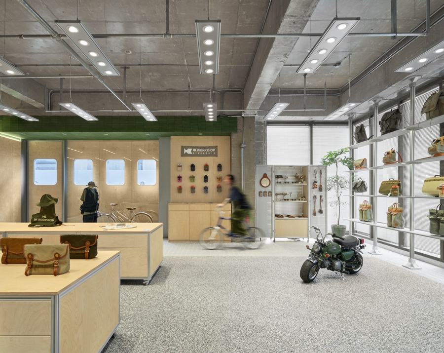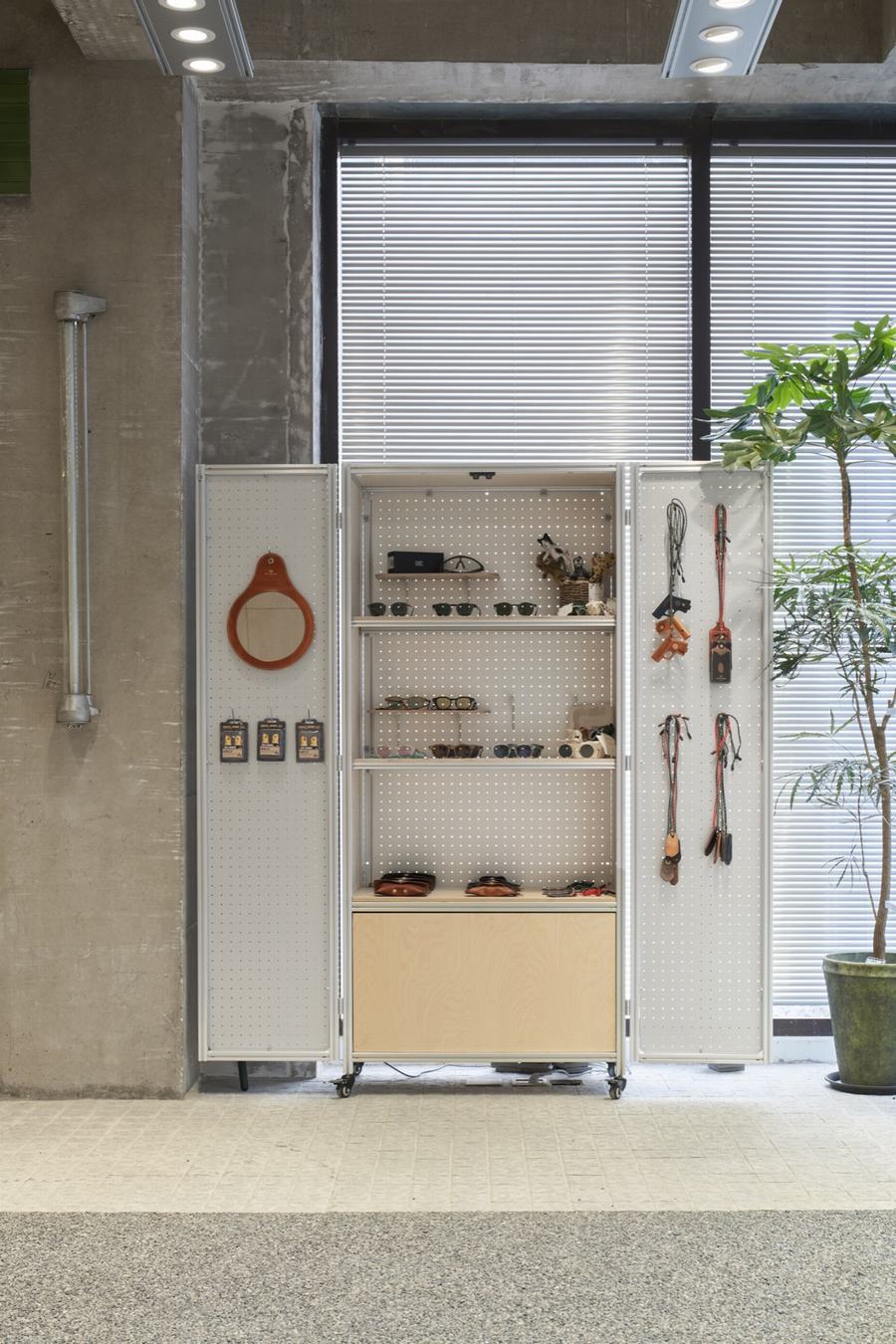 HK WORKSHOP作为知名手工皮具品牌,其独立入口被设计成一个具有强烈形式感的谷仓门。闭店时,入口是一个完整的外立面,而当商店开业时,大尺寸的谷仓门会被拉开,让顾客可以清楚地看到展示橱窗里的产品。这样的设计不仅增加了商店的视觉吸引力,也为顾客带来了愉悦的购物体验。