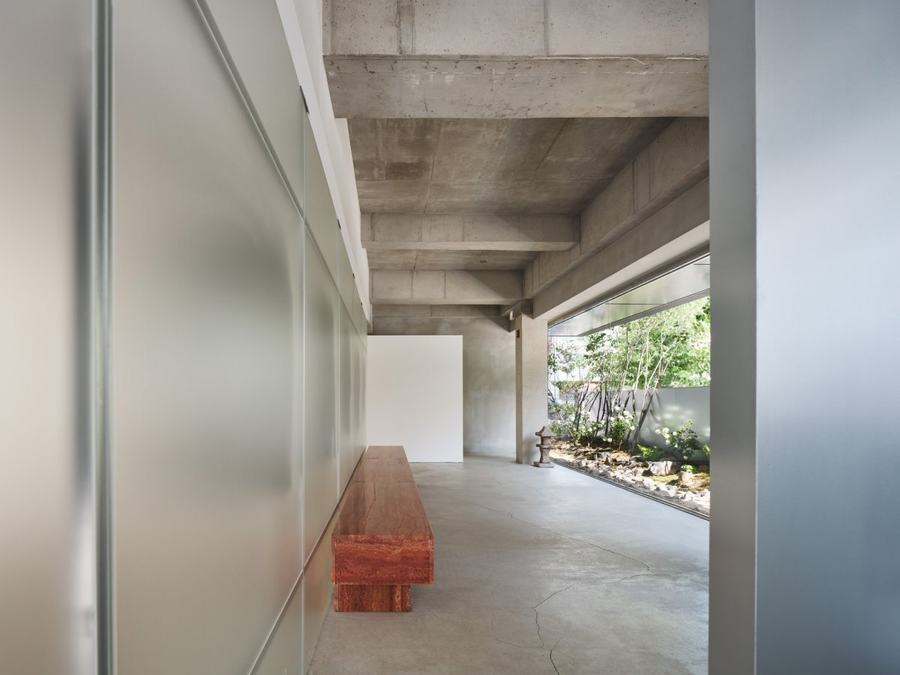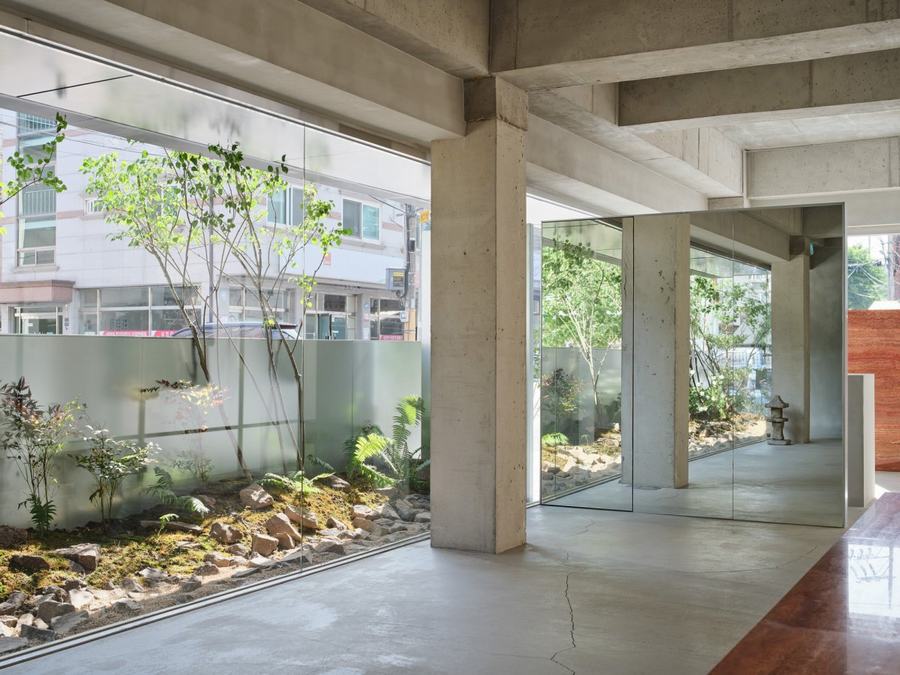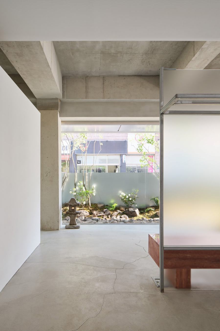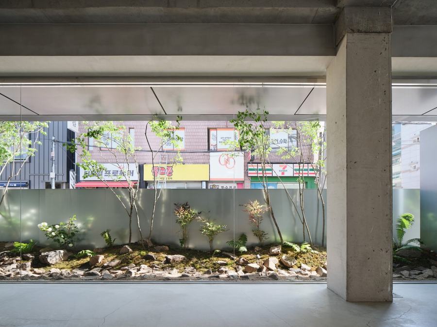 在室内设置了一片景观空间,这个空间可以从屋檐下向外扩展视野,让客户感到耳目一新。我们认为,如果我们能够在室内种植和照顾植物,这对客户来说可能是一个休息时刻,会让他们感到愉悦和放松。我们还选择了一些季节变化的植物,让室内空间看起来更加丰富多彩。在景观空间之外,我们设置了齐肩高的墙作为植物的背景,过滤掉令人眼花缭乱的外部景观。从外部看,高于墙的树木会随着自然的环绕而显得更长,这引起了客户的好奇心。