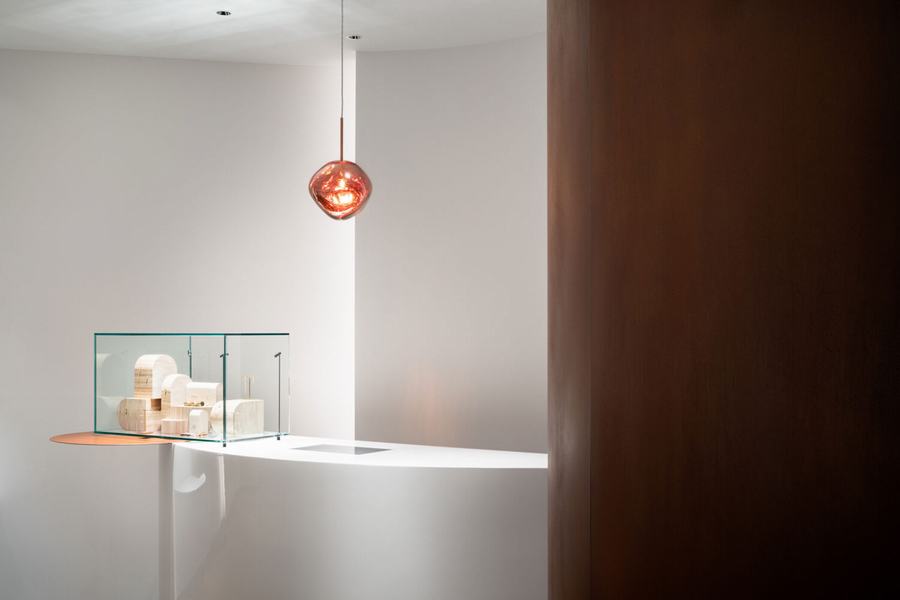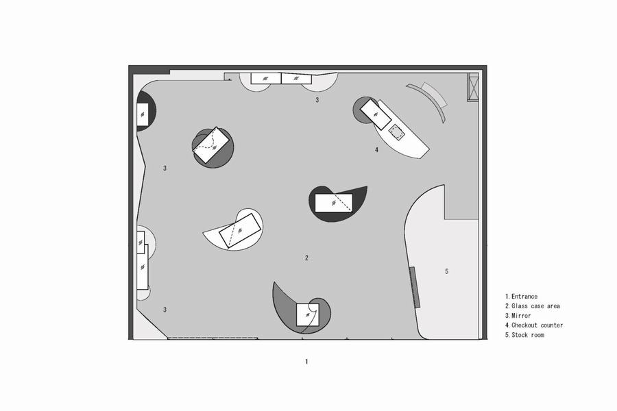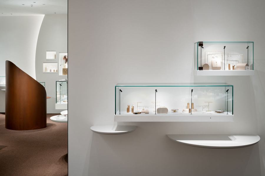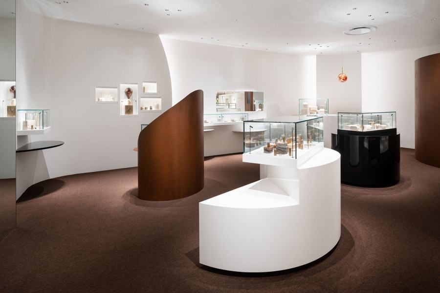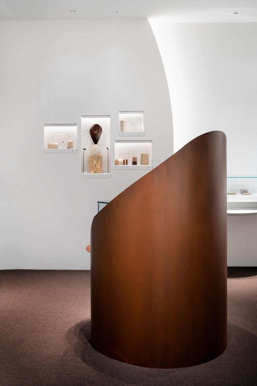 首先,店铺内采用了耐候钢作为装饰元素,这些灵感源自贝壳的设计将为整个店铺增添一份自然的灵动之美。中央陈设器和黑白陈设器错落有致地展示着Hirotaka的商品,而冷天钢纹理的运用则在视觉上为空间增添了一份神秘感。此外,门型外立面由侧壁编织而成,利用圆弧上的缝隙透出间接照明的光,为店铺增添了一份现代感与艺术感。