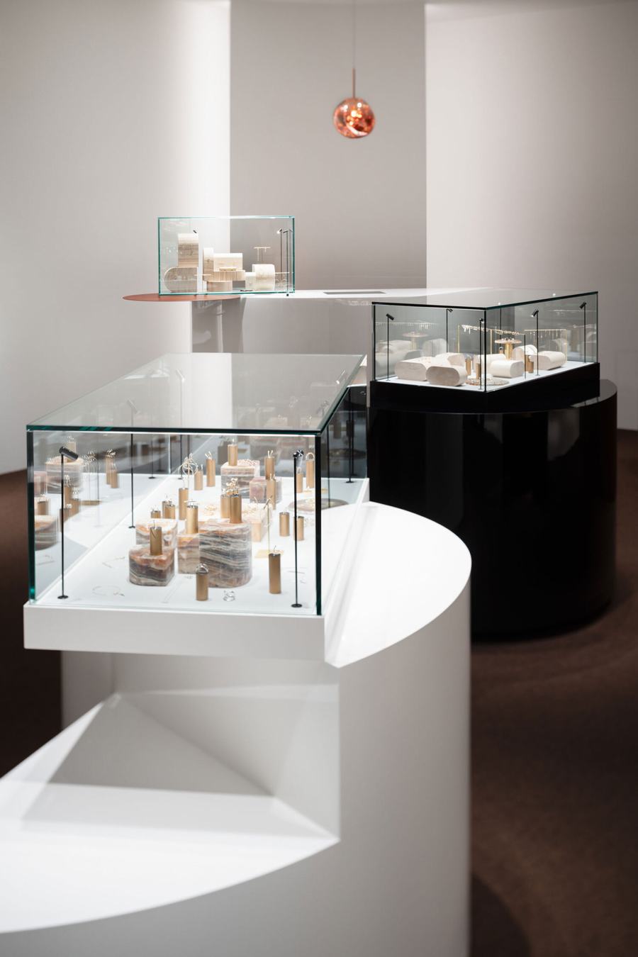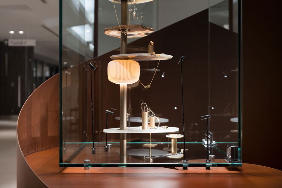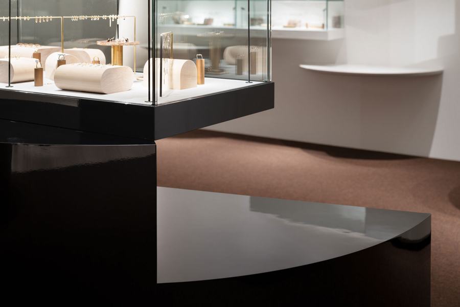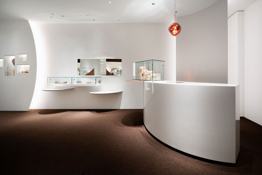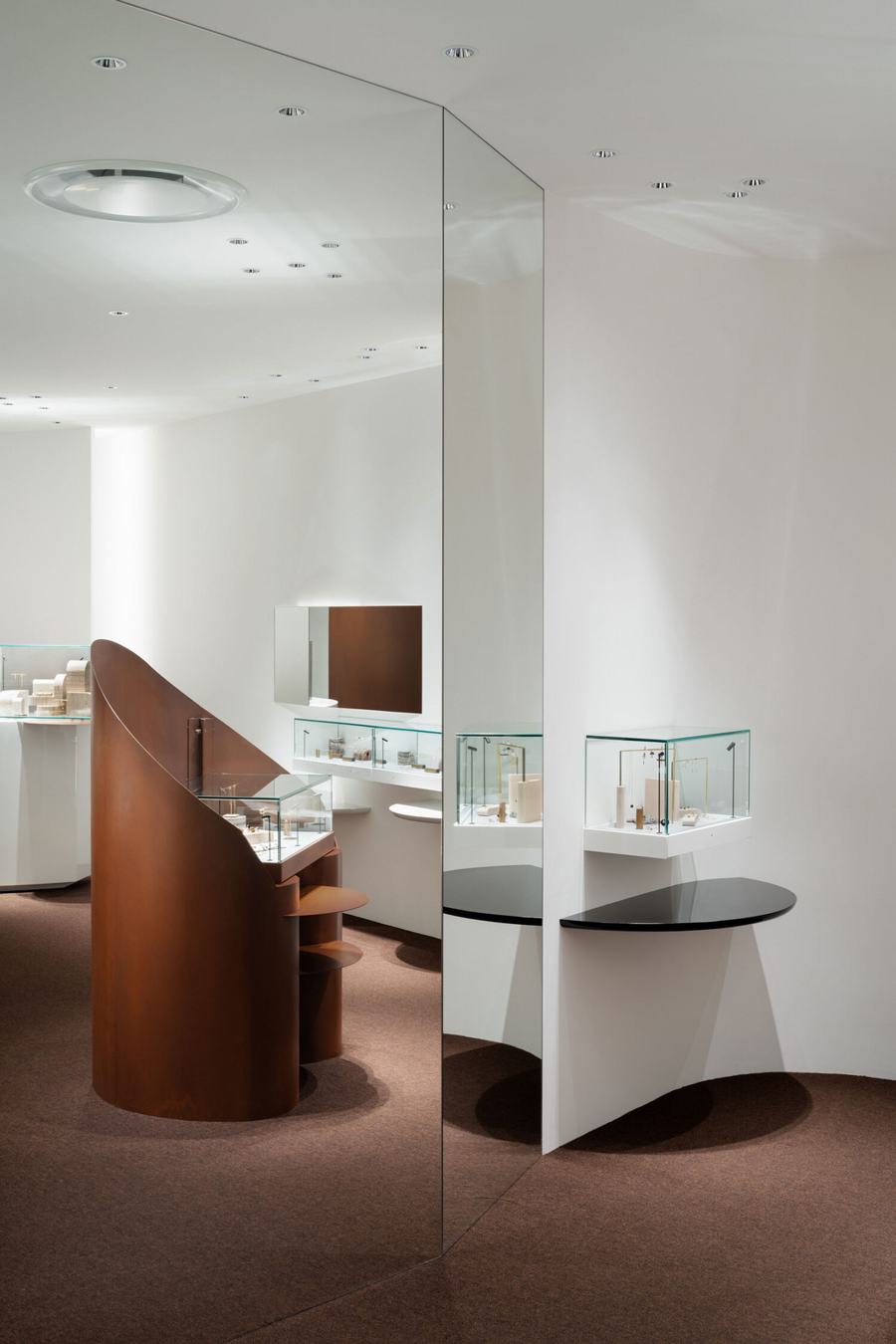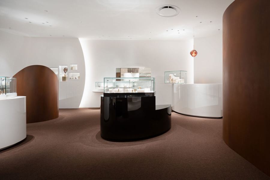 在空间隔断方面,Hirotaka的设计师没有采用传统的柱子,而是通过聚光灯光的运用将商品进行烘托,营造出一种沉浸式购物体验。镜子的巧妙摆放使得空间扩大,与暗色沉稳的羊绒地毯相得益彰。周边环境以白色明亮为主,营造出休息室一样的舒适氛围,让顾客可以尽情享受购物的乐趣。