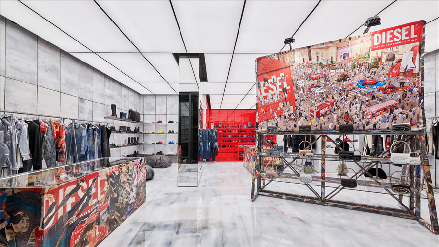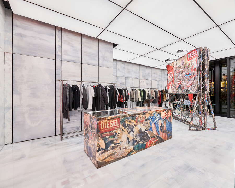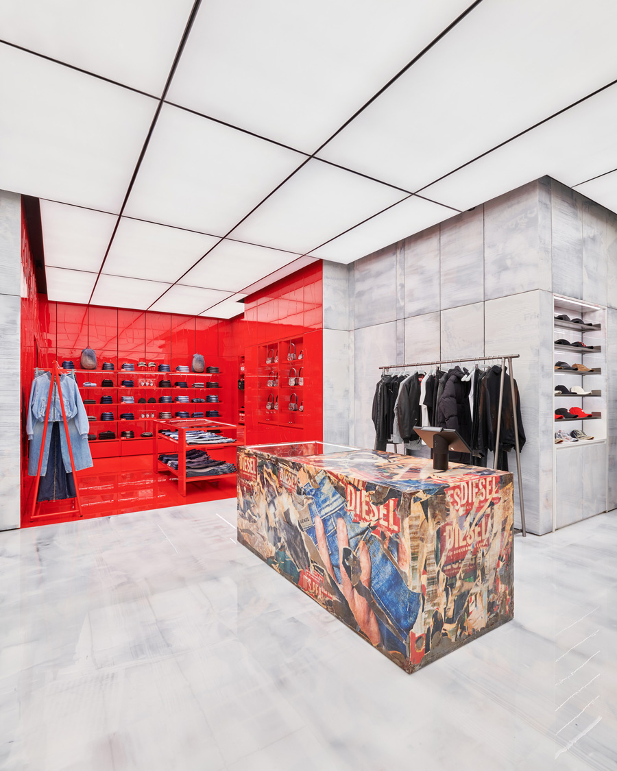 新设计的零售空间充分体现了DIESEL对青年文化的理解和尊重,利用树脂海报墙壁和地板、工业风格广告牌等装饰元素,营造出独特的氛围。这种设计不仅展现了比利时建筑师的独特视角,也展示了青年文化与时尚品牌融合的全新可能性。