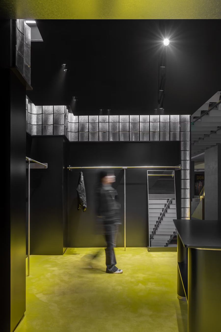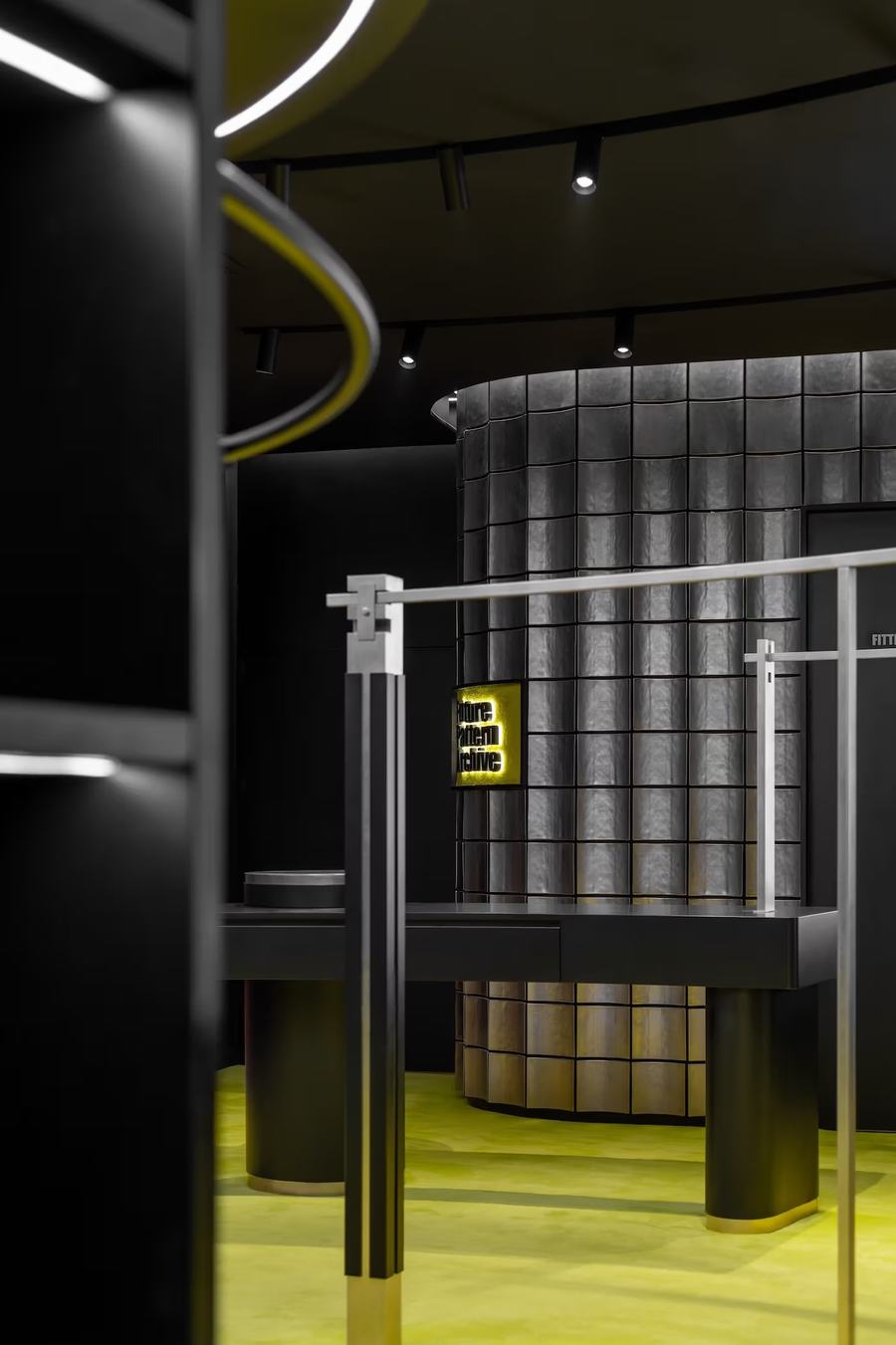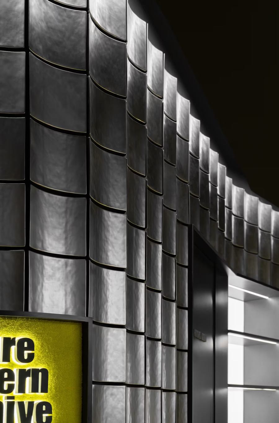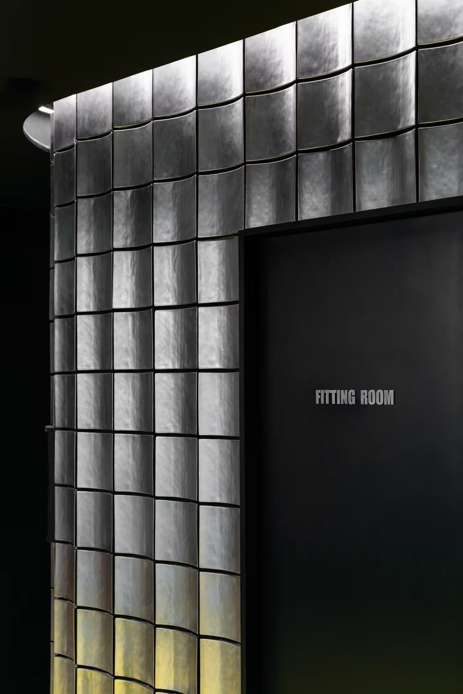 一进入店铺,顾客们会被银色砖块所包围的外立面所吸引。这些银色砖块散发着微弱的亮光,在不同的角度和时段下闪烁着,给整个空间增添了一份神秘感。这种银色砖块的设计灵感来自于古老的城墙,带来了一种肃穆的稳重感,就像是立在城里的青灰城墙一样。