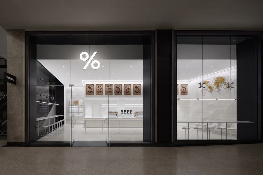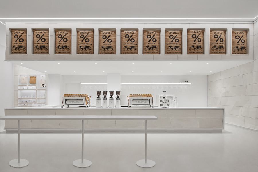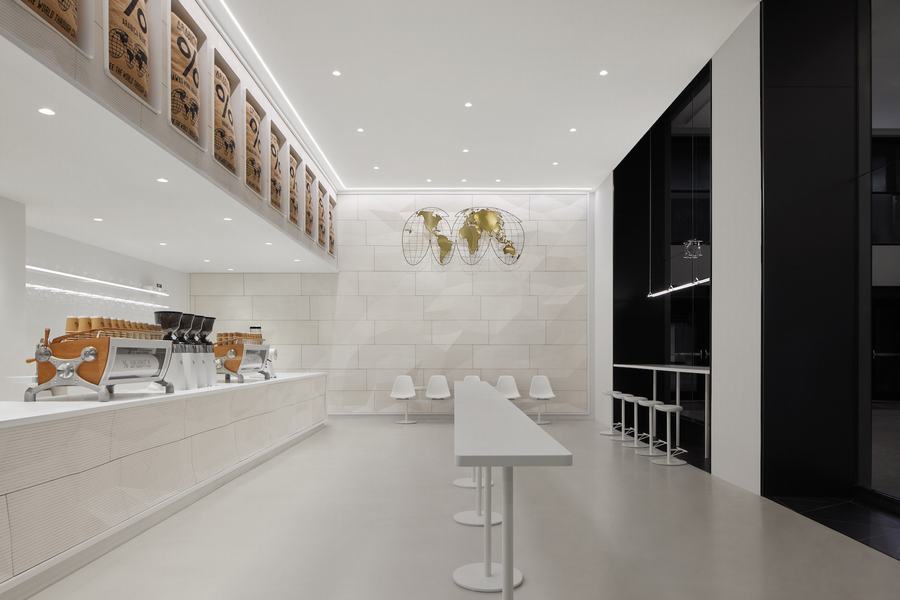 阿拉比卡旗舰店还采用了地球仪装饰元素,这一元素不仅展示了品牌创始人的愿景,也为店内增添了一丝探索的氛围。白色背景色为整个空间提供了清新明亮的感觉,并使得店内的设计焦点更加突出。商店正面的黑色装饰与现代设计语言相得益彰,为顾客带来时尚感觉的同时,也与车站的整体风格产生了和谐的共鸣。另外,商店周围的装饰性咖啡袋巧妙地放置,使得整个空间更加有层次感和趣味性。