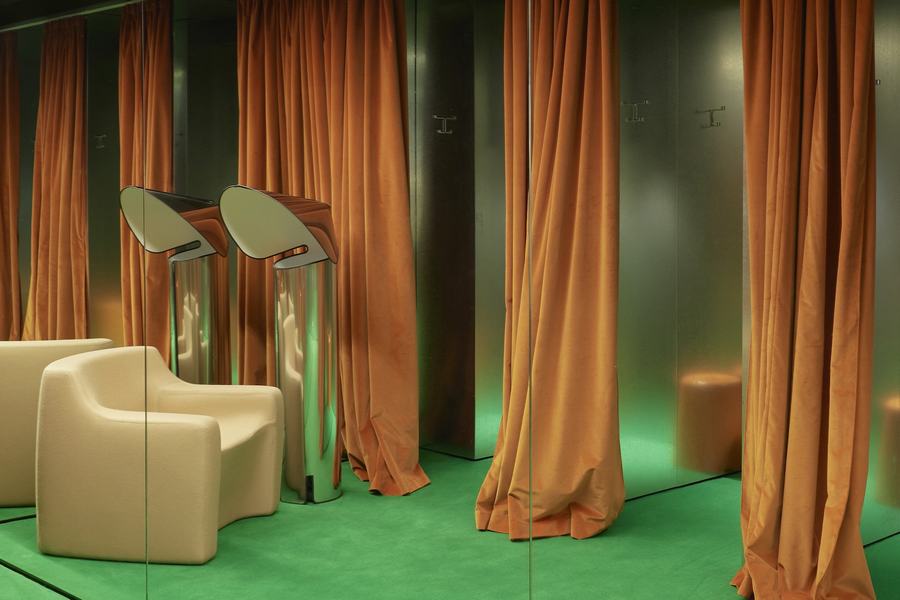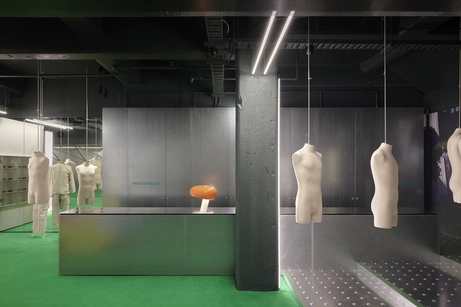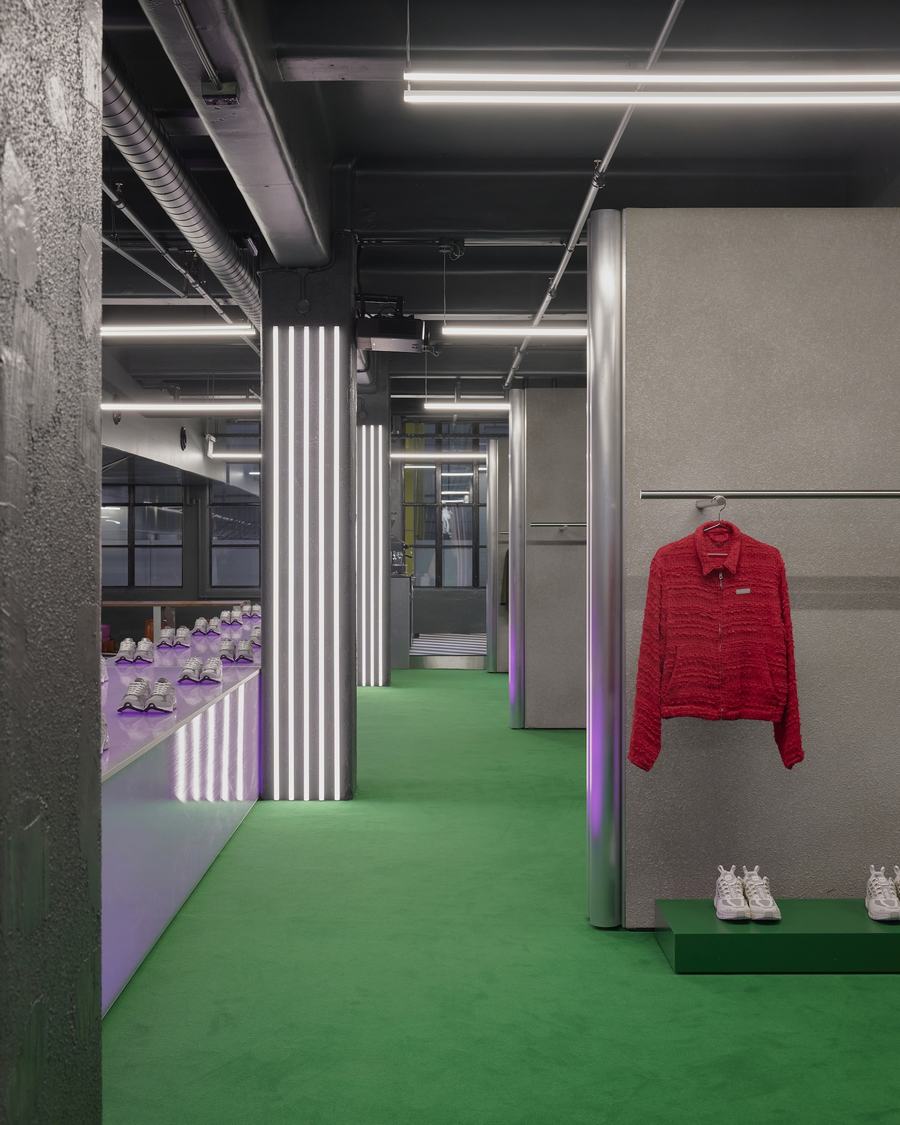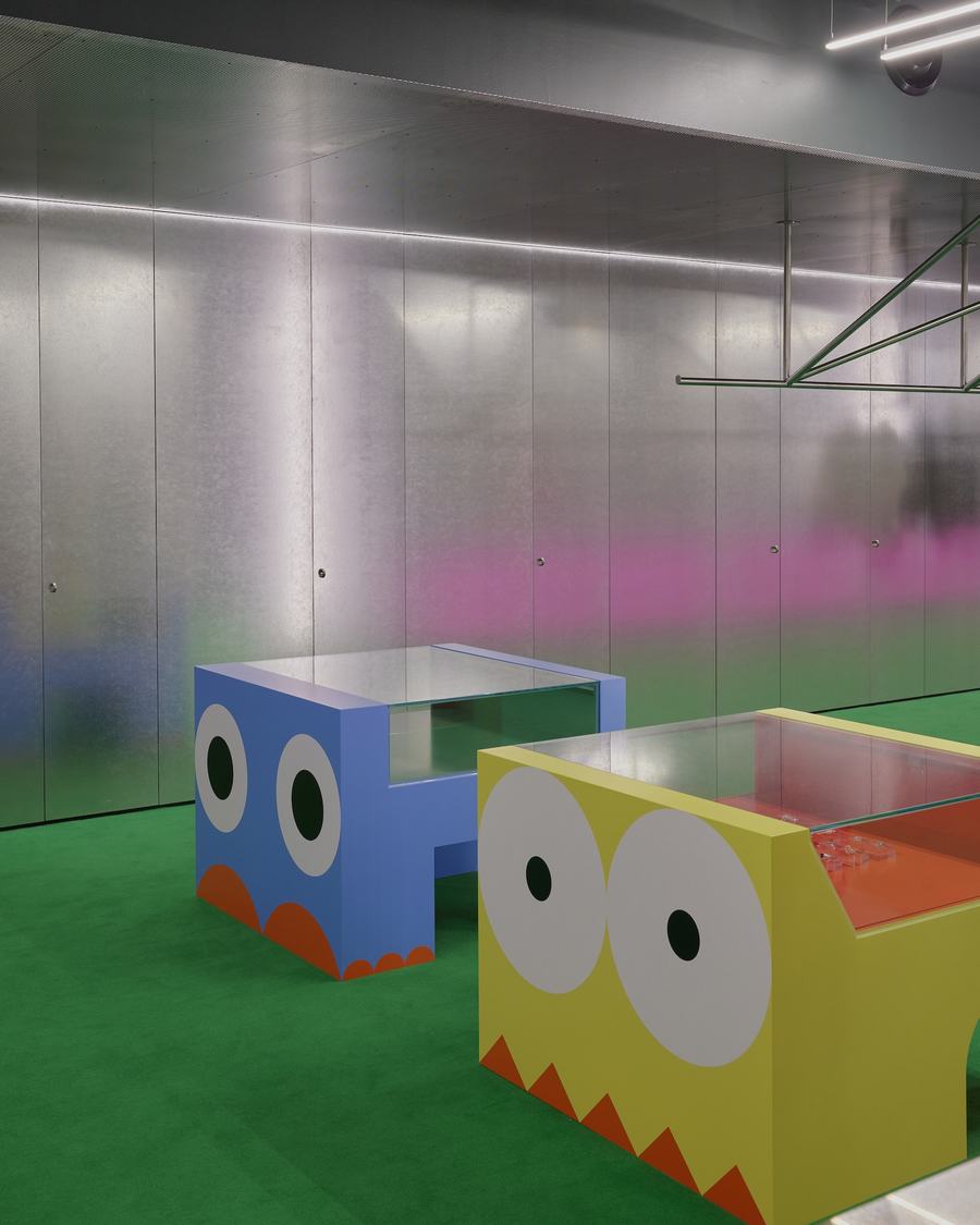 进入店铺的游客会通过镀锌钢台阶进入位于地下的部分空间。这一设计元素不仅增加了空间的层次感,还为顾客带来了一种独特的欢迎感。在进入空间后,顾客会立刻注意到右侧的收银台和人体模型与配饰展示区。明亮的草绿色成为了品牌的关键颜色,不仅为室内选择触觉地毯,还通过饱和色的运用将时尚元素融入到零售空间中。与此同时,卡通人物配饰展示也为整个商店的前部和主要零售区域带来了调和的效果。