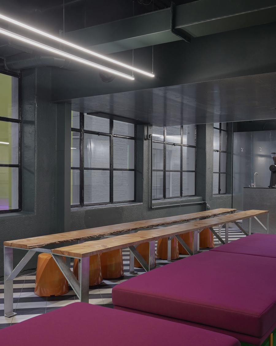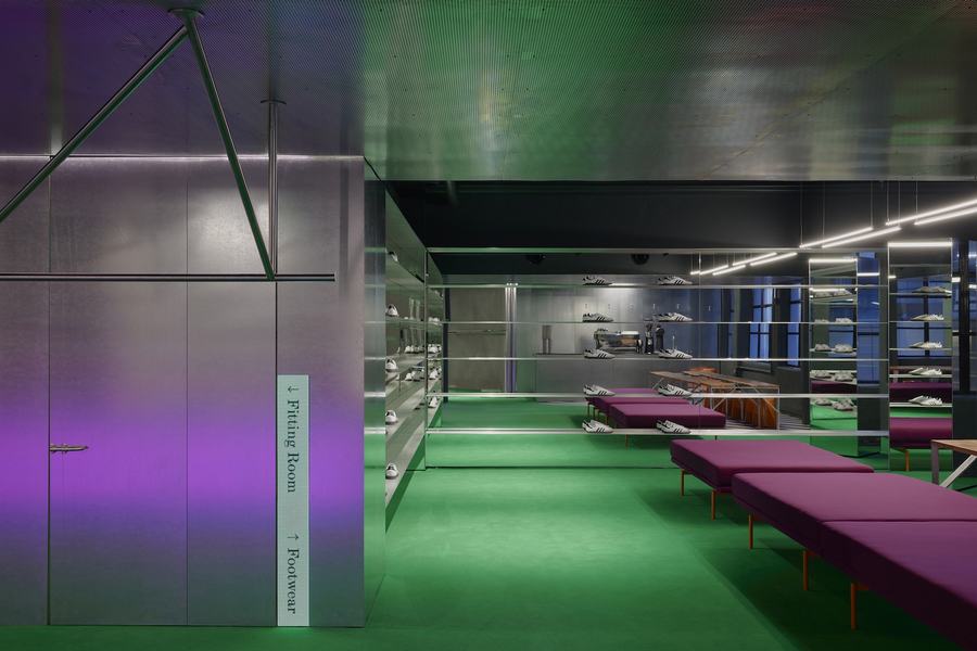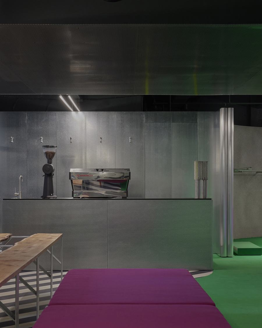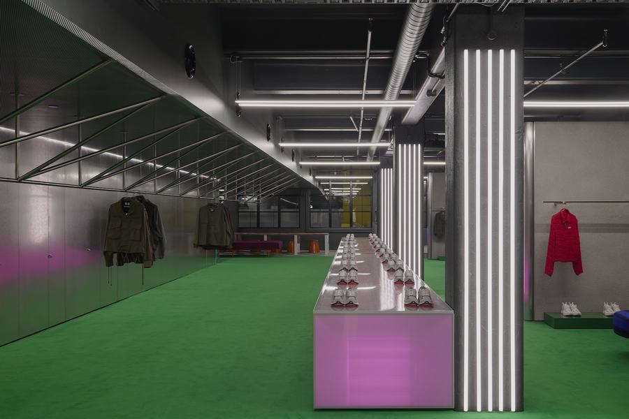 在这个旗舰店的深处,一个可编程的背光有机玻璃展示桌成为了一个独特的焦点。顾客可以看到从天花板悬挂下来的衣服展示,而地面上的绿色地毯和彩色灯光会在穿孔金属天花板上形成炫目的反射效果,创造出油光般的氛围。鞋子展示架与相邻的红色长椅相映衬,同时也为内部咖啡馆提供了座位。这个咖啡馆不仅仅是一个购物休息的场所,更是一个社交的聚集地,邀请顾客在啜饮咖啡的同时继续购买邻近的产品。这种社交场所的设置不仅增加了顾客的停留时间,还为品牌带来了更多的机会与顾客建立联系和互动。