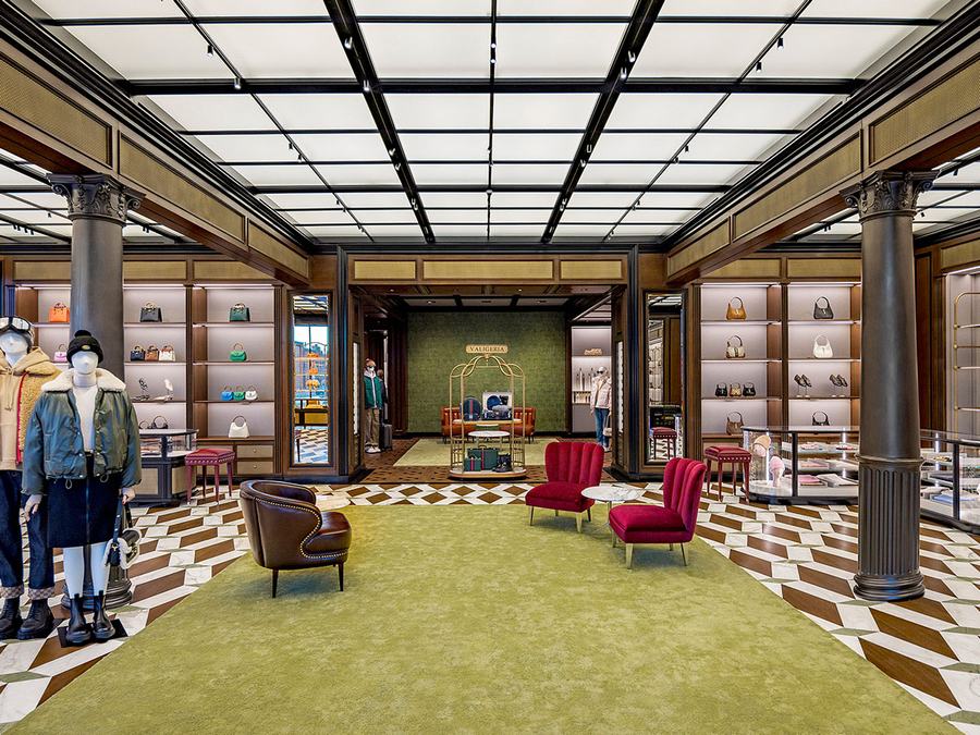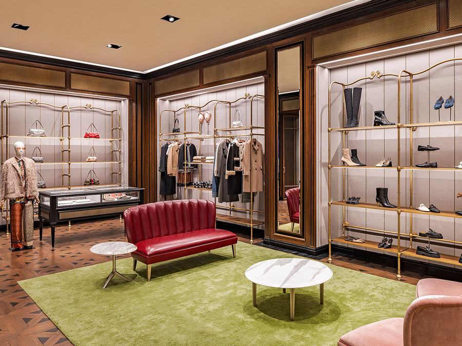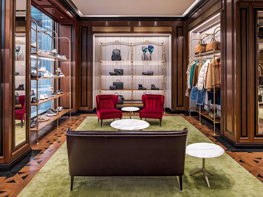 步入式衣柜和黄铜设计的内置展示架展示着古驰的经典单色图案和精致的配饰,让人仿佛置身于时尚舞台。天鹅绒扶手椅和沙发散发着复古的韵味,与绿色地毯相得益彰,为顾客营造出宾至如归的感觉。除了外观和装饰的精致之外,这座精品店还积极响应环保理念,采用LEED指导方针设计,提高能源效率,体现了古驰对可持续发展的承诺。