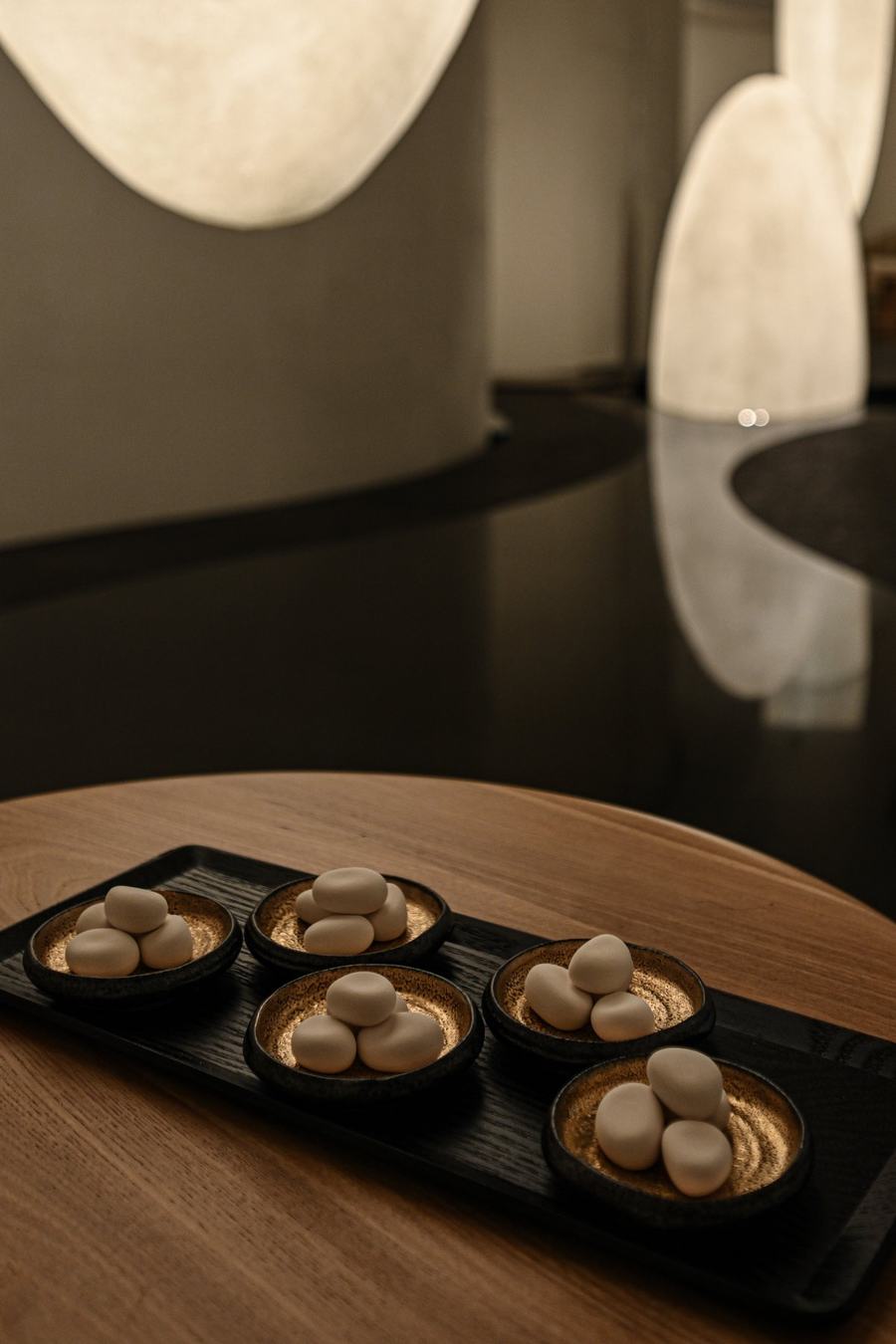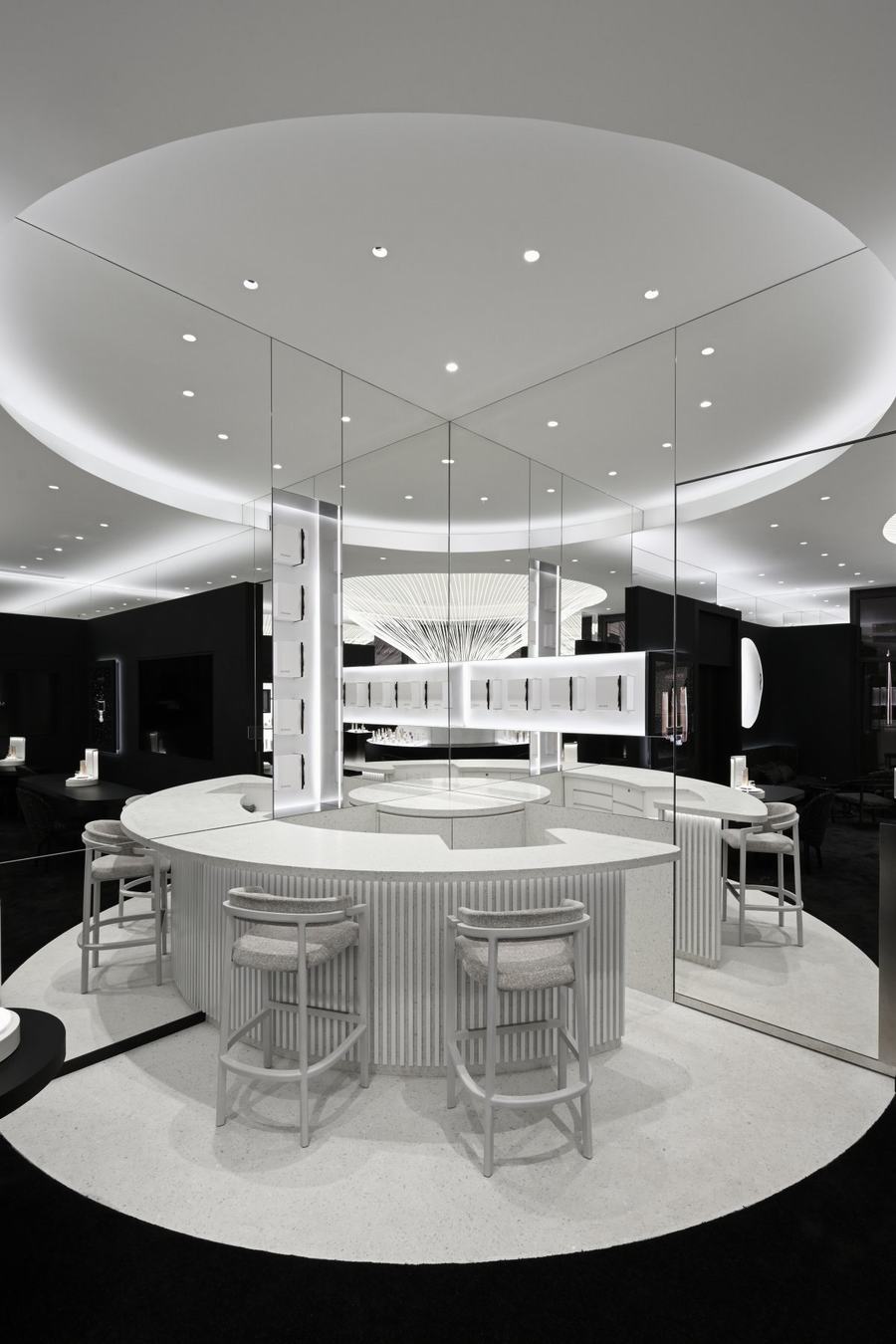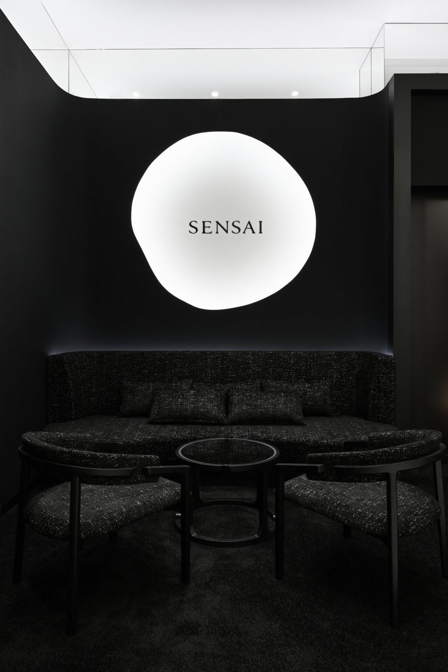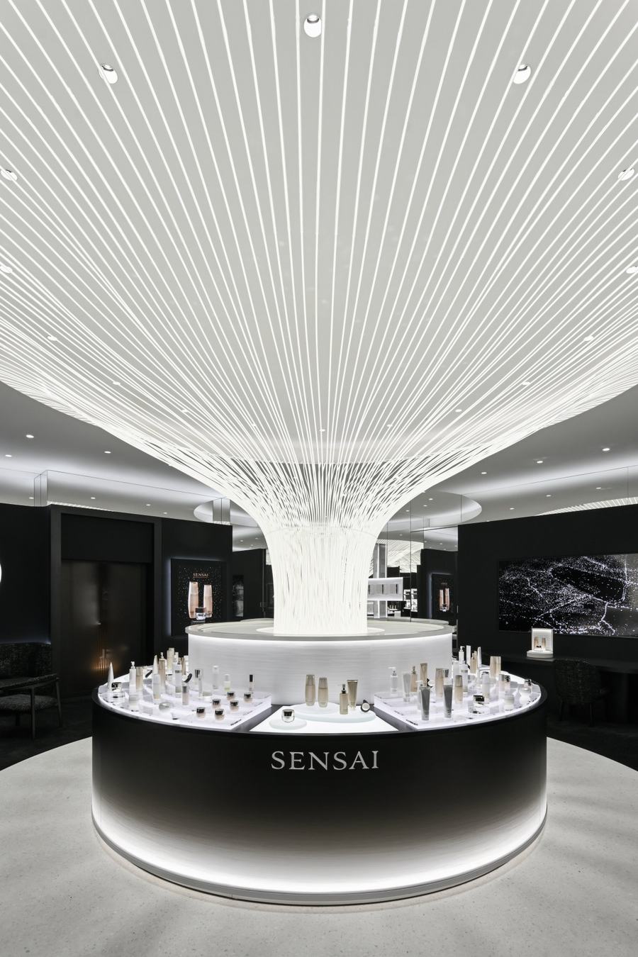 购物区是SENSAI上海旗舰店的一个重要特色。枝形吊灯是这一区域的主要装饰元素,其精致的线条让人联想到SENSAI品牌标志性成分“Koishimaru Silk”。圆形咨询柜台上优美的曲线设计自然吸引着顾客的目光,引导他们进入房间的不同区域。墙壁采用深哑光的黑色,将完美无瑕的丝绸物体凸显出来,创造了宁静的氛围。天花板上镜面反射出的两个漂浮的大圆圈为空间增添了宽敞的深度,让顾客感受到浑然一体的美感。