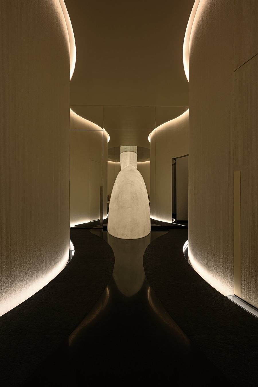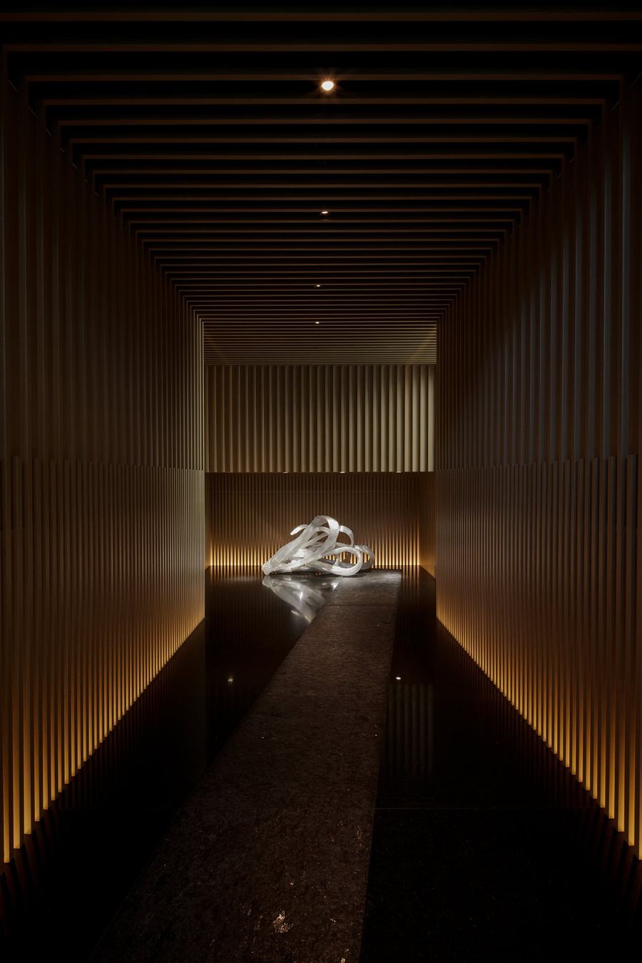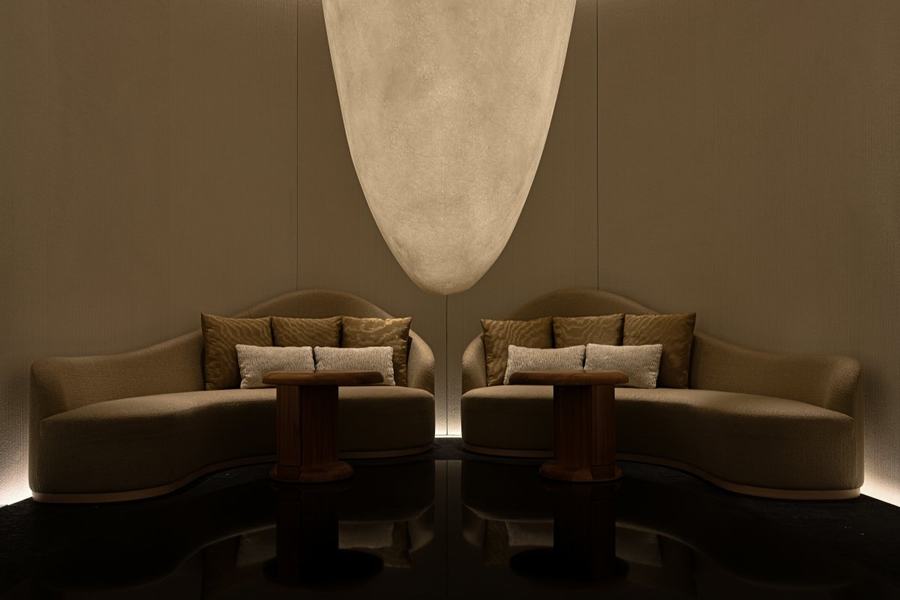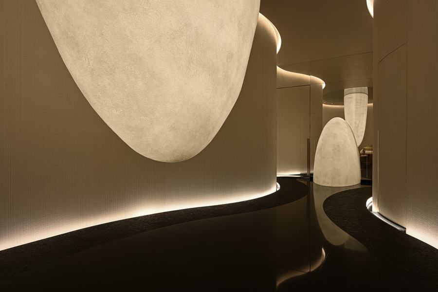 与购物区形成鲜明对比的是水疗区。进入水疗区时,顾客会被温暖的灯光所迎接。设计师横山正平创作的玻璃艺术突出了整个空间的独特性。精致的纤维材质带来了动感的感觉,让人联想到柔软的丝绸,同时又像一笔一刷的油漆。在这个区域,顾客可以放松身心,享受独特的水疗体验。