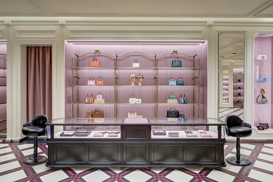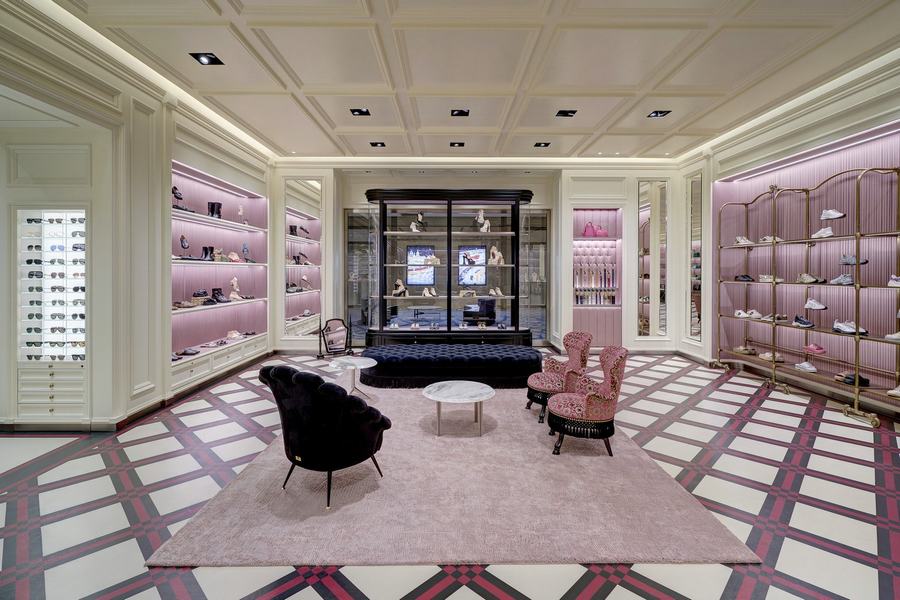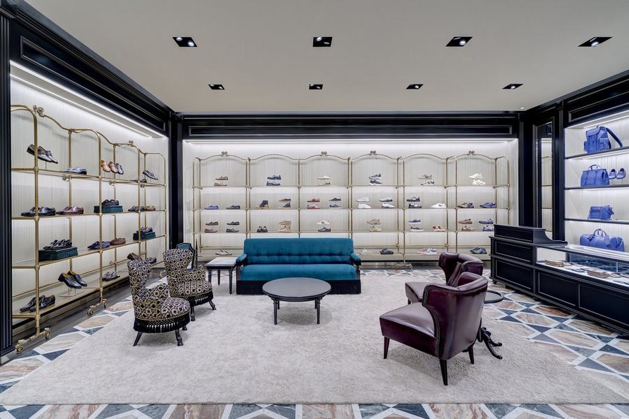 走进这家店铺,顾客首先会被定制改造的几何彩绘木地板和大理石多色镶嵌所吸引,这些设计营造出独特的三维效果,使人仿佛置身于艺术作品之中。墙面上排列的复古风格展示单元和丰富的织物则让整个空间散发出一种历史与现代交融的氛围。