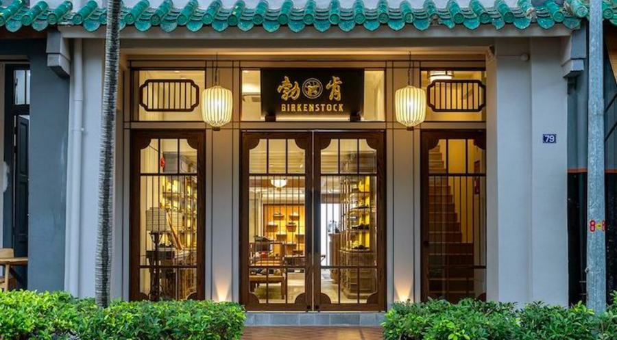 店铺的入口处装饰着传统的中国木制招牌和手工制作的纸灯笼,而复古的瓷砖铺设则进一步增添了东方韵味。店内的特色墙高达6米,展示了Birkenstock的标志性鞋款,同时配有当代土生华人设计的水景,营造出一种宁静舒适的购物氛围。这里陈列着超过200个模特,包括东南亚首家提供的Birkenstock 1774系列,这一系列是对品牌经典款式的重新诠释,代表了工艺与时尚的完美结合。
