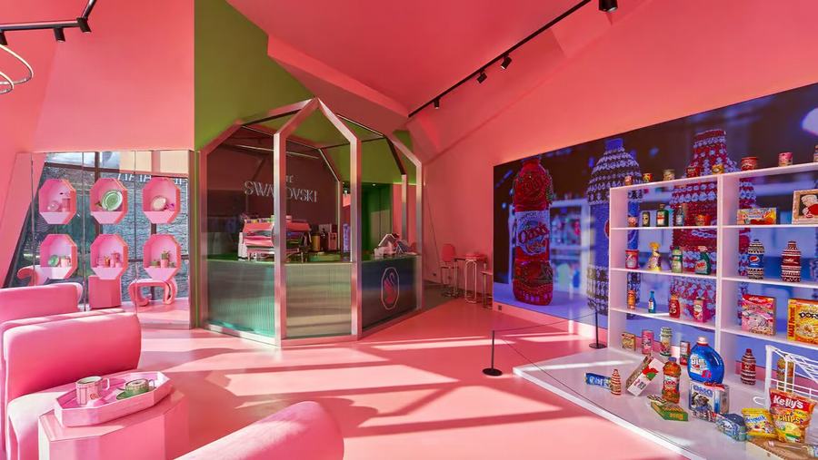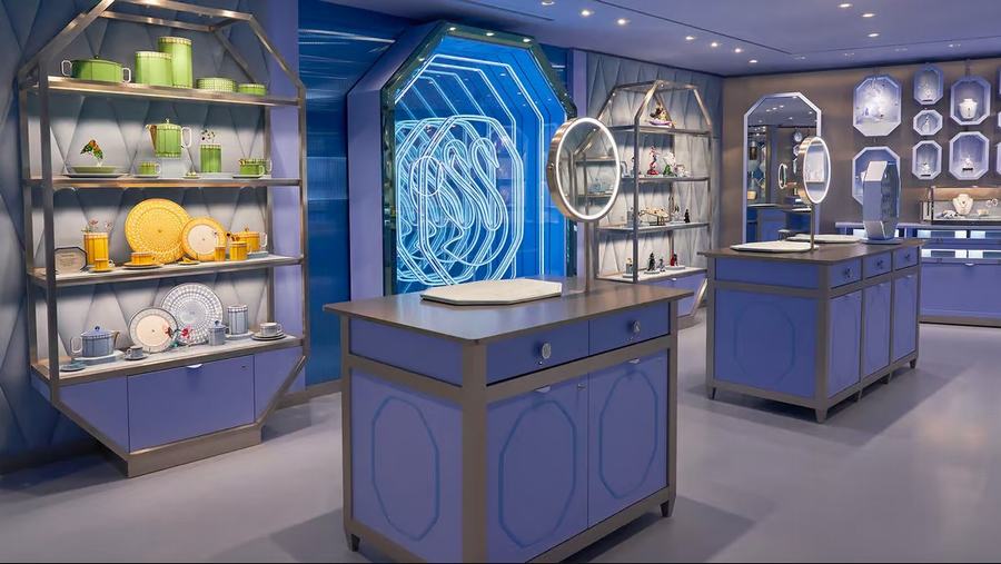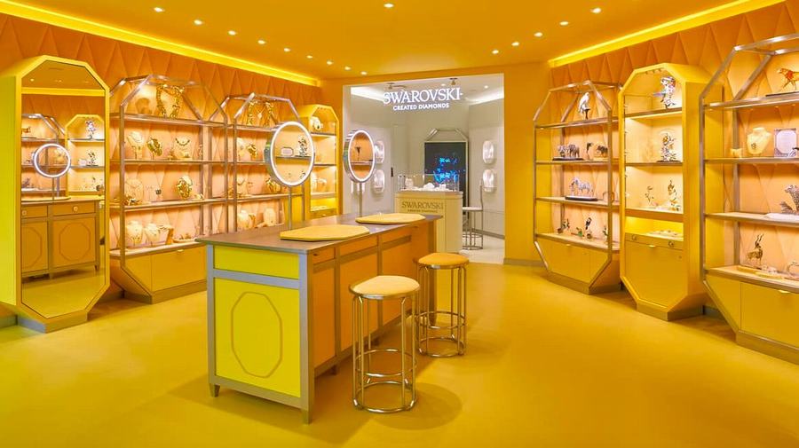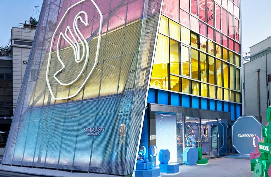 店铺设计融合了施华洛世奇蓝黄粉红的品牌色彩,营造出一个光影交错的梦幻空间。四层楼高的旗舰店内部装饰着巨型的天鹅标志,象征着品牌的优雅与高贵。顾客走进这个488平方米的零售空间,仿佛踏上了一场发现之旅,每个角落都散发着奢华与创意的气息。