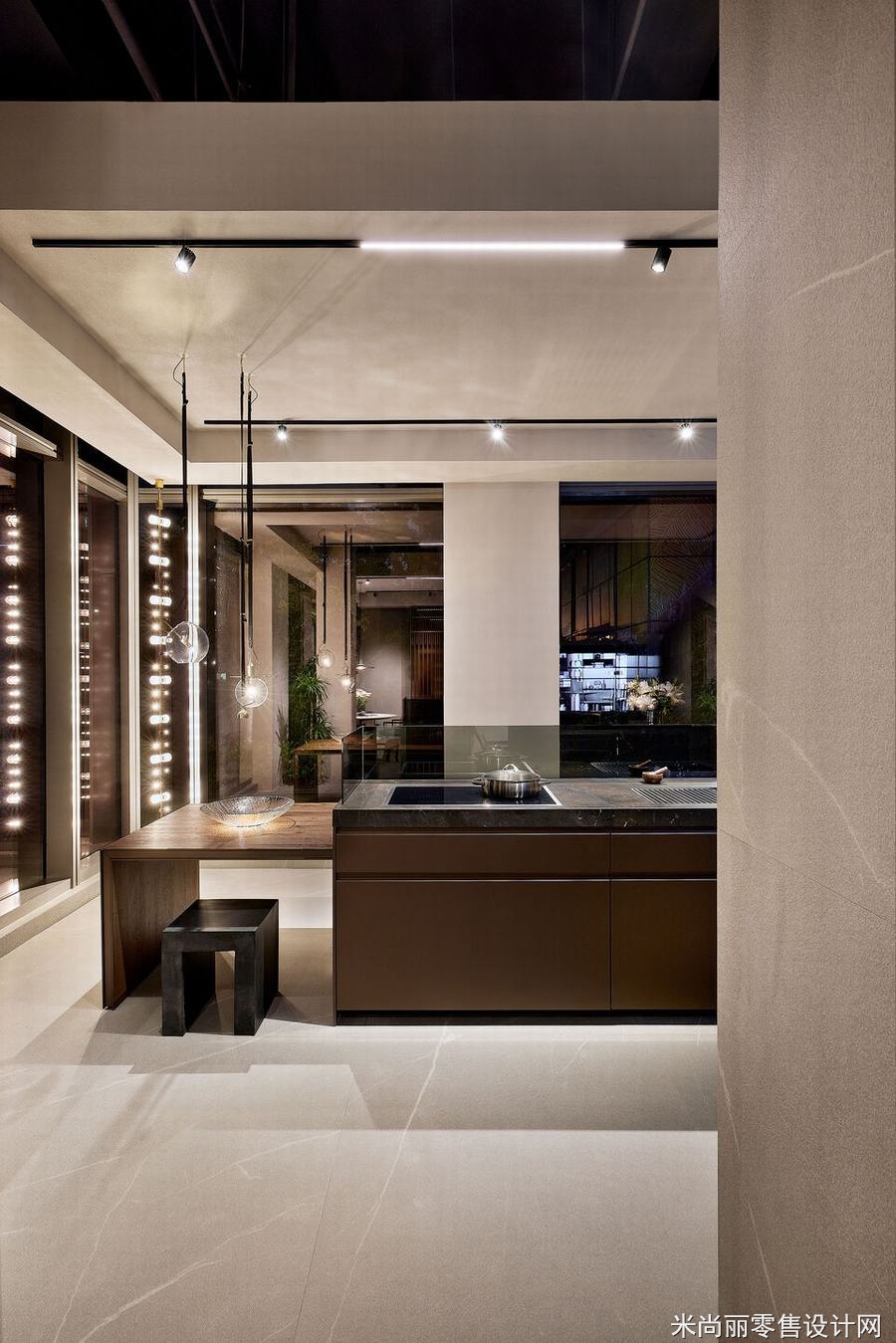 在光线照明方面,我们进行了详尽的研究。技术灯和装饰灯结合使用,采用了完美的材料,与厨房的木材、金属和大理石进行色彩对话。通过适当的照明,我们精心照亮了道路和展览区域。从商店的大窗户可以俯瞰城市花园,这使得厨房陈列室在白天被自然光淹没,而在晚上则被人造光强调。