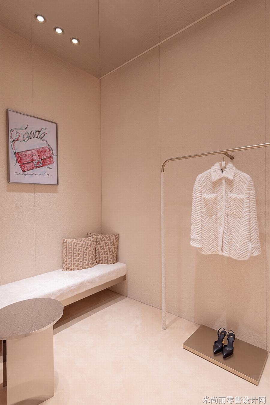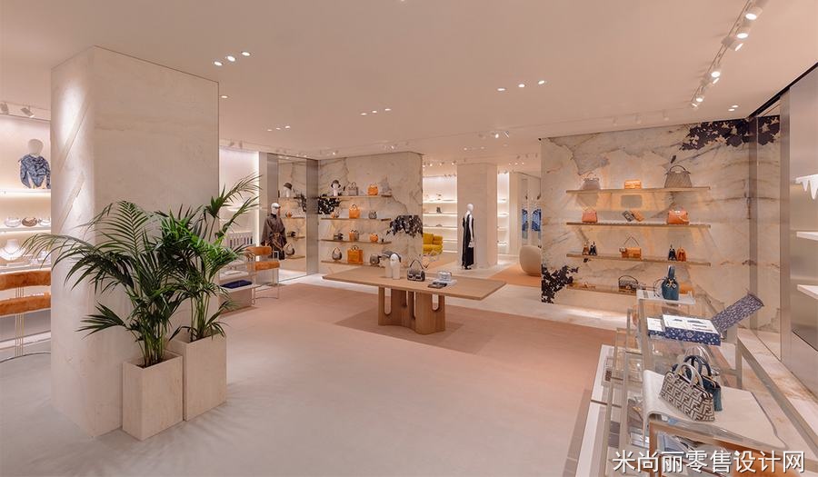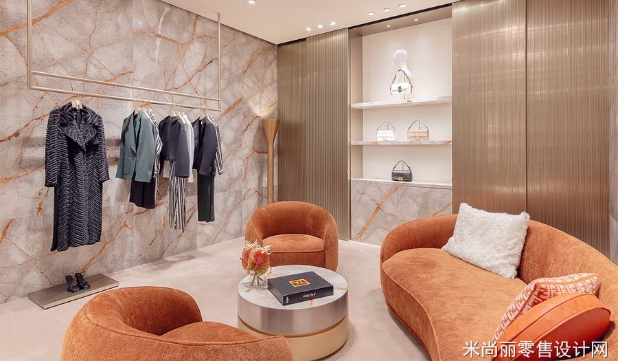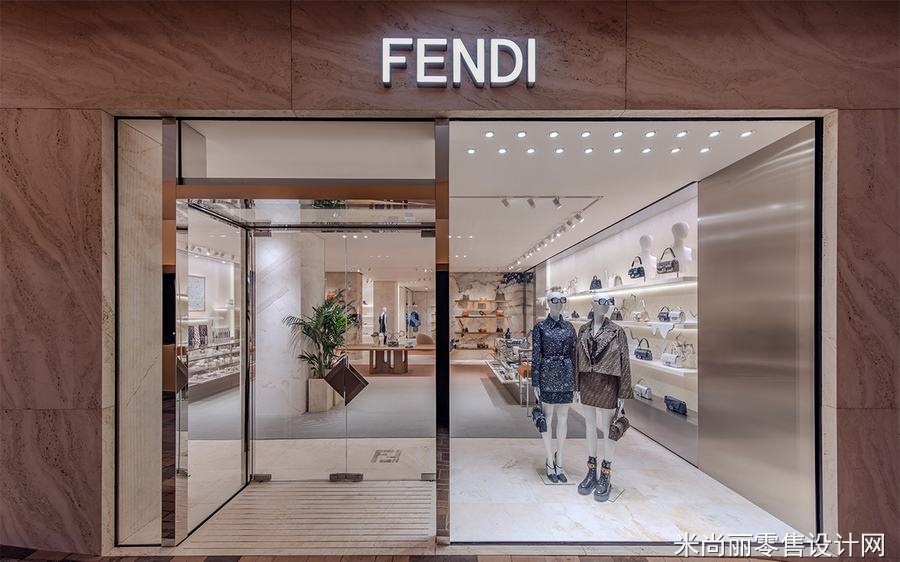 在专门店的入口处,你会看到两面低调奢华的特色墙,由巴塔哥尼亚大理石制成,并以琥珀色手工纹理玻璃点缀。壁橱采用石膏手工制作,饰有FENDI元素,其中包括宛如品牌标志的Pequin条纹以及由FF标志与立体菱形组成的图案。这些细节展示了品牌对设计的精心选择和呈现。