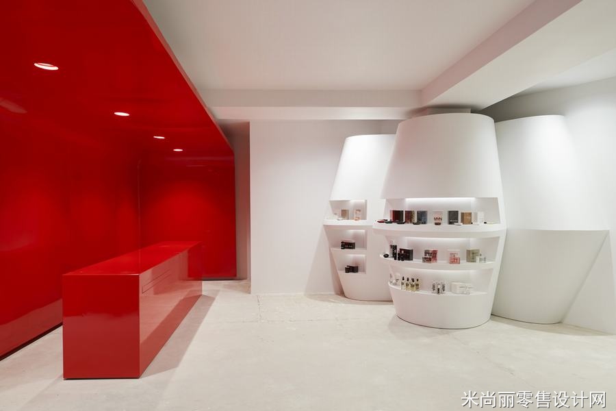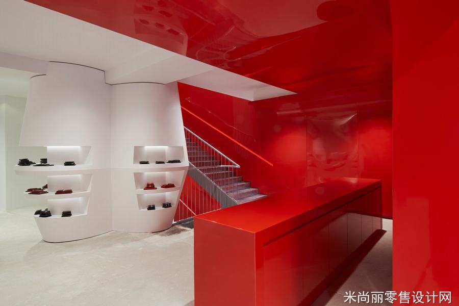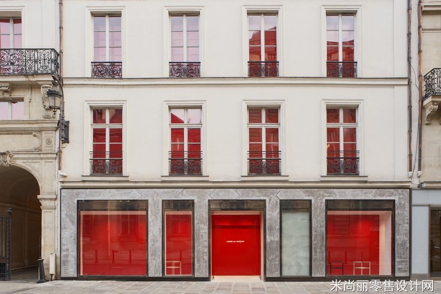 与许多追求新技术和体验式购物的零售空间不同,Comme des Garçons的店铺展现了对传统实体零售的忠诚。它专注于室内建筑的视觉冲击和独特的家具设计,完美配合了所在环境——Rue du Faubourg Saint-Honoré街道是巴黎奢侈品时尚的主要街道之一,拥有跨越几个世纪的零售遗产。川久保玲的设计支持了一种理念,即令人难忘的购物体验取决于单一的设计决策。在这种情况下,红色和白色的强烈对比赋予整个室内一种似乎与历史悠久的巴黎大道不同的氛围。