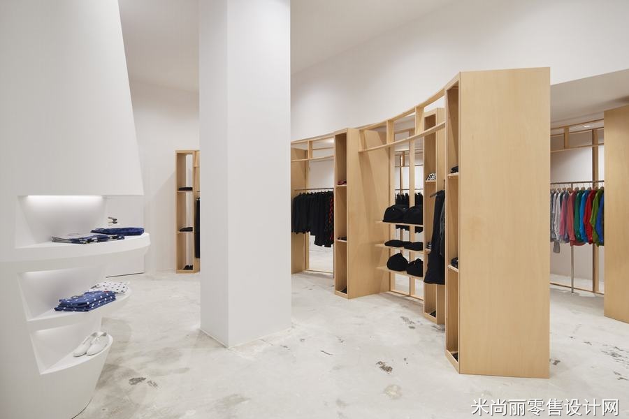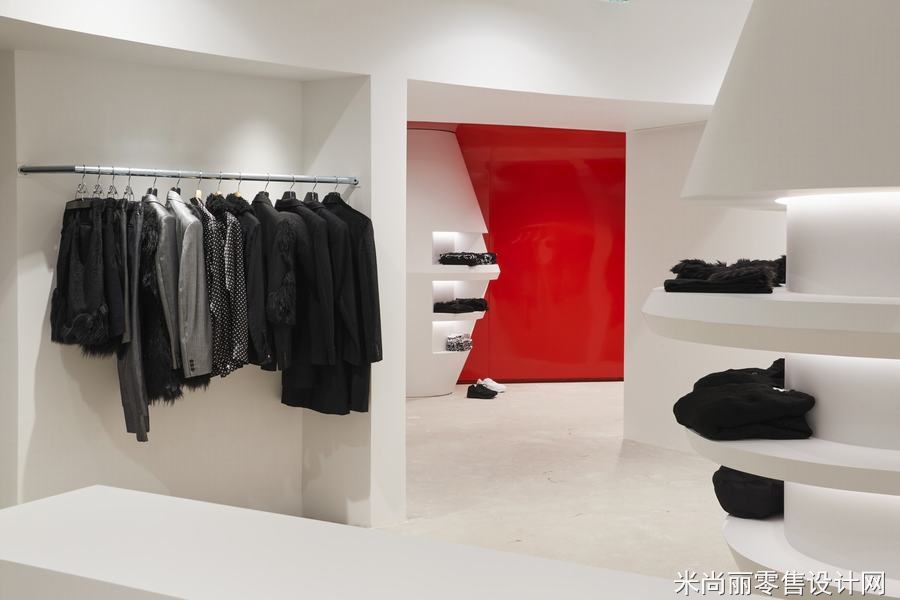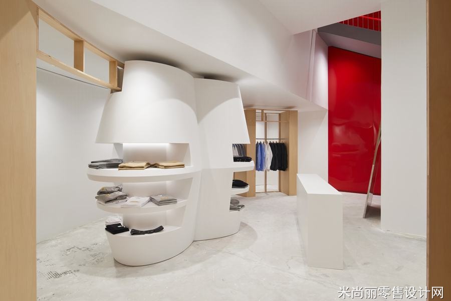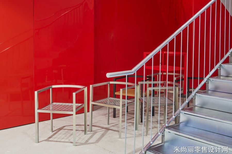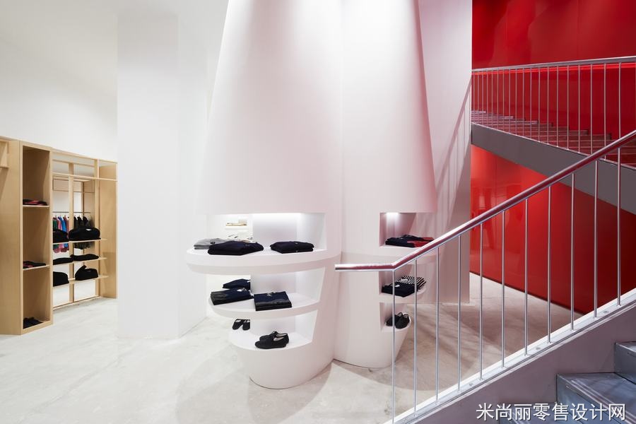 店铺内部的红色玻璃纤维墙贯穿整个室内空间,与以往的设计相呼应。白色的结构看起来像是从墙壁上生长出来的雕塑,其中一些结构被用作产品展示单元。白色的地毯和金色木架子的结合,营造出纹理和色调的变化。而川久保玲设计于80年代的金属椅子,包括一款特别版的红色椅子,在店铺中占据了最重要的位置。这里是全世界唯一一家拥有Comme des Garçons家具的地方。