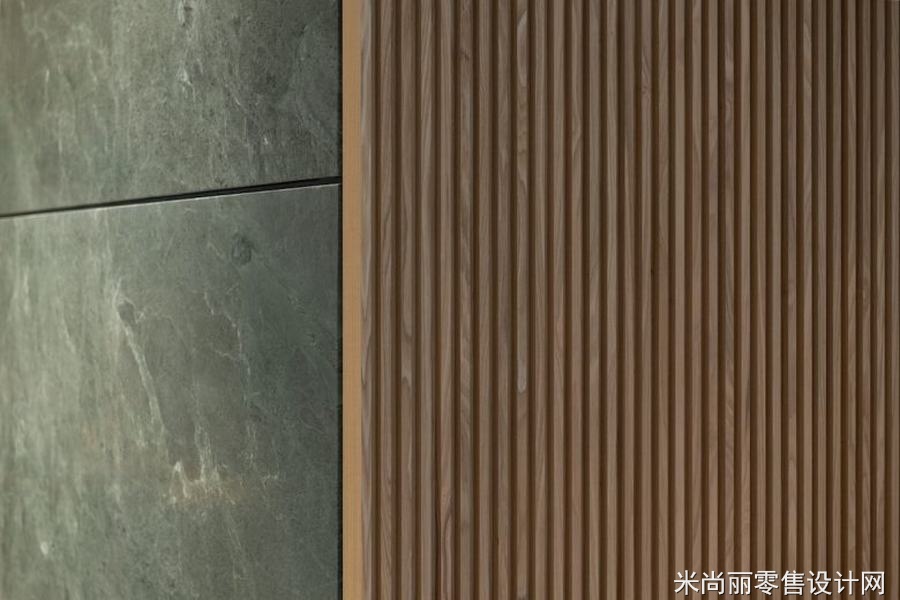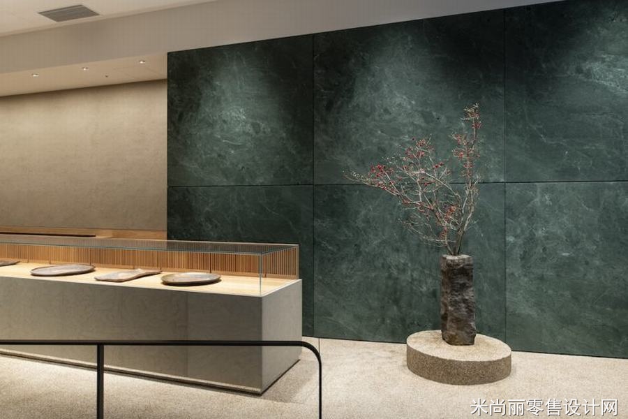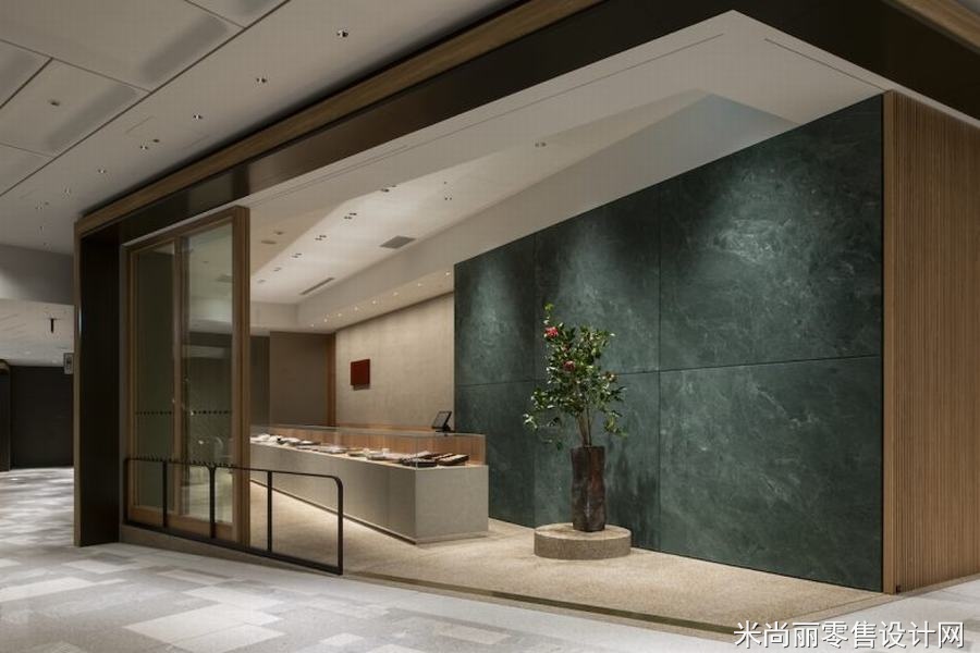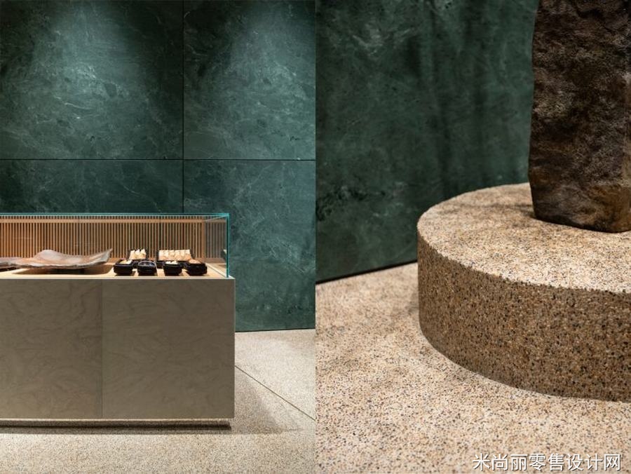 为了给商店的正面留下深刻印象,设计师们在厨房墙壁周围采用了大尺寸的蛇纹石,营造出绿色背景。这一设计细节进一步增强了与日本糖果的关联性,为顾客们营造出一种独特的感受。