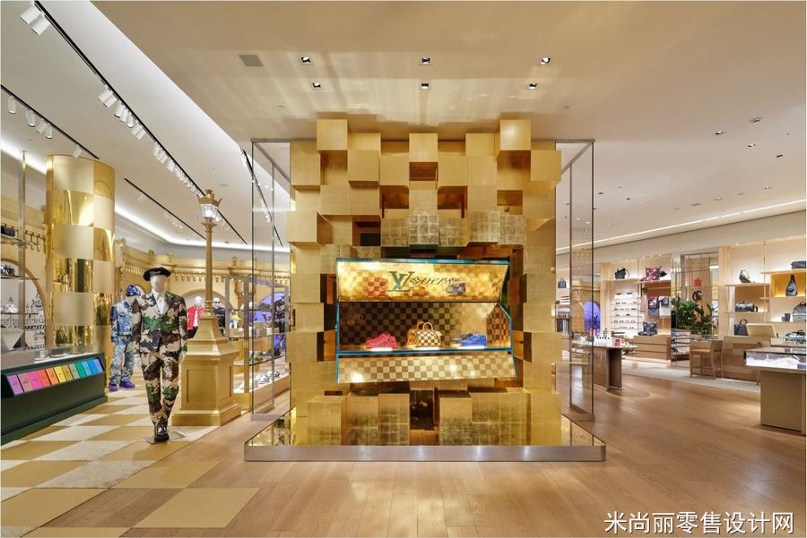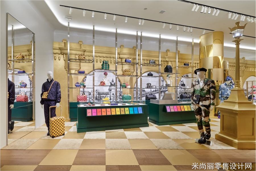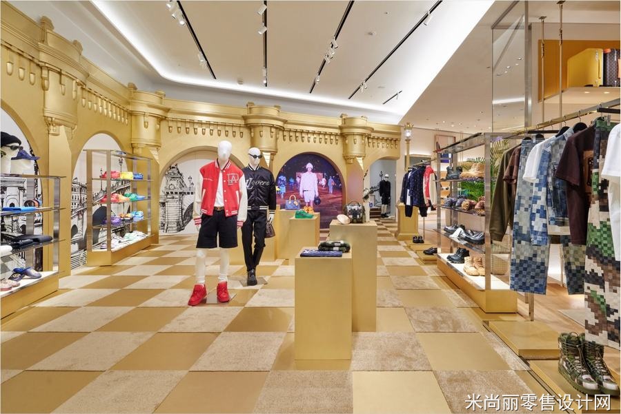 路易威登男装精品店的外观经过精心调整,以新桥(Pont Neuf)的元素为背景,这也是去年该系列在巴黎t台上展示的地点。如同其他快闪店一样,这里采用了金色的Damier立体图案,为整个店铺增添了一抹奢华的色彩。这个别致而优雅的设计,旨在表明新的快闪店的存在,让顾客感受到与众不同的购物体验。
