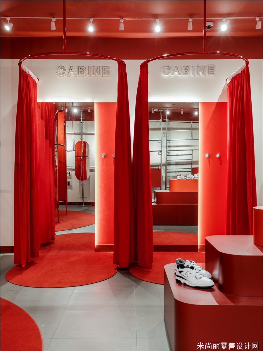 从脚手架到钢棒捕捉,从红色有机玻璃隔板到复古区,每个细节都借鉴了新的HypePoint品牌标识,同时也推断了去年5月在quizembec市的零售商商店首次展示的美学。钢棒不仅排列在墙壁和商店橱窗上,还用作分隔物。在商店的中心,一个由红色有机玻璃隔板形成的圆圈划定了复古区,并提供了一窥收银台墙壁的机会。红色的纹理和色调的变化则区分了商店中各种类型的展示。