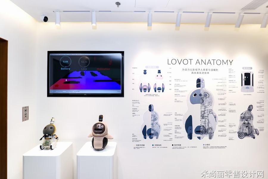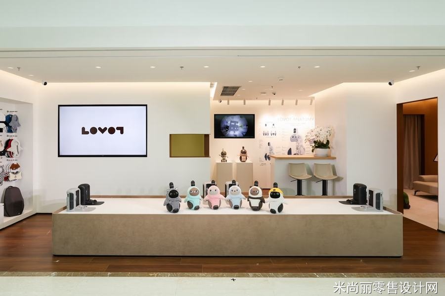 由藤原浩亲自监修的店铺设计,巧妙地将现代感与功能性结合,创造了一个既能展示LOVOT高科技特性,又能提供亲密互动体验的空间。店铺内部分为四大区域:舞台区、服饰陈列区、技术展示区和专属体验区,每个区域都旨在让消费者更深入地了解和体验LOVOT的独特魅力。