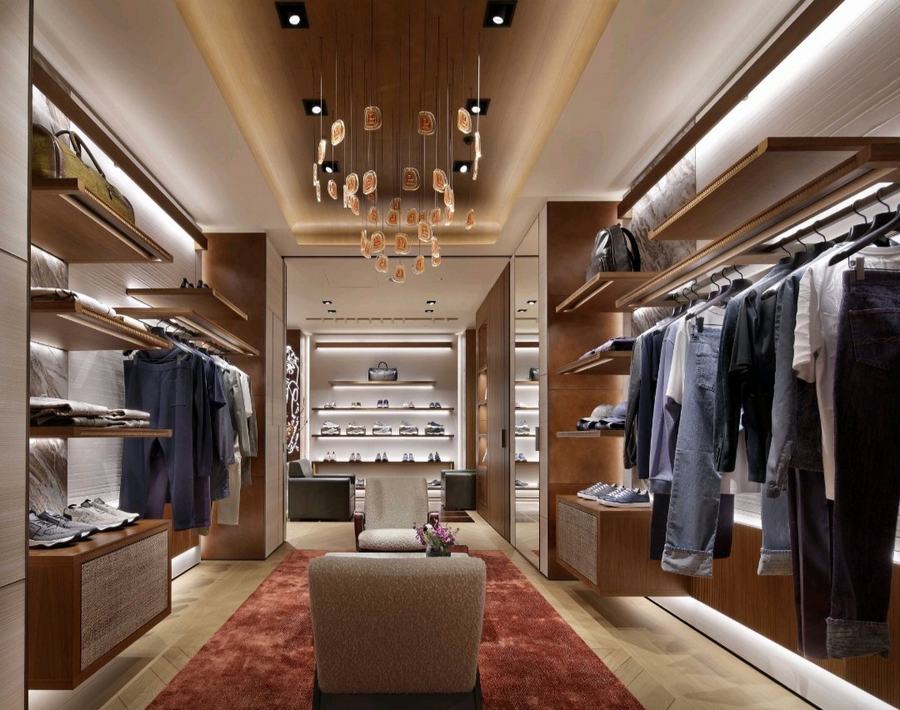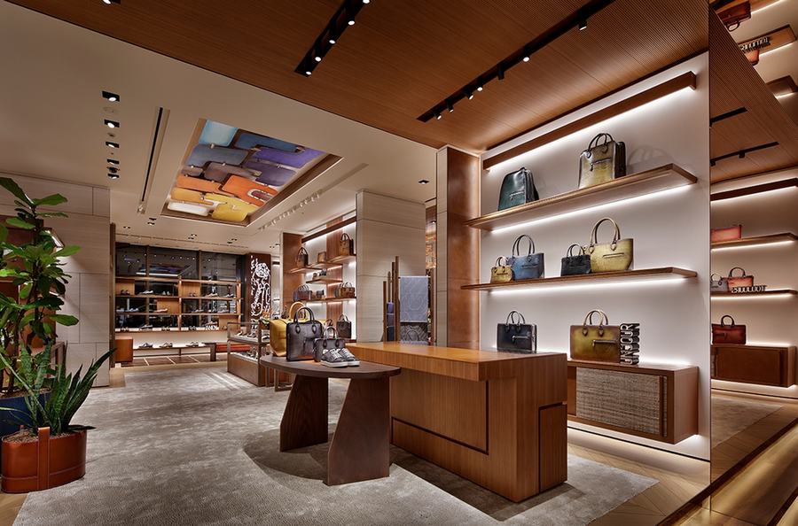 主楼层的天花板上装饰着蓝色、米色、橙色等渐变的波浪面板,与立面的设计相得益彰,为时装店增添了一丝动感和现代气息。店内商品包括鞋、包、服装、小皮具等Berluti的所有品类,丰富的选择满足了不同顾客的需求和喜好。