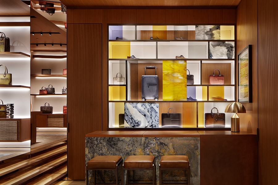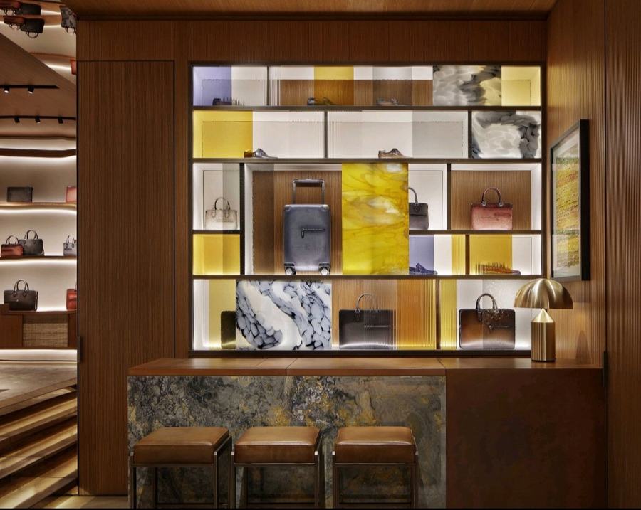 一踏进店内,顾客首先会被正面的展示墙和法式吧台所吸引。展示墙上陈列着由工匠手工制作的牛津鞋、“alessandro”和乐福鞋“andy”、“jules”系列的手提包等产品,展现了Berluti精湛的工艺和独特设计。玻璃与大理石的融合让整个空间显得细腻而又充满质感。