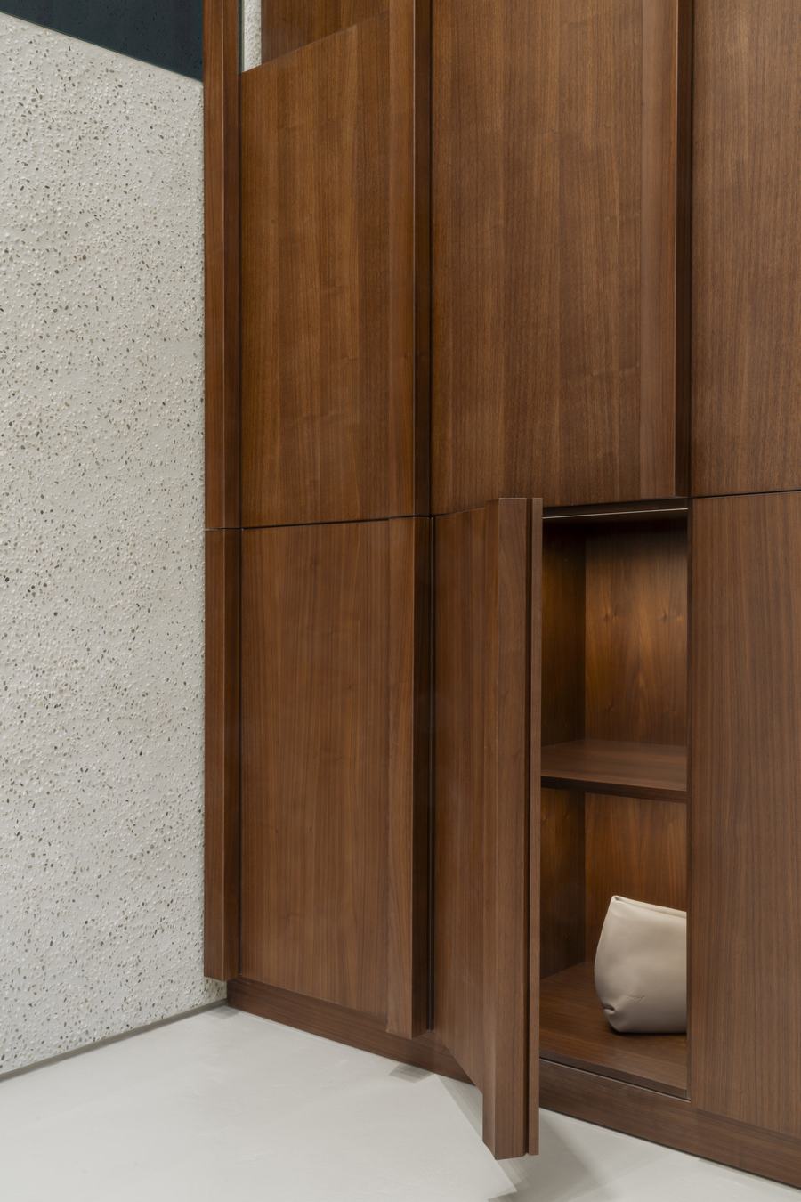 穿过一楼的开放感觉,你会被那些木材架子所吸引,它们沿着大楼梯后墙延伸,连接着地下购物体验的延续。设计师们精心打造的多功能区域不仅用于Marsèll Gomme家族的展示,还可以举行会议和举办展览,将购物体验提升至艺术的高度。