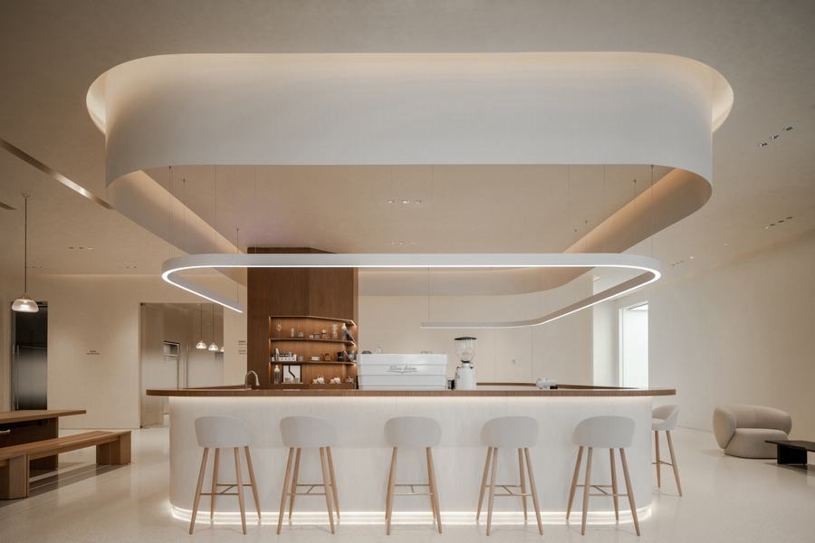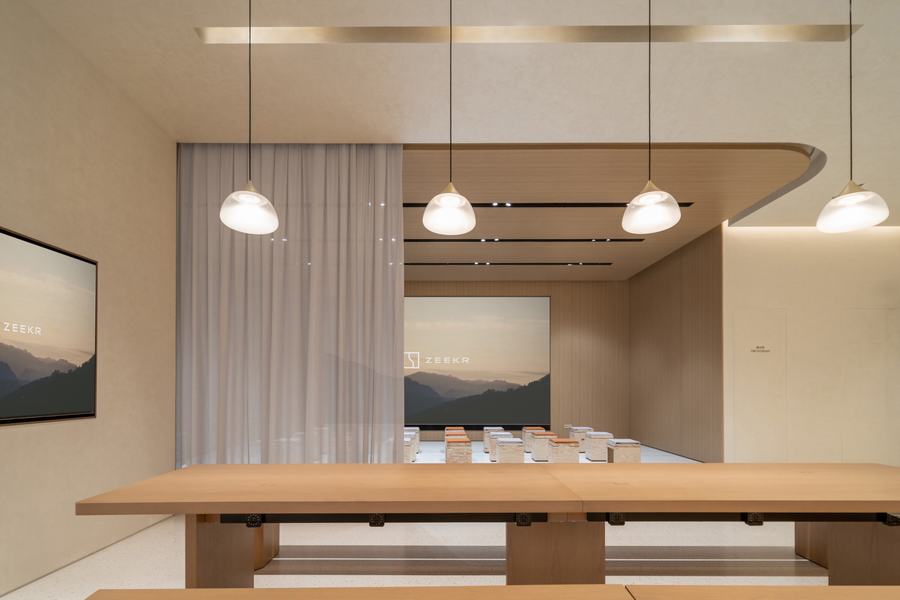 ZEEKR中心的空间布局充分考虑了功能性与用户体验。设计团队将空间中的结构柱巧妙转变为功能性元素,如沿墙设计的L形货架,不仅为展示和存储提供了空间,也增加了观赏性。此外,多功能ZEEKR酒廊设计和灵活使用的窗帘隔板,为游客提供了一个既可以举行小型会议,又能放松休息的多功能空间。