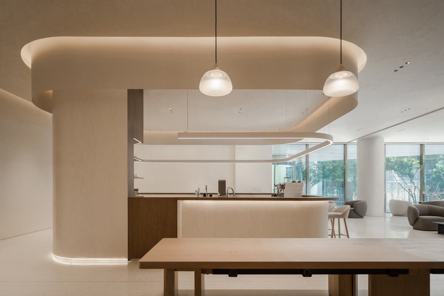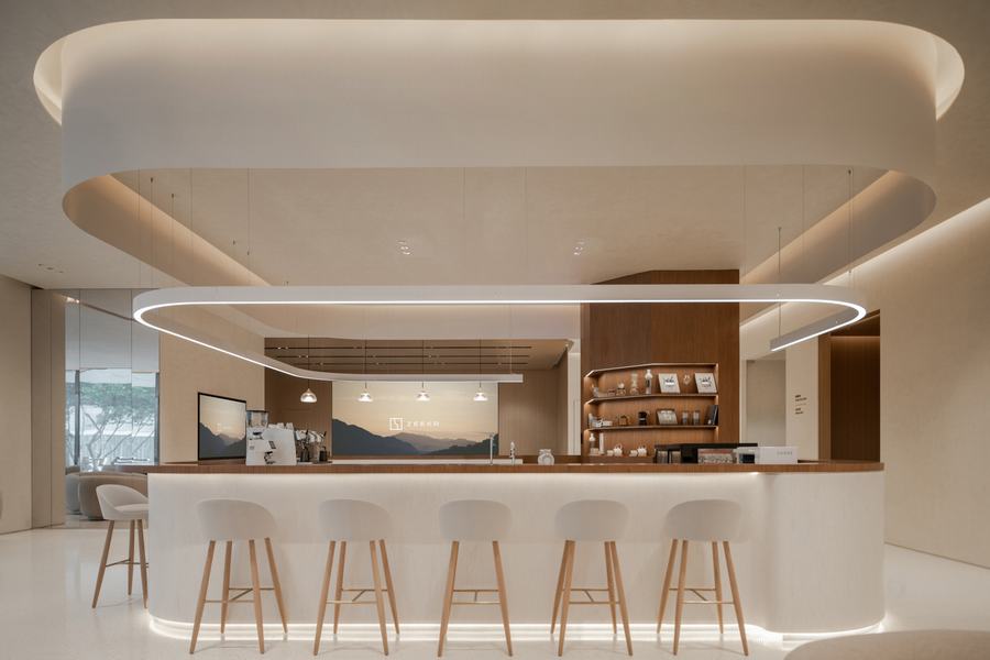 为了进一步增强空间的温馨氛围,设计师选择了中性色调作为主要的色彩方案,并通过弯曲的LED灯条沿着波浪形的墙壁边缘安装,模拟嘉陵江上的雾蒙蒙景象。采用RGBW系统的灯光设计不仅美观,还能根据不同时间段调整光线色温,从而提升用户体验。