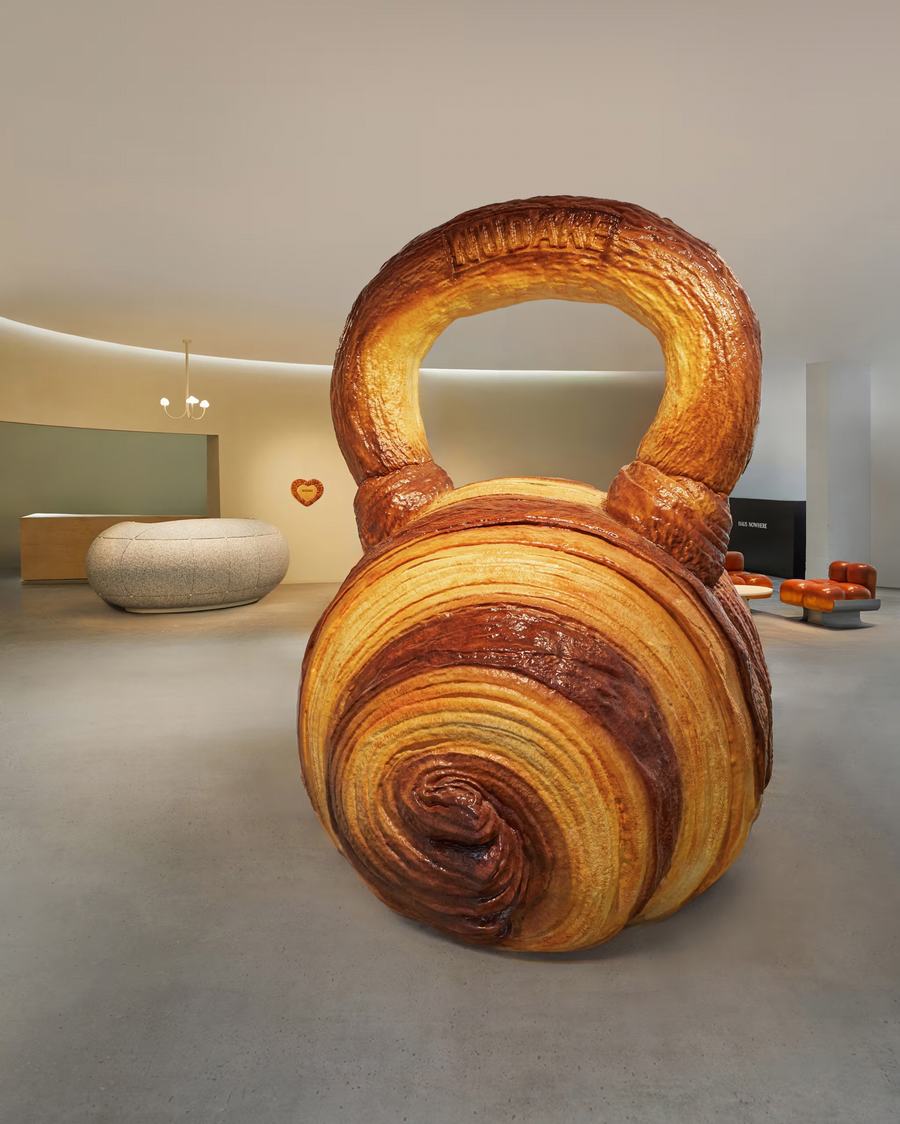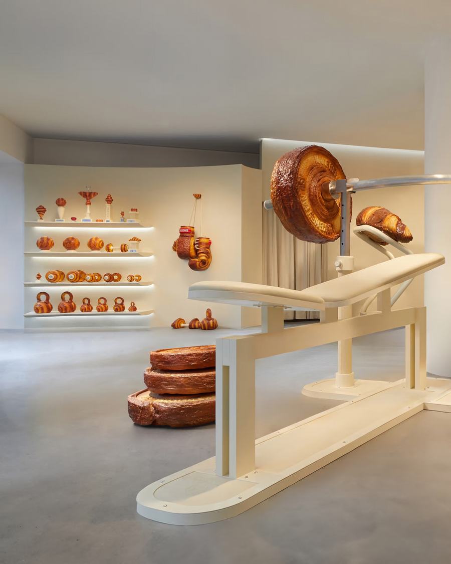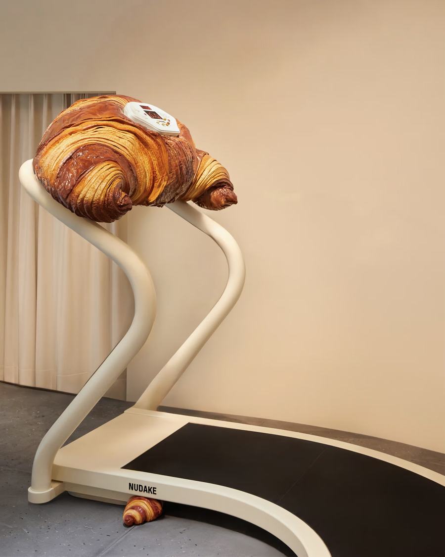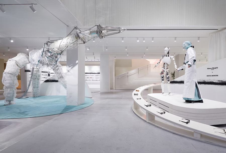 在HAUS NOWHERE SHANGHAI的一层,Maison Margiela与GENTLE MONSTER的限时联名空间吸引了无数目光。这个空间将机械与人类置于同一时空,模糊了生命体与物体的边界,为来访者提供了一种全新的未来主义视角。同一楼层的TAMBURINS与NUDAKE的全新空间也同样值得关注。TAMBURINS展示了老年夫妻涂唇膏的温情场景,而NUDAKE则以可颂为灵感,打造了别致的「可颂健身房」,为顾客带来了前所未有的体验。