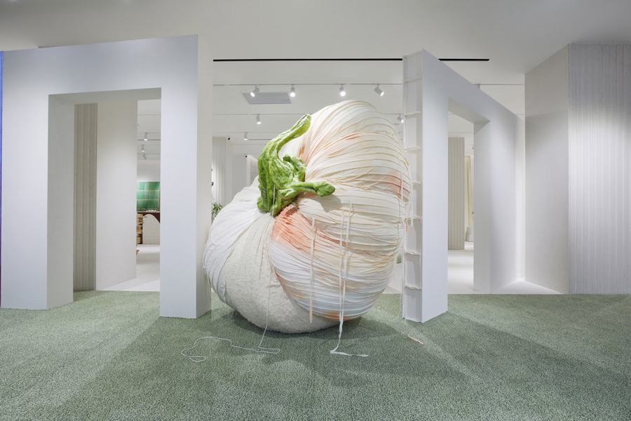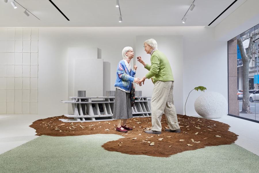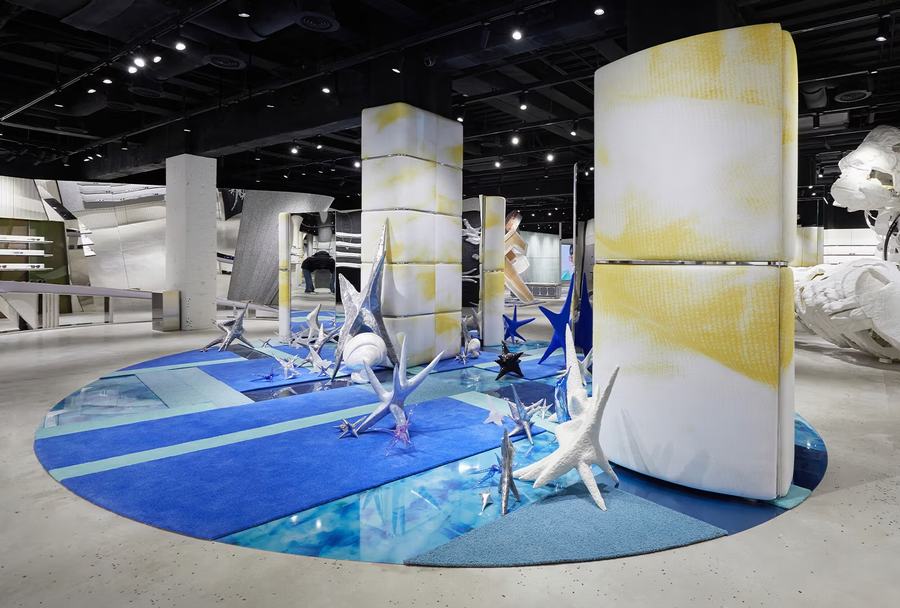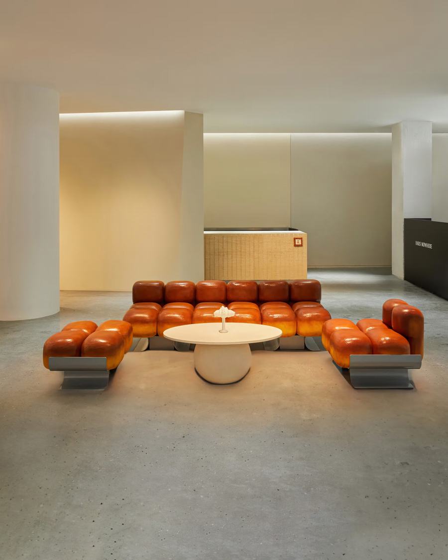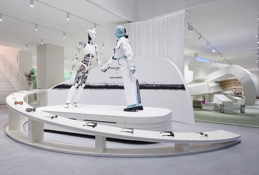 在HAUS NOWHERE SHANGHAI的一层,Maison Margiela与GENTLE MONSTER的限时联名空间吸引了无数目光。这个空间将机械与人类置于同一时空,模糊了生命体与物体的边界,为来访者提供了一种全新的未来主义视角。同一楼层的TAMBURINS与NUDAKE的全新空间也同样值得关注。TAMBURINS展示了老年夫妻涂唇膏的温情场景,而NUDAKE则以可颂为灵感,打造了别致的「可颂健身房」,为顾客带来了前所未有的体验。
