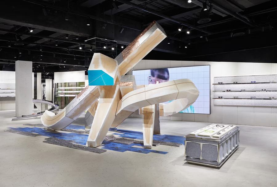 移步至二层,两个巨型头部装置在舒缓的摆动中紧密纠缠,形成了极具张力的视觉冲撞。这些装置周围,GENTLE MONSTER的系列产品在多样的颜色与材质中得到巧妙展示,进一步丰富了空间的艺术氛围。