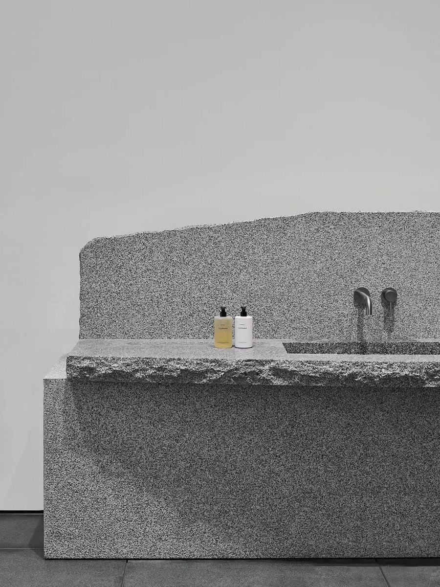 在店内的设计元素中,形状粗粒的花岗岩水槽与白橡木打造的搁架与镶板格外引人注目。这些自然材质的运用,不仅还原了造物的原始质感,更在细节之处彰显出BYREDO对品质与环保的坚持。而水槽与搁架的粗犷与镶板的细腻相结合,又形成了一种独特的视觉冲击力,让人在欣赏之余,不禁陷入对自然与人文的深思。