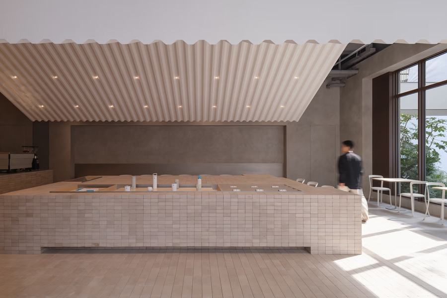 一踏入店内,首先映入眼帘的是位于中心岛台上方的白色双坡三角顶。这一设计巧妙地融合了现代建筑元素,屋顶柔和的波浪板纹理给人一种宁静而舒适的感觉。而位于中心岛台周围的坐席布局,更是体现了建筑学经典的中心环绕式理念,为顾客提供了一个既能享受相聚氛围,又能保持独处空间的舒适环境。