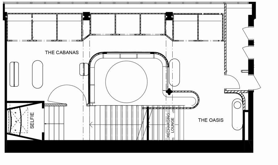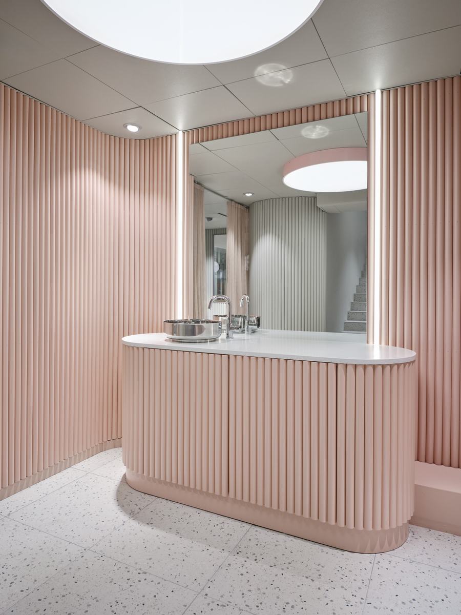 在店内的顶层,是一个安静的休息区。这里的灯光柔和而温暖,为顾客提供了一个放松身心的空间。试衣间入口处的设计更是别出心裁,通过镜子和光线的相互作用,创造出了一个无限的圆形房间的错觉,让人仿佛置身于一个神秘的空间之中。