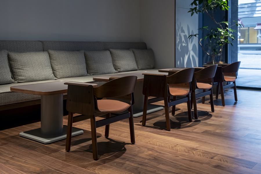Blue Bottle Coffee一直以其标志性的空间方法著称,福冈天人咖啡馆也不例外。厨房被咖啡柜台包围,两者都被放置在空间的中心,这样的布局不仅方便了咖啡师与顾客的互动,也让制作过程变得更加透明和亲切。中央墙壁上的蓝色瓶子图案,是品牌的象征,也是空间中唯一鲜艳的颜色。它如同一个独特的标识,提醒着人们这里是Blue Bottle Coffee的世界。