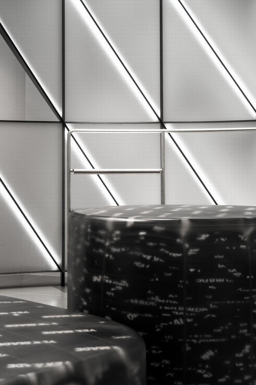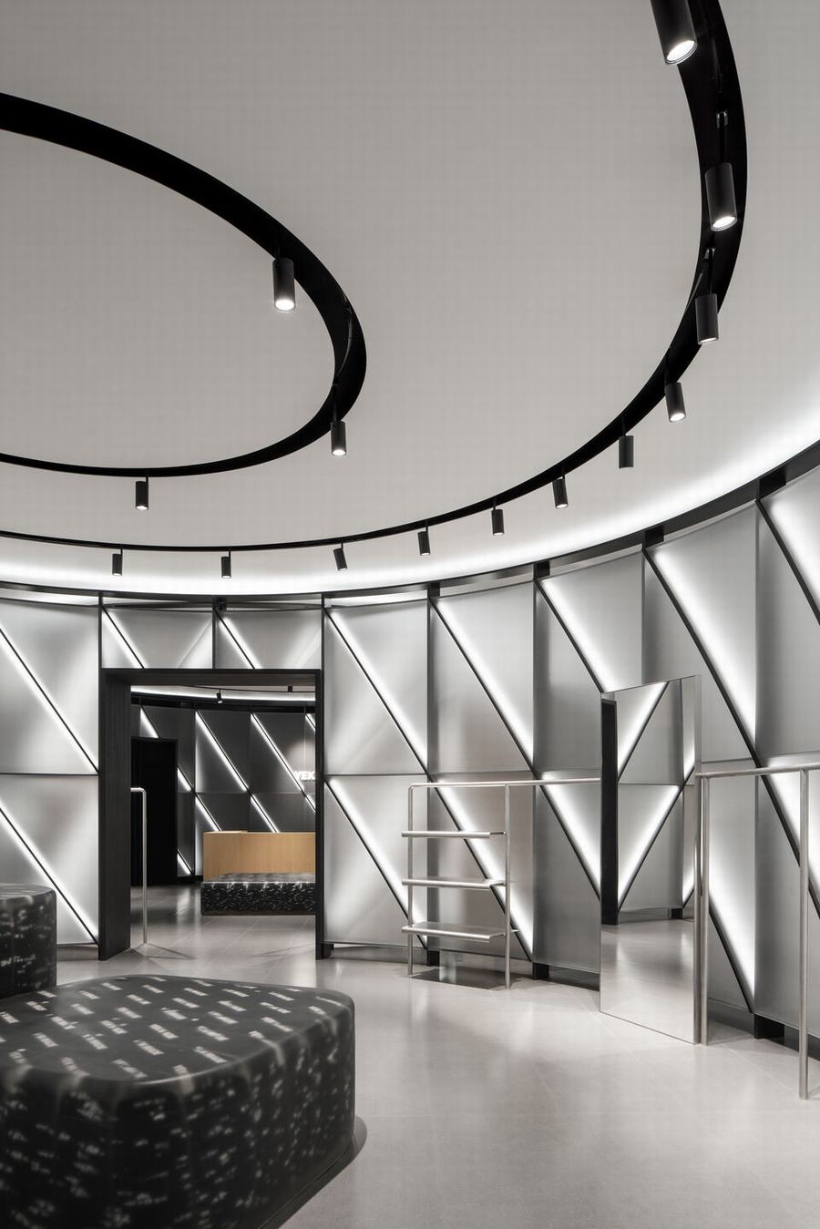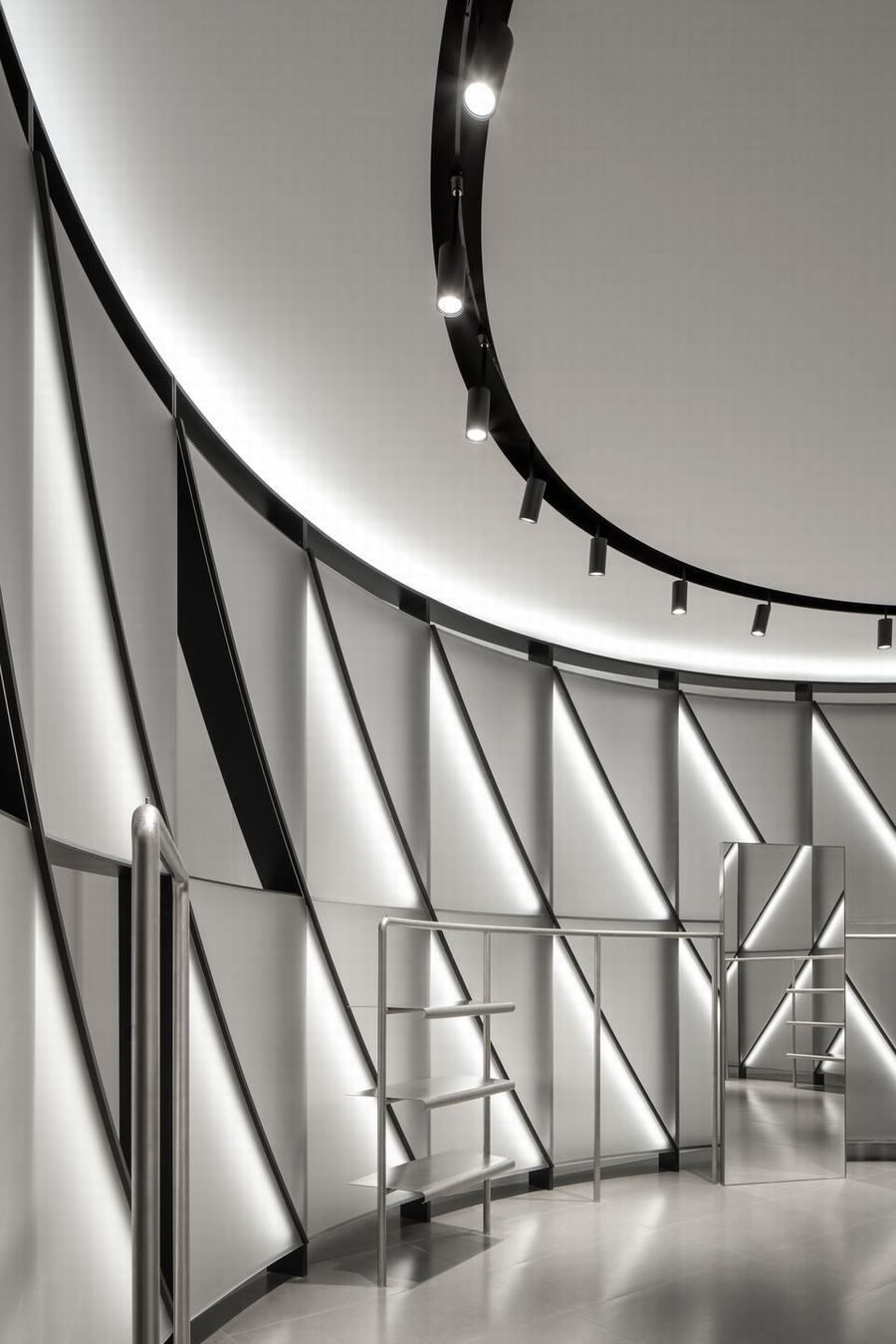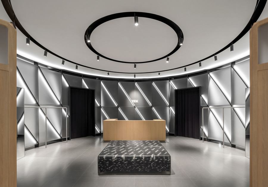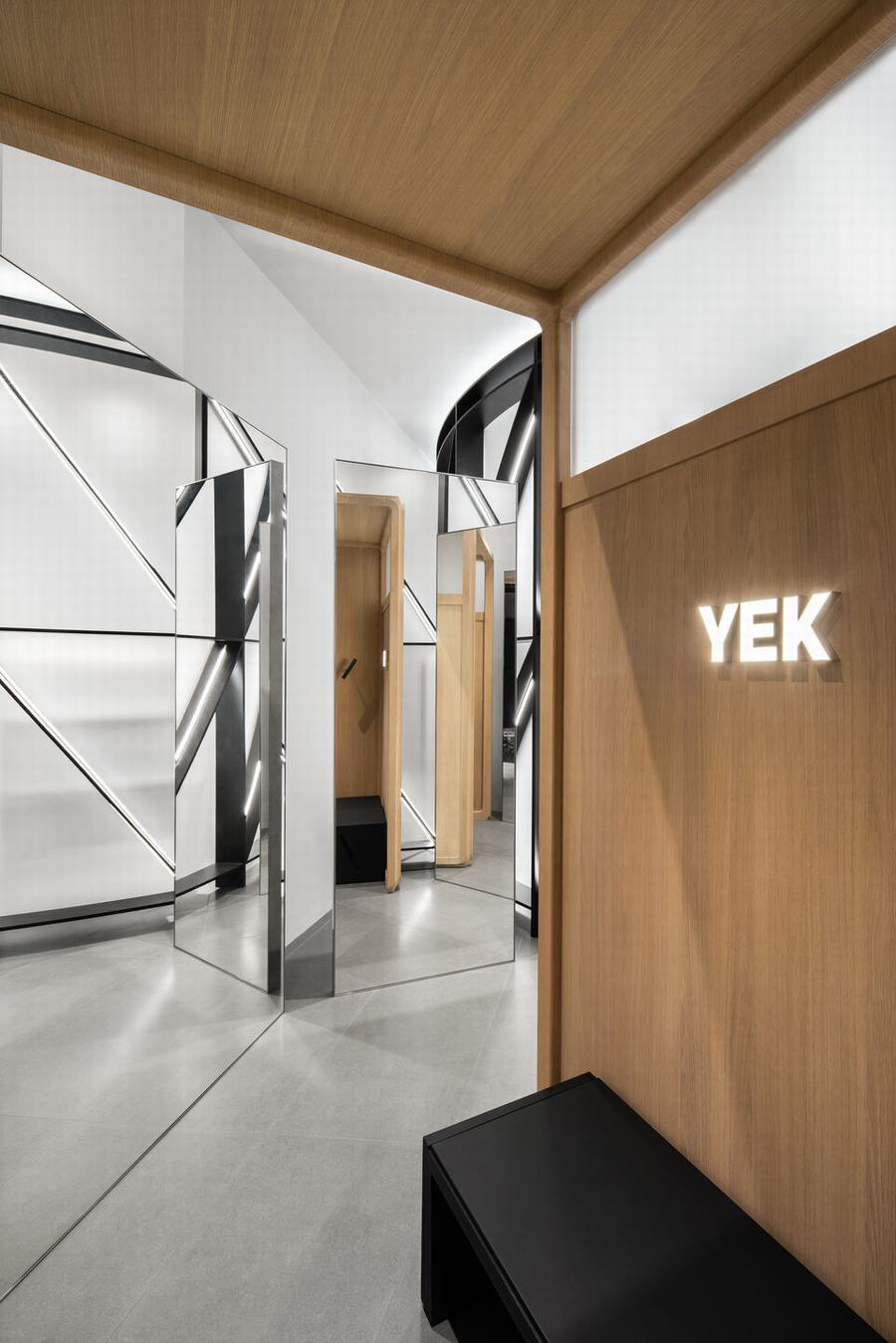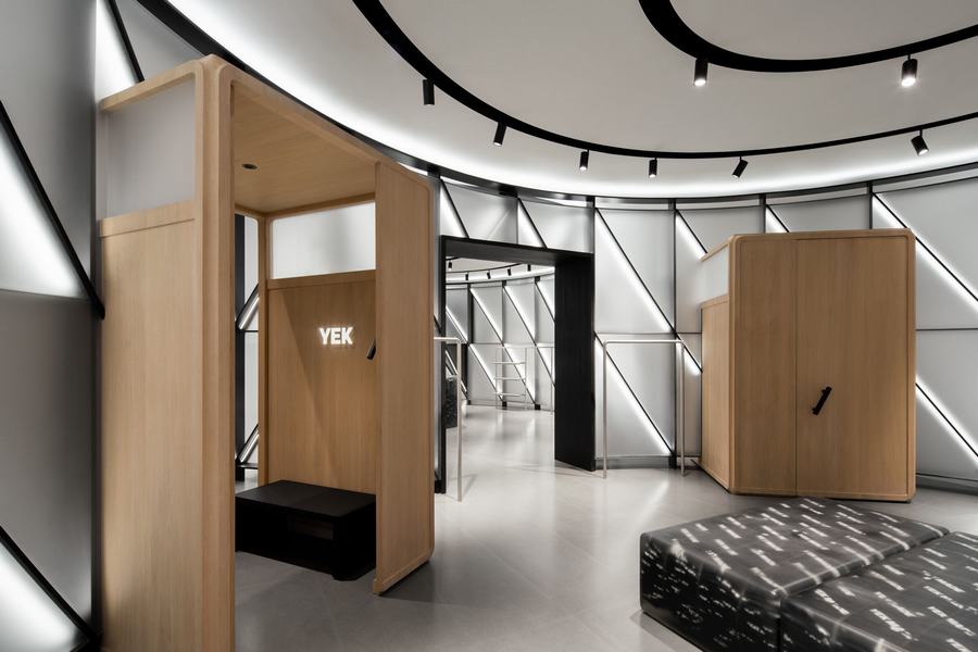 YEK的商店设计独特而富有创意,入口向内倾斜,仿佛在邀请每一位访客踏入一个神秘而充满魅力的世界。整个空间以斜线“/”为设计核心,这条斜线不仅贯穿于整个空间,还可以360°旋转,形成独特的喇叭形聚光灯。当聚光灯投射在店内的两个圆形空间时,它们被巧妙地分为“舞台”和“后台”两个区域。