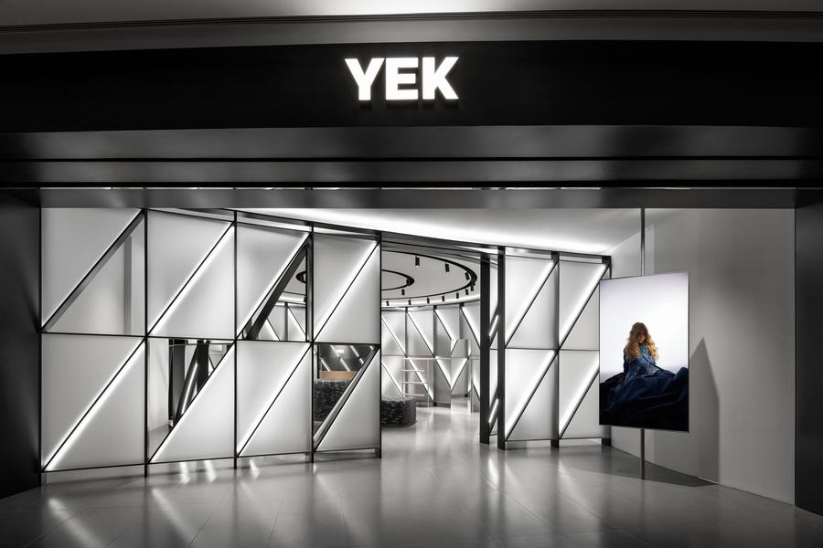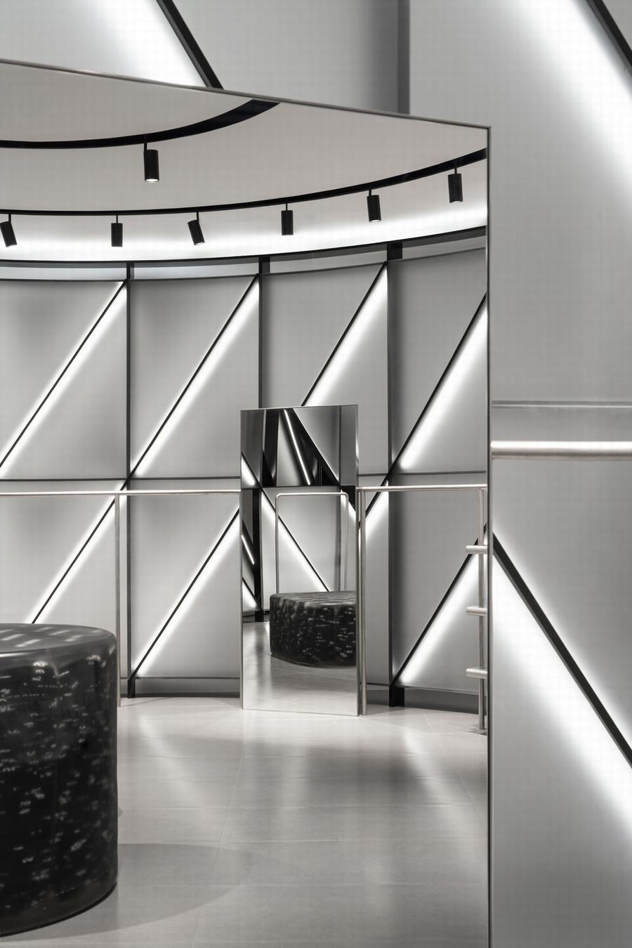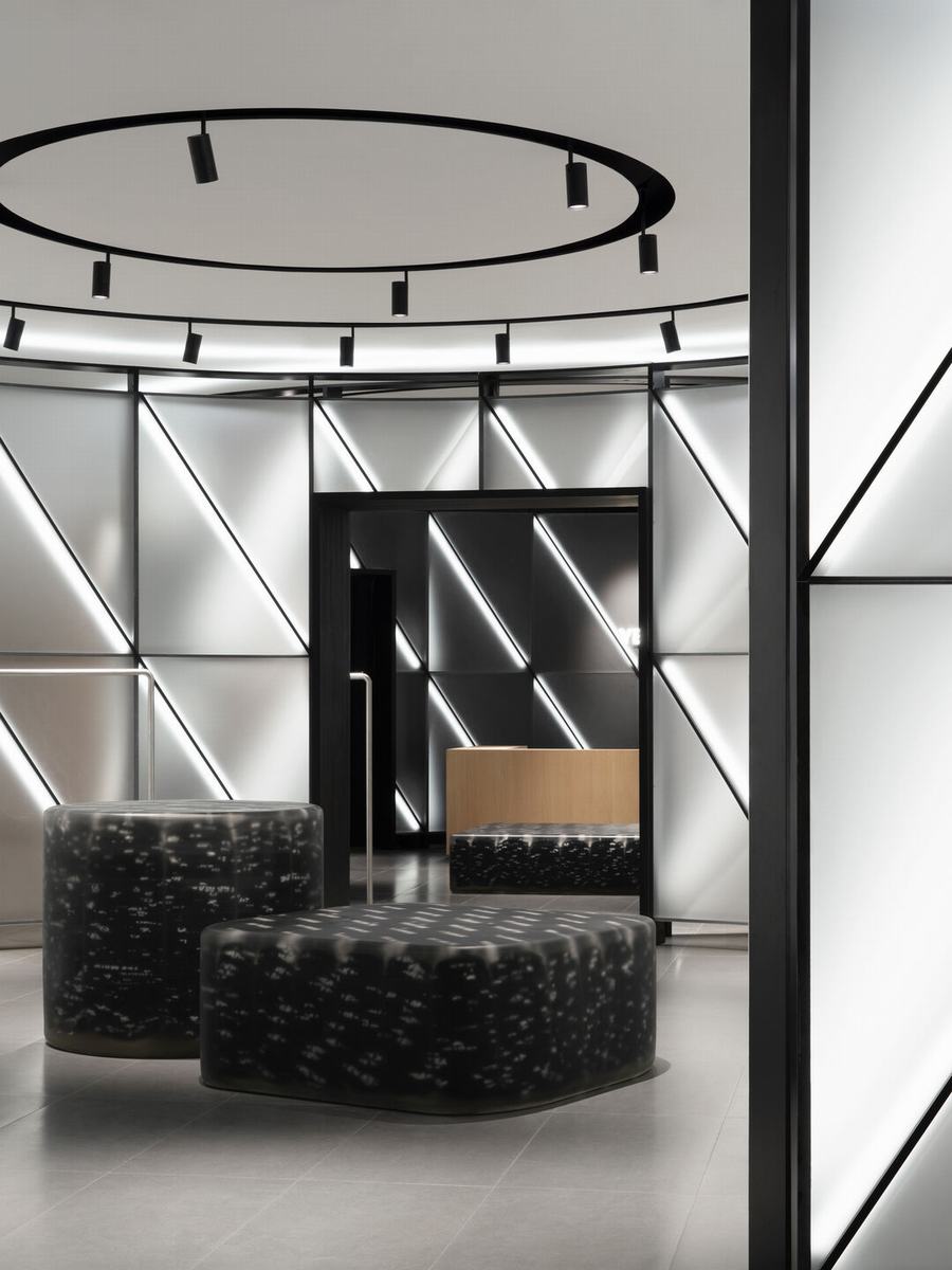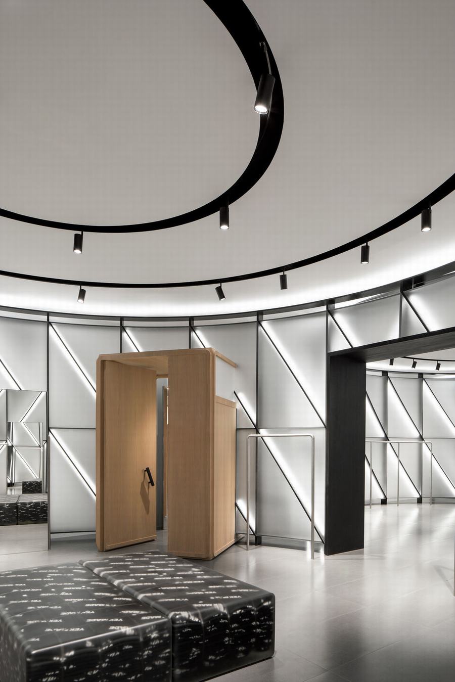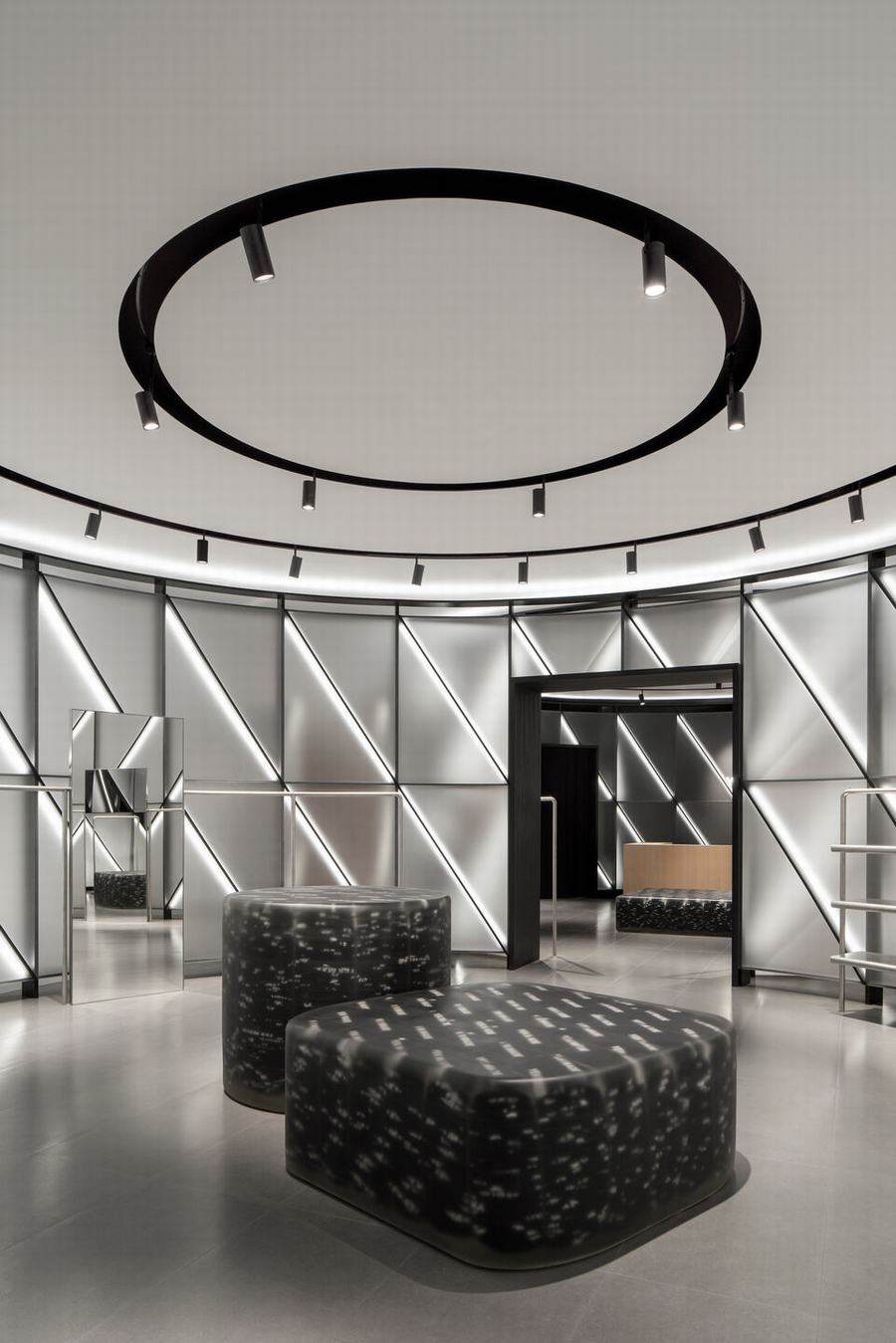YEK的商店设计独特而富有创意,入口向内倾斜,仿佛在邀请每一位访客踏入一个神秘而充满魅力的世界。整个空间以斜线“/”为设计核心,这条斜线不仅贯穿于整个空间,还可以360°旋转,形成独特的喇叭形聚光灯。当聚光灯投射在店内的两个圆形空间时,它们被巧妙地分为“舞台”和“后台”两个区域。