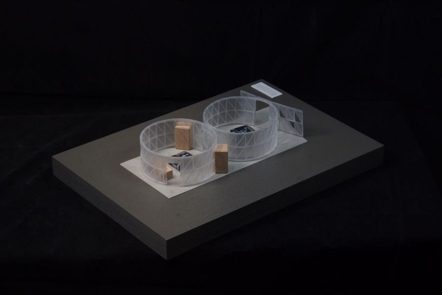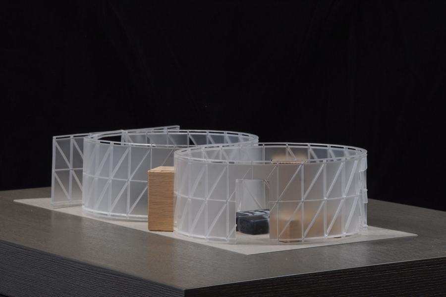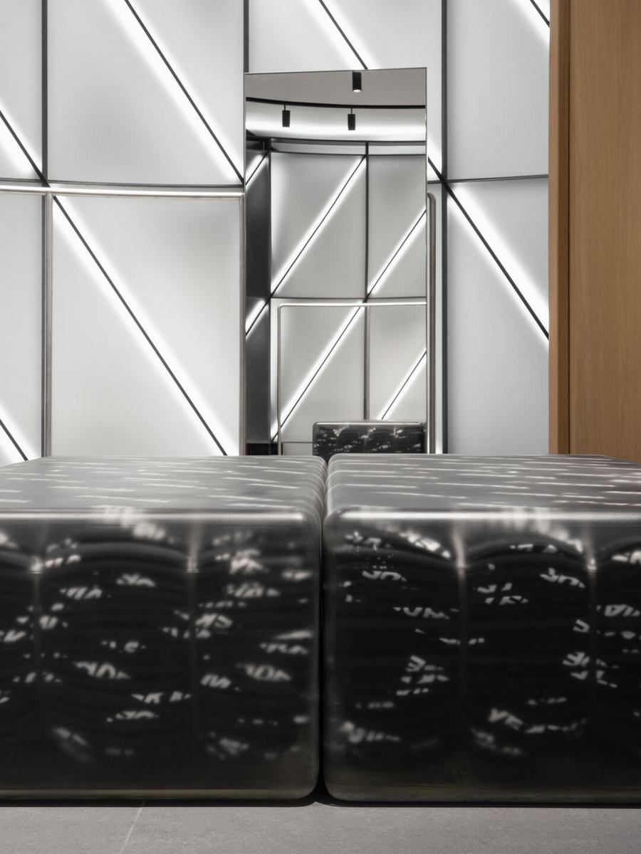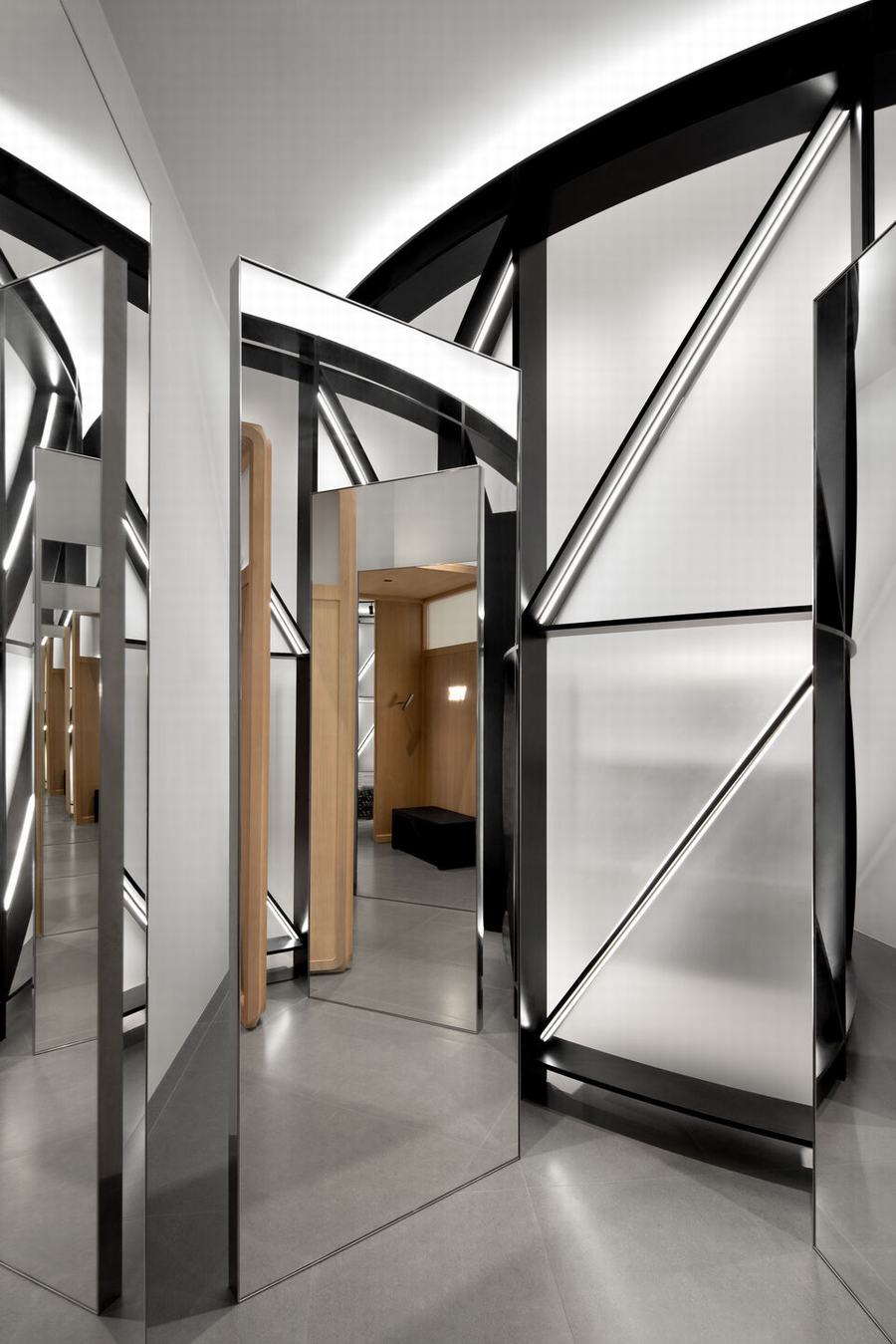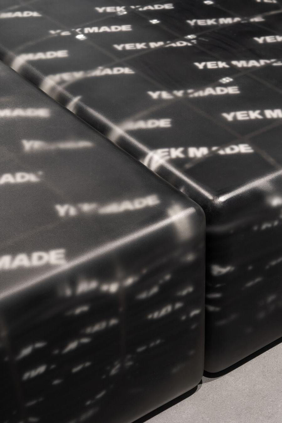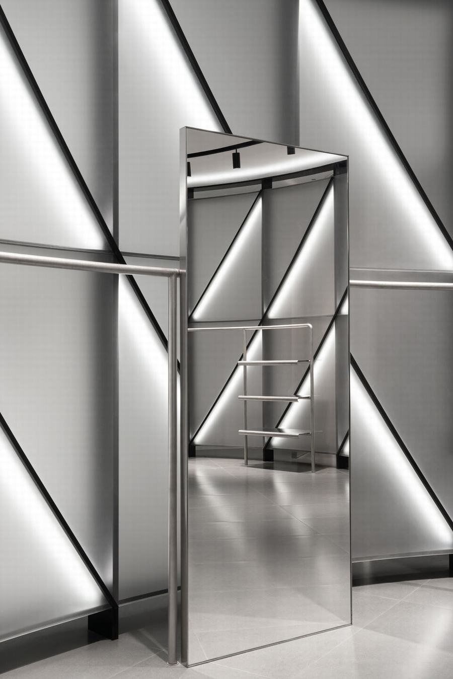 YEK的商店设计独特而富有创意,入口向内倾斜,仿佛在邀请每一位访客踏入一个神秘而充满魅力的世界。整个空间以斜线“/”为设计核心,这条斜线不仅贯穿于整个空间,还可以360°旋转,形成独特的喇叭形聚光灯。当聚光灯投射在店内的两个圆形空间时,它们被巧妙地分为“舞台”和“后台”两个区域。