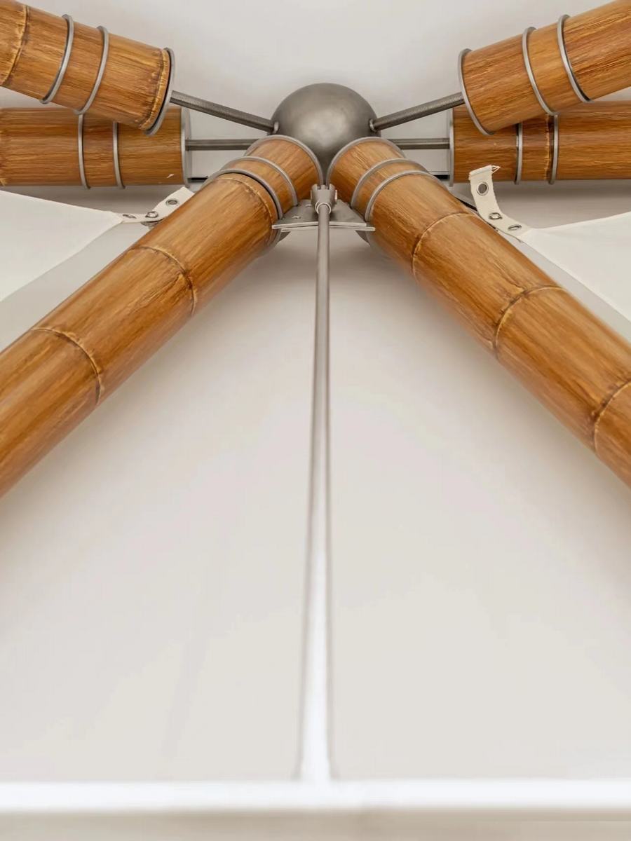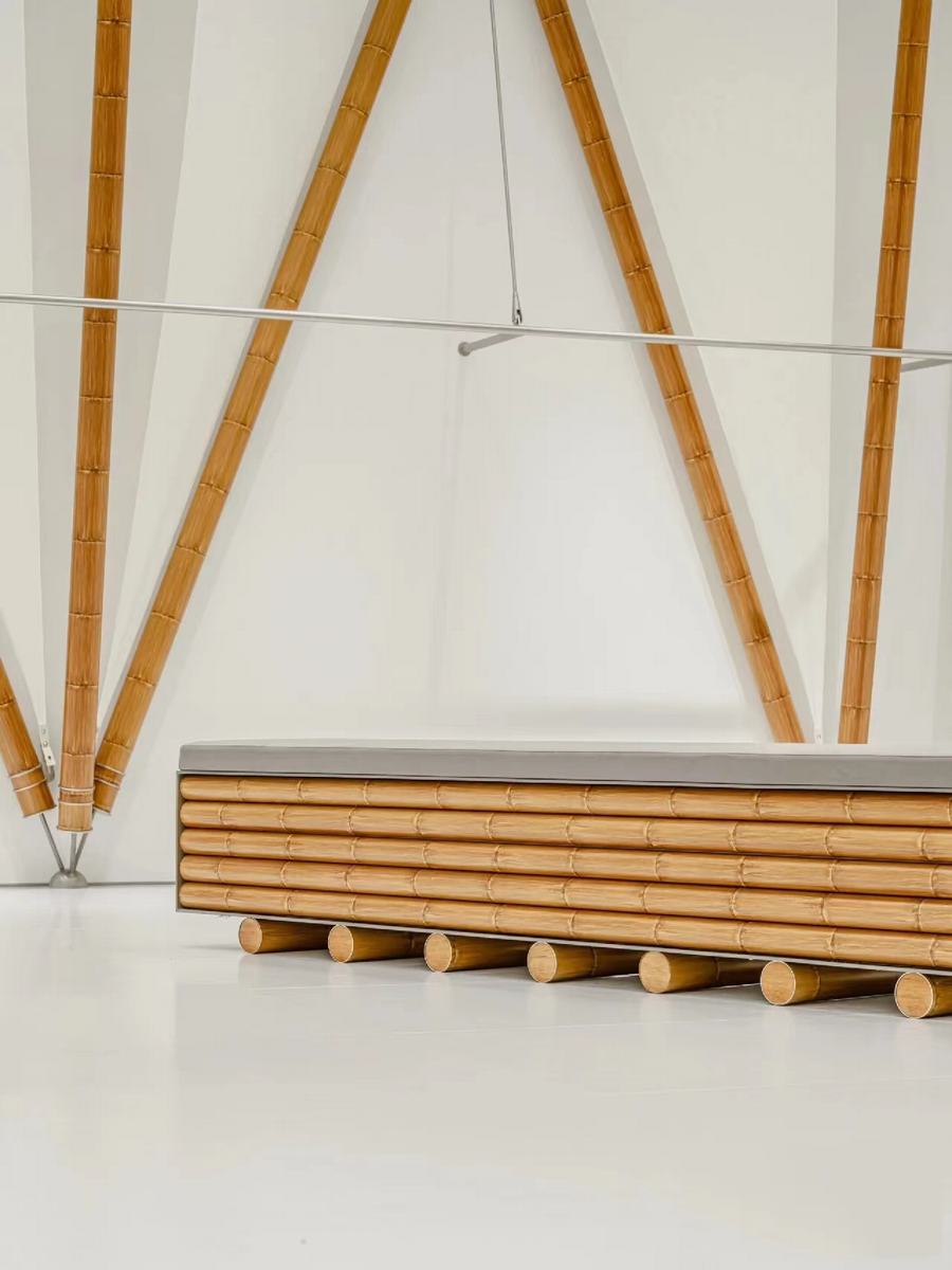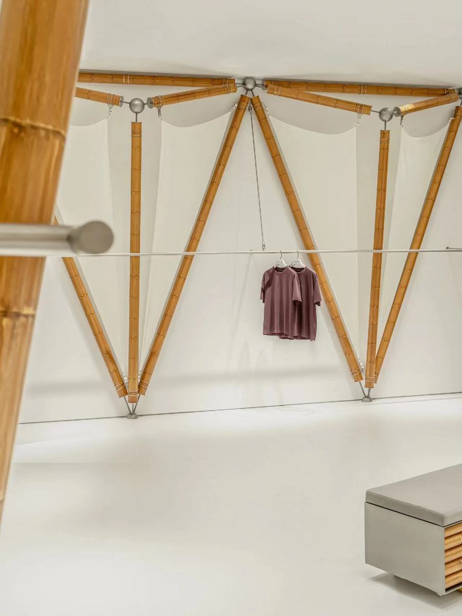 走进店内,仿佛置身于一幅流动的画卷之中。竹子与白帆布的交织,宛如江面上的竹筏和风帆,相互辉映,构成了一幅宁波特有的江海交汇的景象。竹子作为骨骼,坚韧而有力,展现了宁波人民不屈不挠的精神风貌;而白帆布则如肌肤般柔滑,寓意着宁波海港都市的开放与包容。