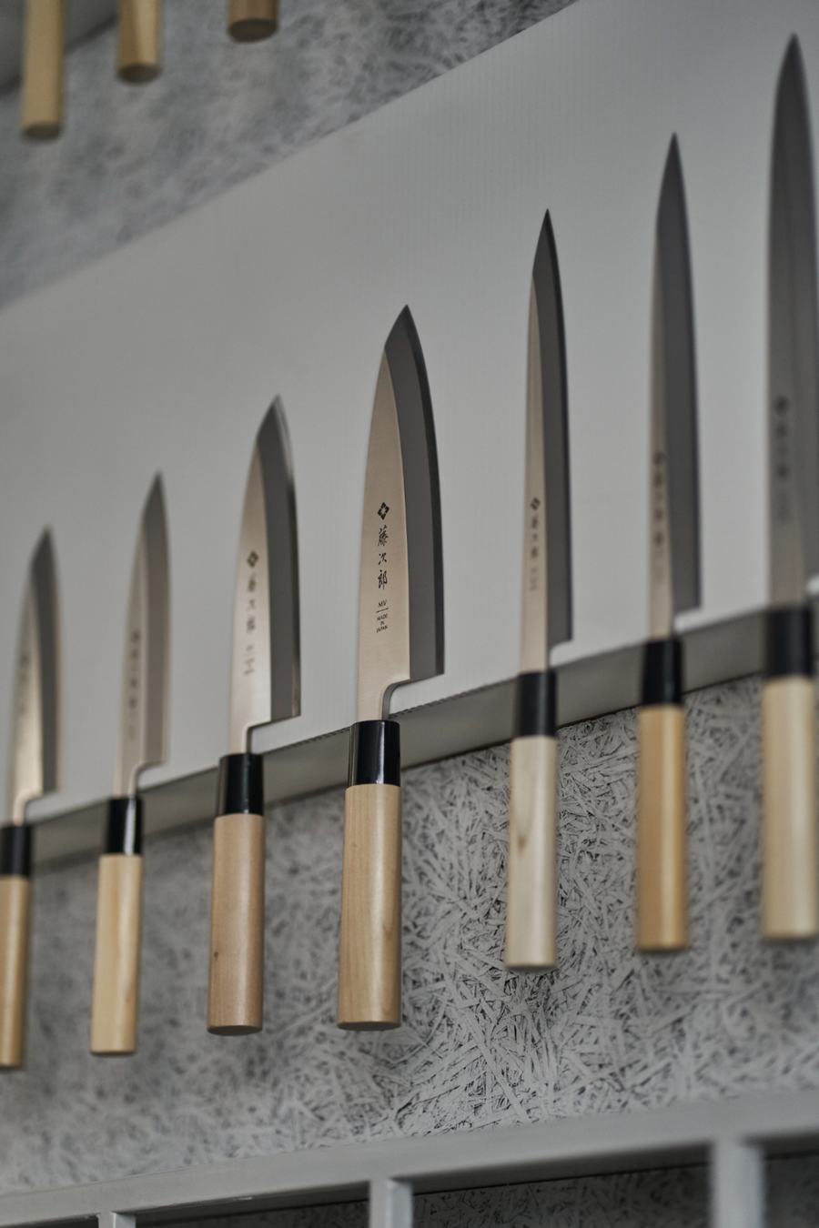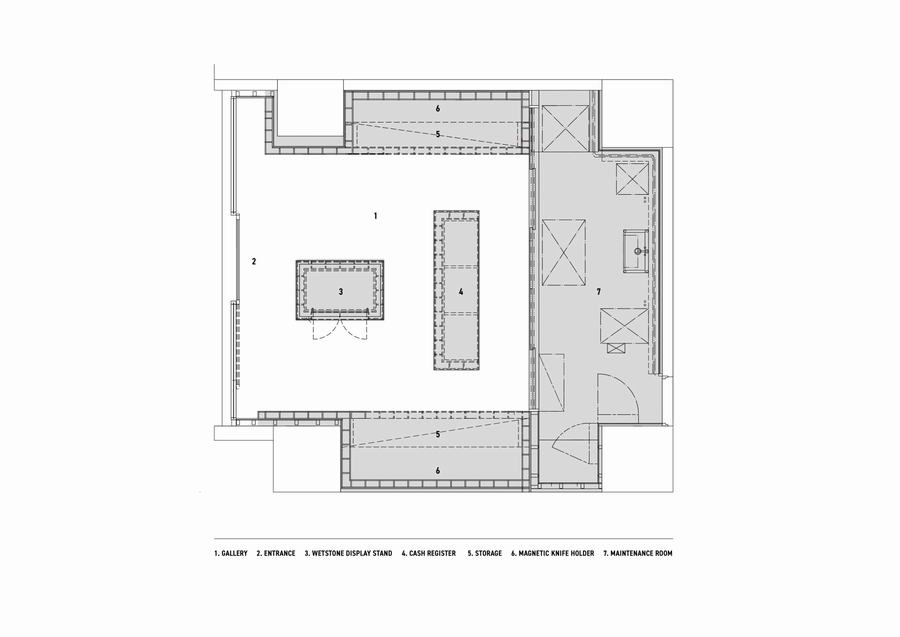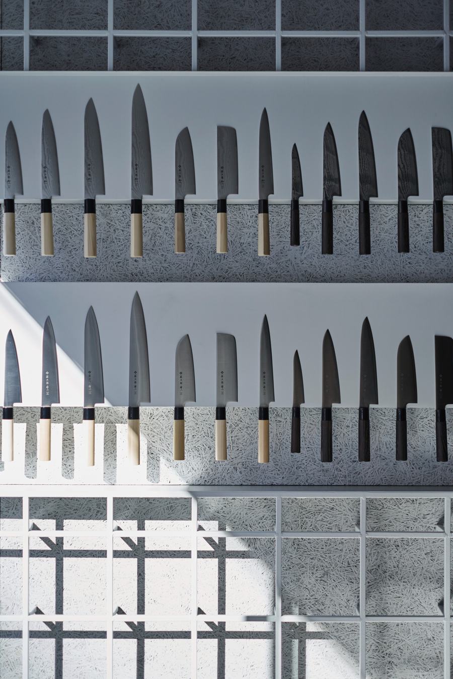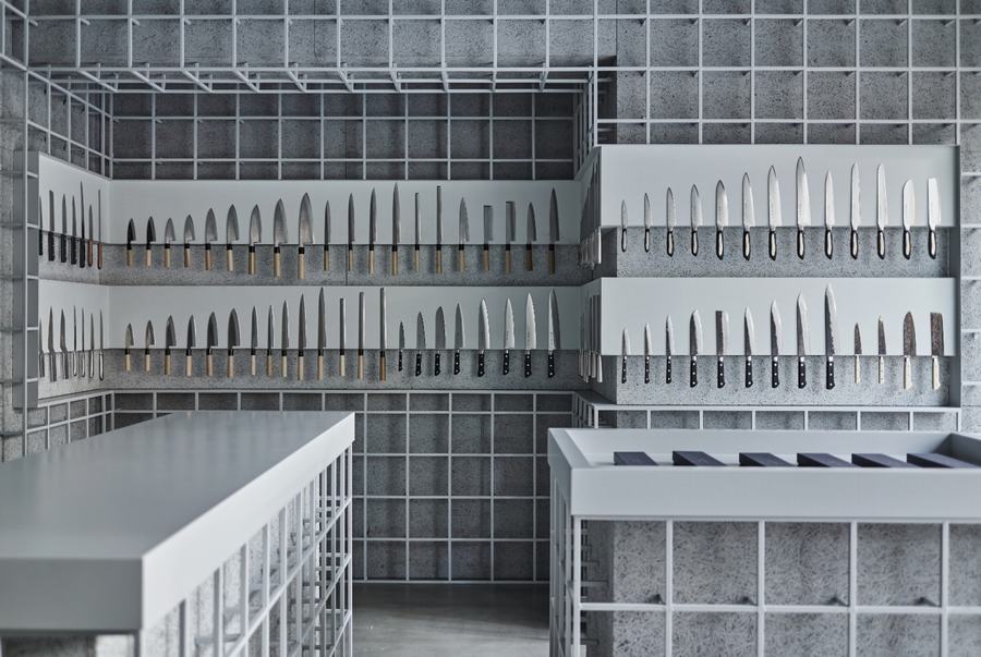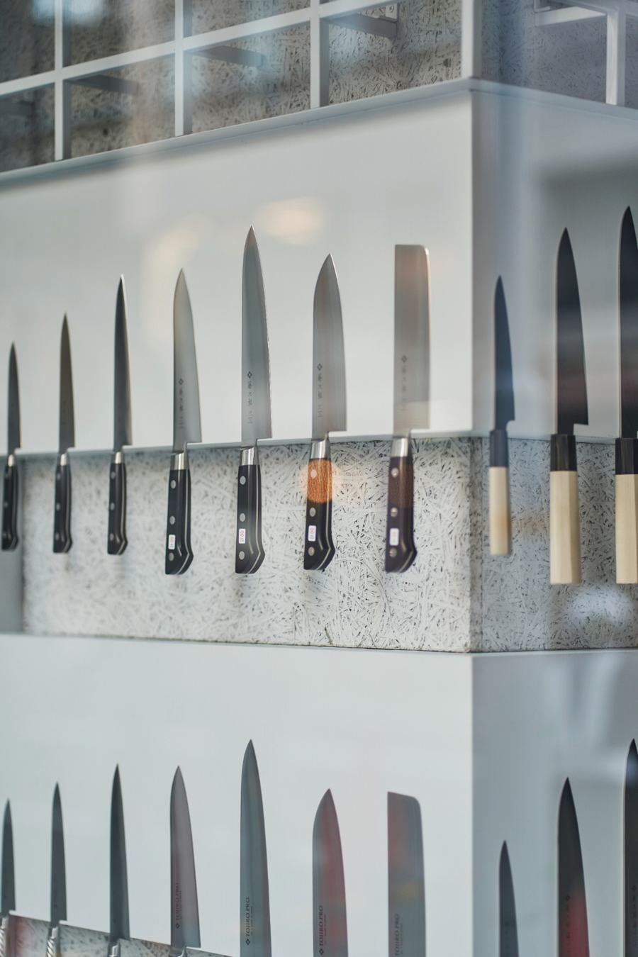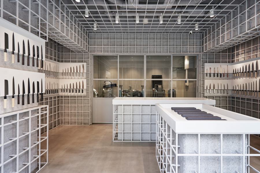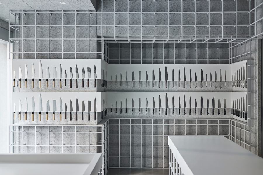 在空间设计上,店铺巧妙地运用了铁格子来构建结构。这种设计不仅确保了店铺的强度,还最大限度地利用了墙壁空间。中心区域的天花板也完全由铁格子构成,这种设计让空间显得更为宽敞,增强了用户友好性。精心规划的空间布局和直观的展示方式,使得顾客能够轻松地了解Tojiro的品牌特色和多样化的产品阵容。