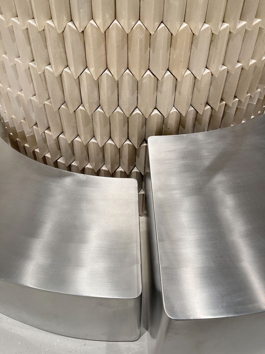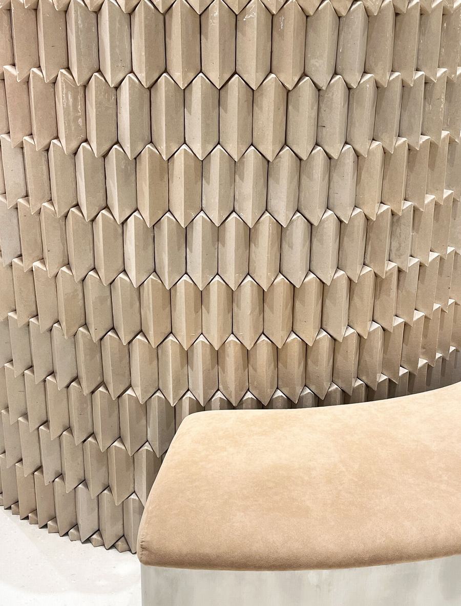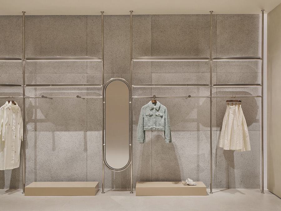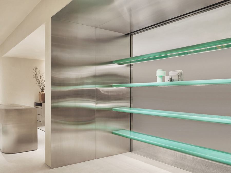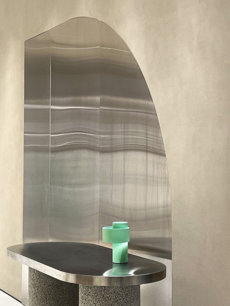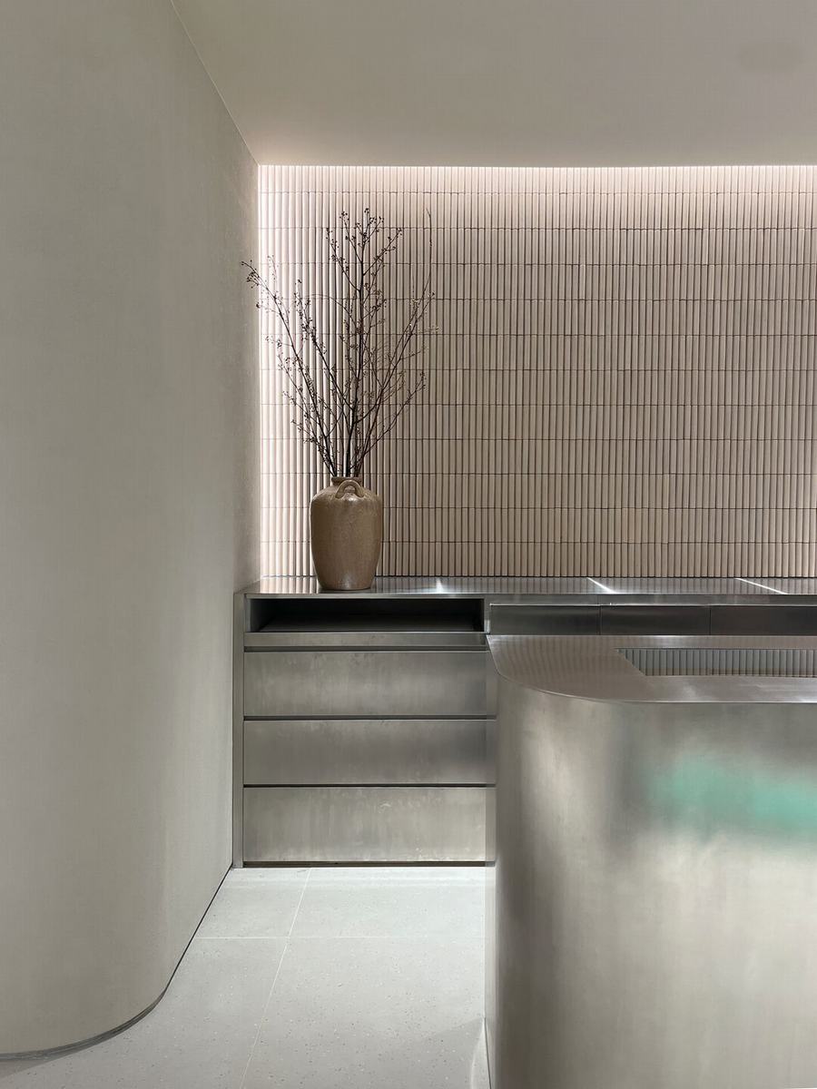 Studiopepe以其独特的设计理念而闻名,他们将Jaspal旗舰店打造成一个复杂而现代的空间,融合了金属、水泥和釉面陶瓷等中性材料。这些材料不仅赋予了空间独特的触感和质感,还创造出充满活力的基调。与此同时,意大利设计对70年代/80年代的影响也在整个店铺中体现出来,比如倒角金属家具的运用,以及中性色调的布置,如米色、裸色和绿色。