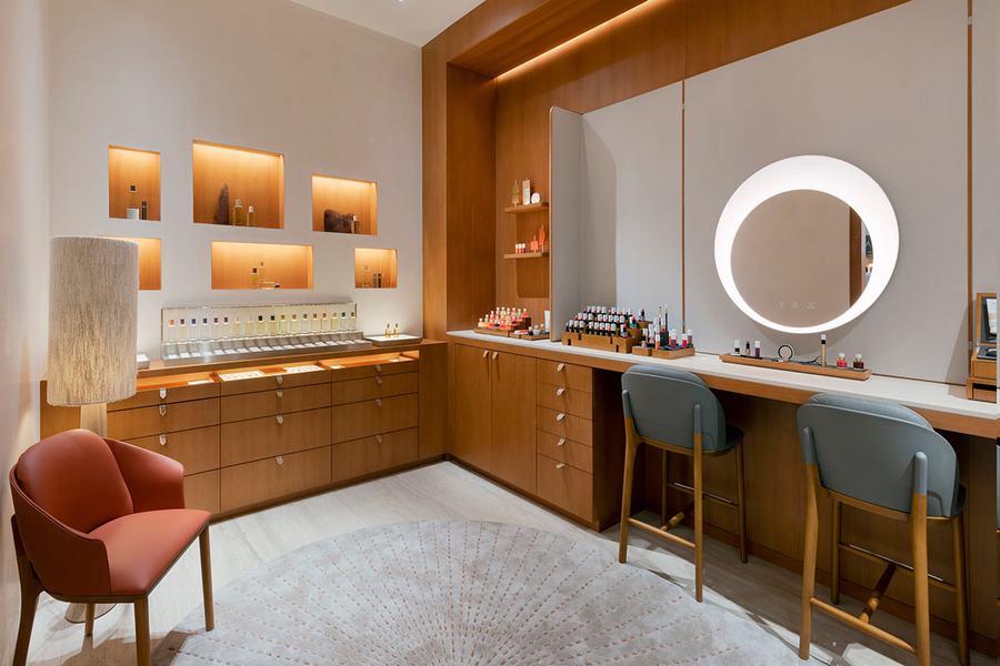 进入店内,你会被明亮的清晰度所吸引。沙色的墙壁与定制的橱柜相得益彰,展示着爱马仕的香水系列、美容用品以及其他精品。无论是Hermessence系列、Art de Vivre系列还是H24 Herbes Vives和Tutti Twilly等新品,这里都汇聚了各种精致的选择,满足不同顾客的需求。